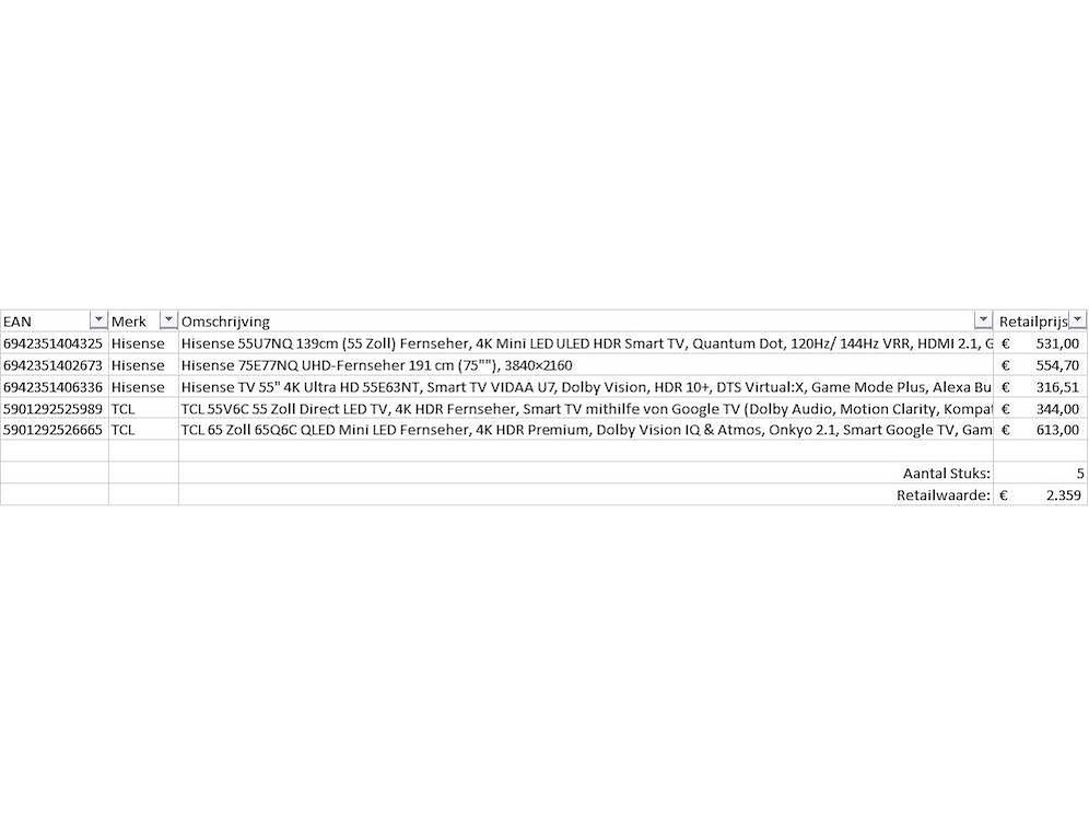 Dit betreft een partij televisies retourgoederen van een grote online retailer. De partij bestaat uit diverse diverse maten televisies. Aantal stuks: 5. Retailwaarde: €2359,- De televisies zijn niet werkend en zijn te gebruiken voor onderdelen. Kom op de kijkdag om te om zo een goed beeld te krijgen van de reden van retour. Zie foto's voor lijst met inhoud. Bezorgtermijn 14 dagen Merk: Pallet Retourgoederen - Televisies