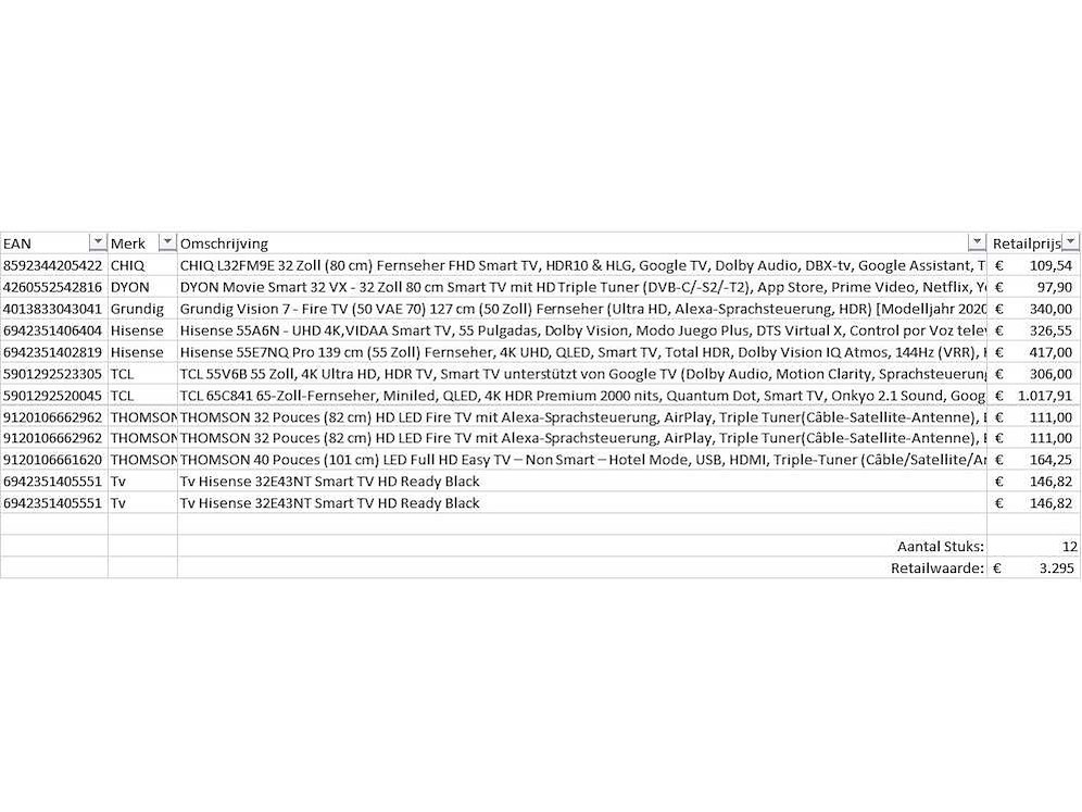 Dit betreft een partij televisies retourgoederen van een grote online retailer. De partij bestaat uit diverse diverse maten televisies. Aantal stuks: 12. Retailwaarde: €3295,- De televisies zijn niet werkend en zijn te gebruiken voor onderdelen. Kom op de kijkdag om te om zo een goed beeld te krijgen van de reden van retour. Zie foto's voor lijst met inhoud. Bezorgtermijn 14 dagen Merk: Pallet Retourgoederen - Televisies