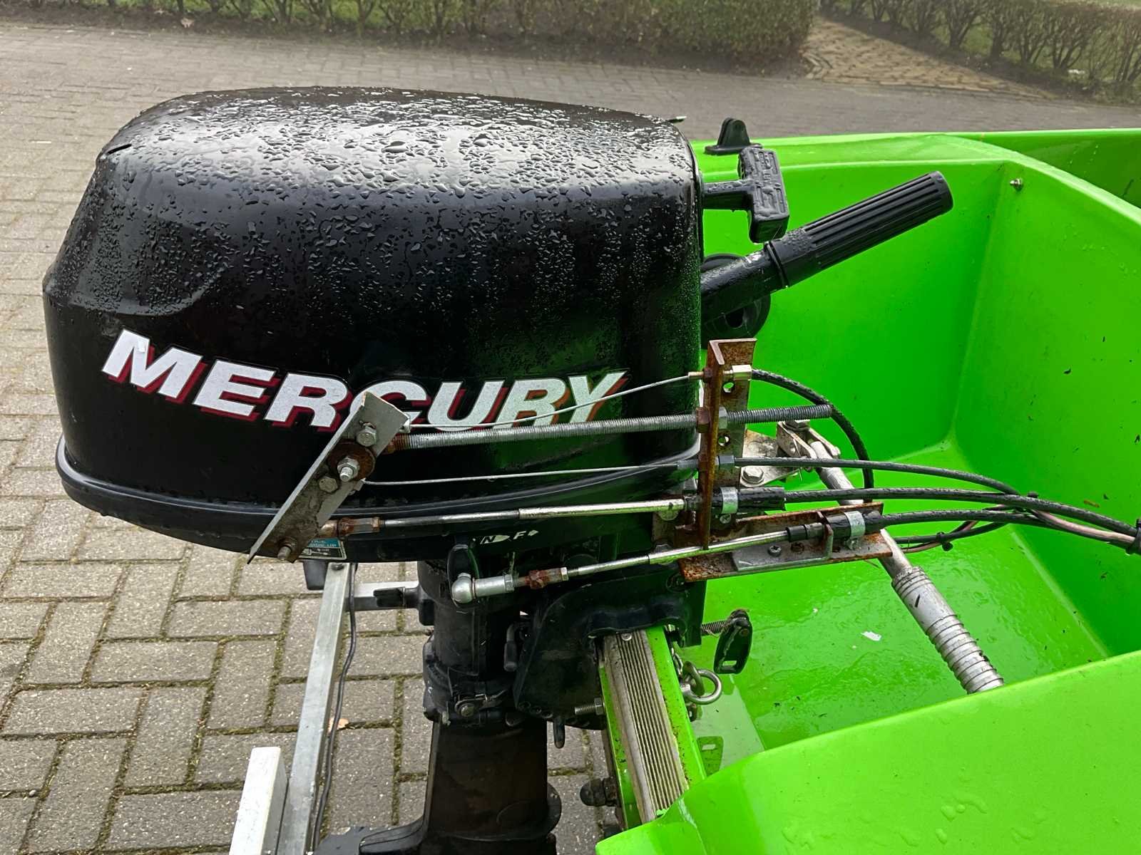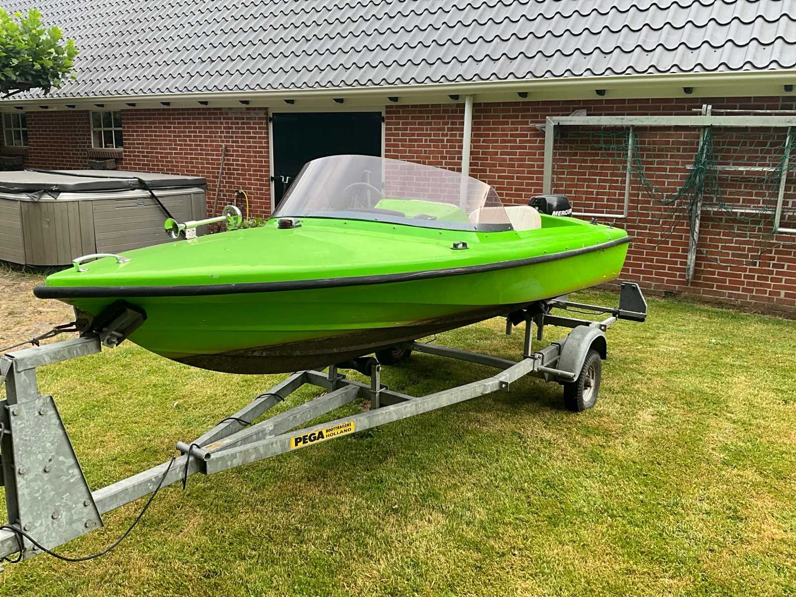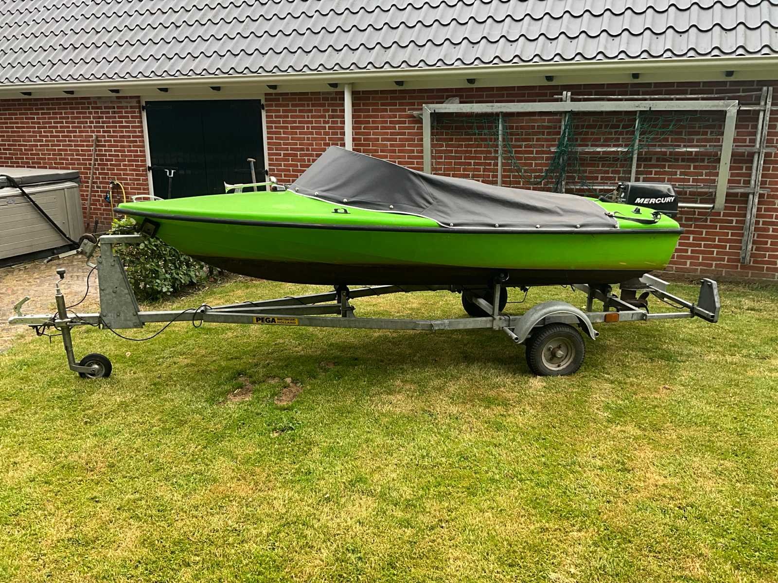 Stijlvolle groene boot met 2 zitplaatsen, ideaal voor recreatief varen of vissen; 5pk Mercury buitenboordmotor; met trailer: Degelijke boottrailer inbegrepen, klaar voor transport /vaarklaar; op maat gemaakt zeil voor bescherming tegen weersinvloeden; Werkende radio met 2 speakers voor muziek onderweg; Verlichting volledig functioneel, ideaal voor varen in schemer of ’s avonds; Accu inbegrepen, zodat alles direct klaar is voor gebruik; reddingsvest brandblusser vaarklaar Deze boot staat op een trailer en kan achter een auto gekoppeld worden. Na de sluiting van de veiling wordt er contact met u opgenomen om een afspraak te maken voor het afhalen. Merk: Speedboot Type: Pega boottrailer + 5 pk mercury Rompmateriaal: Polyester Brandstof: Benzine Breedte formaat: 1500m Type motor: 5 pk mercury Trailer merk + type: Pega ELG 4.5 450 kg Chassisnummer trailer: 09210 Lengte: 3850 Breedte: 1500