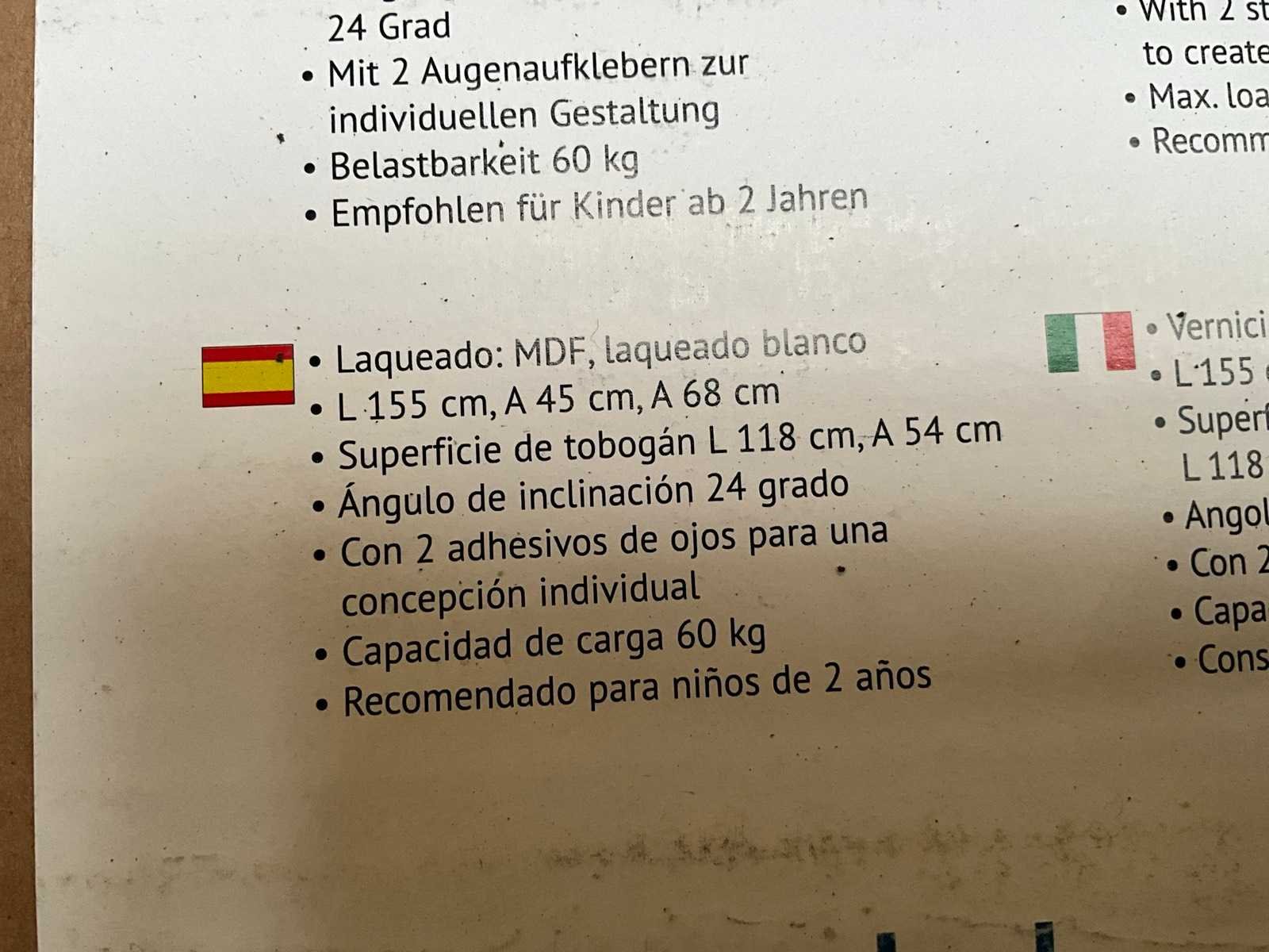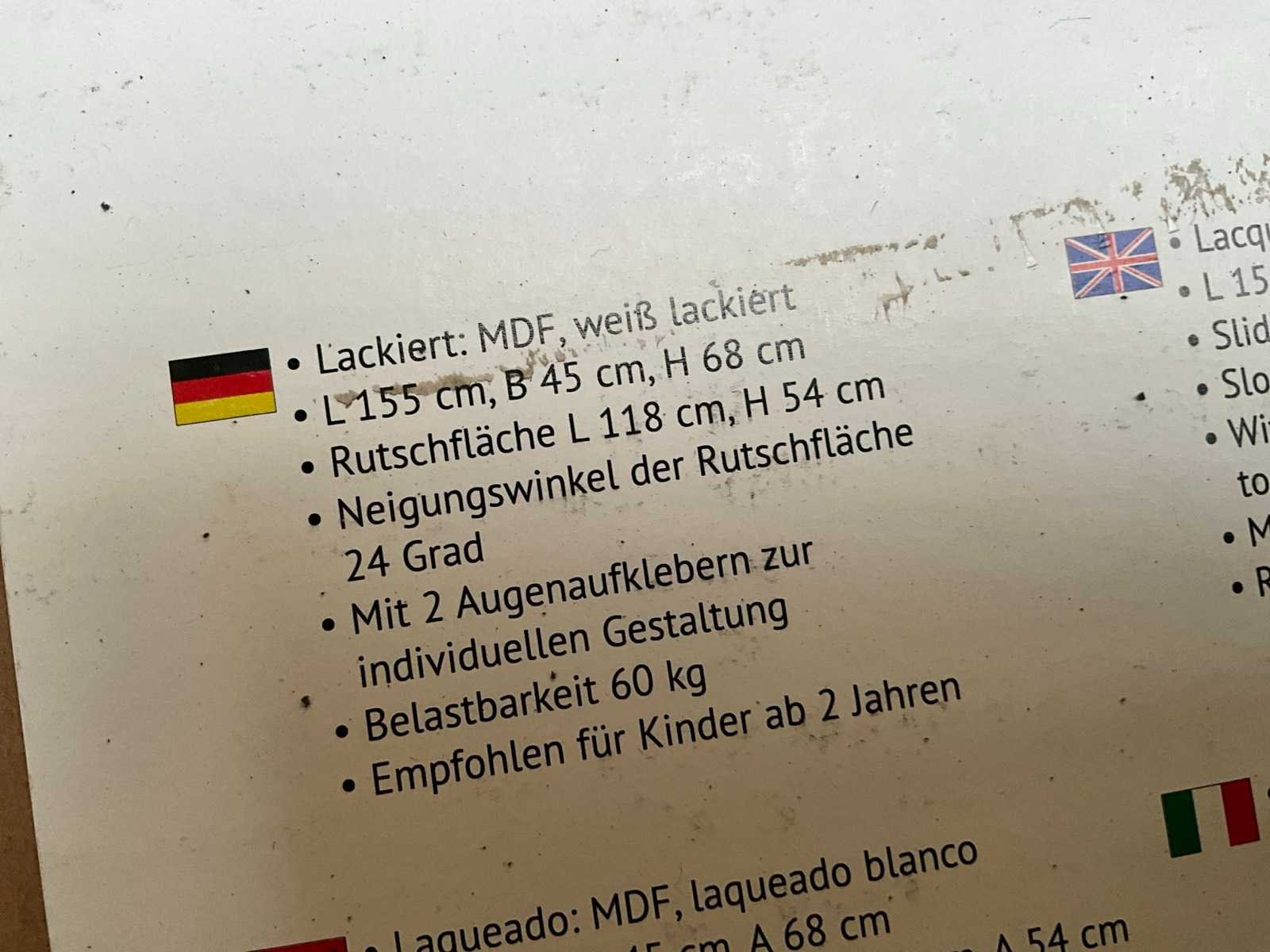 Ongebruikt; nieuw in verpakking; glijvlak 1180 mm; hellingshoek 24 graden; met 2 oogstickers voor individuele vormgeving; draagvermogen 60 kg; Merk: Pinolino Model: Kindermodel Product type: Lotta Kleur: Wit / hout Lengte: 1550 Breedte: 450 Hoogte: 680 Materiaal: Mdf wit gelakt