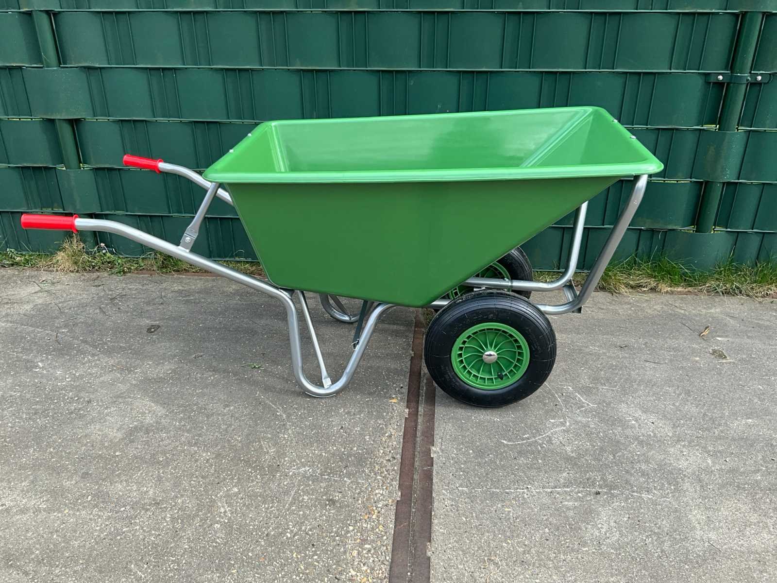 Stevige kruiwagen met grote 160 liter bak en dubbel wiel voor extra stabiliteit; Verzinkt frame; Kunststof wielen met rollager en luchtbanden; 4.80/4.00-8; nylon tube; max inflation 2.0 bar maz snelheid 20 KM/H; Extra stevige kunststof bak; De maximum laadcapaciteit is 200 kg; Geleverd als bouwpakket zie laatste foto's Merk: HH Model: Poly 160 liter 2 wielen Kleur: Groen Gewicht: 18kg Lengte: 165cm Breedte: 71cm Hoogte: 80cm Materiaal: Kunststof / metaal