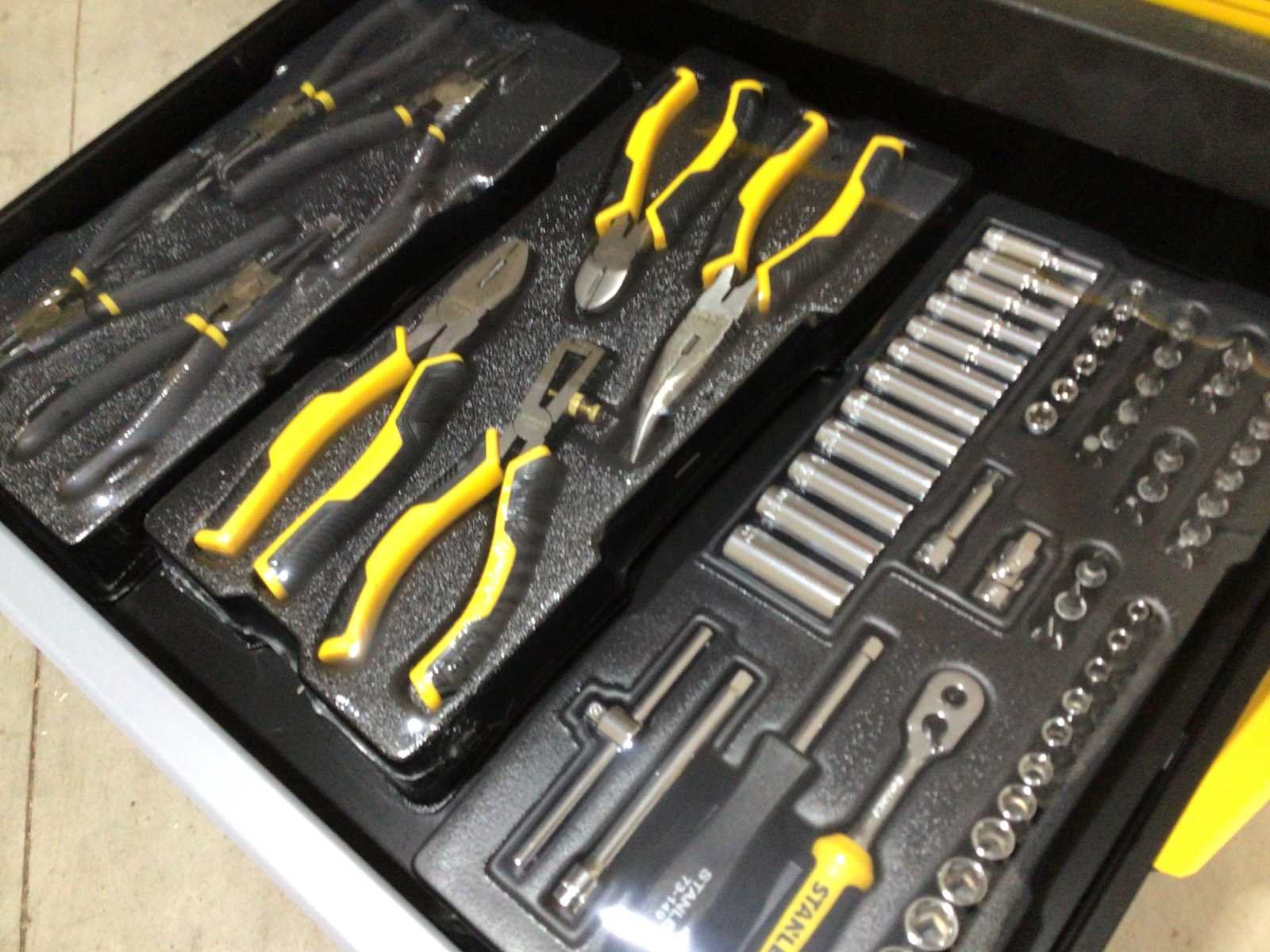 Ongebruikt; Stanley STHT6-80827 werkplaatswagen is een compleet gevulde gereedschapswagen met 7 lades; standaard worden onder andere diverse maten doppen, bits en steeksleutels, maar ook een verscheidenheid aan tangen en schroevendraaiers meegeleverd; de gereedschapswagen heeft een totale belastbaarheid van 300 kg en iedere lade is tot 20 kg belastbaar. Merk: Stanley Model: STHT6-80827 Type: Compleet gevulde Kleur: geel / zwart Gewicht: 61kg Lengte: 690cm Breedte: 462cm Hoogte: 900cm Materiaal: metaal