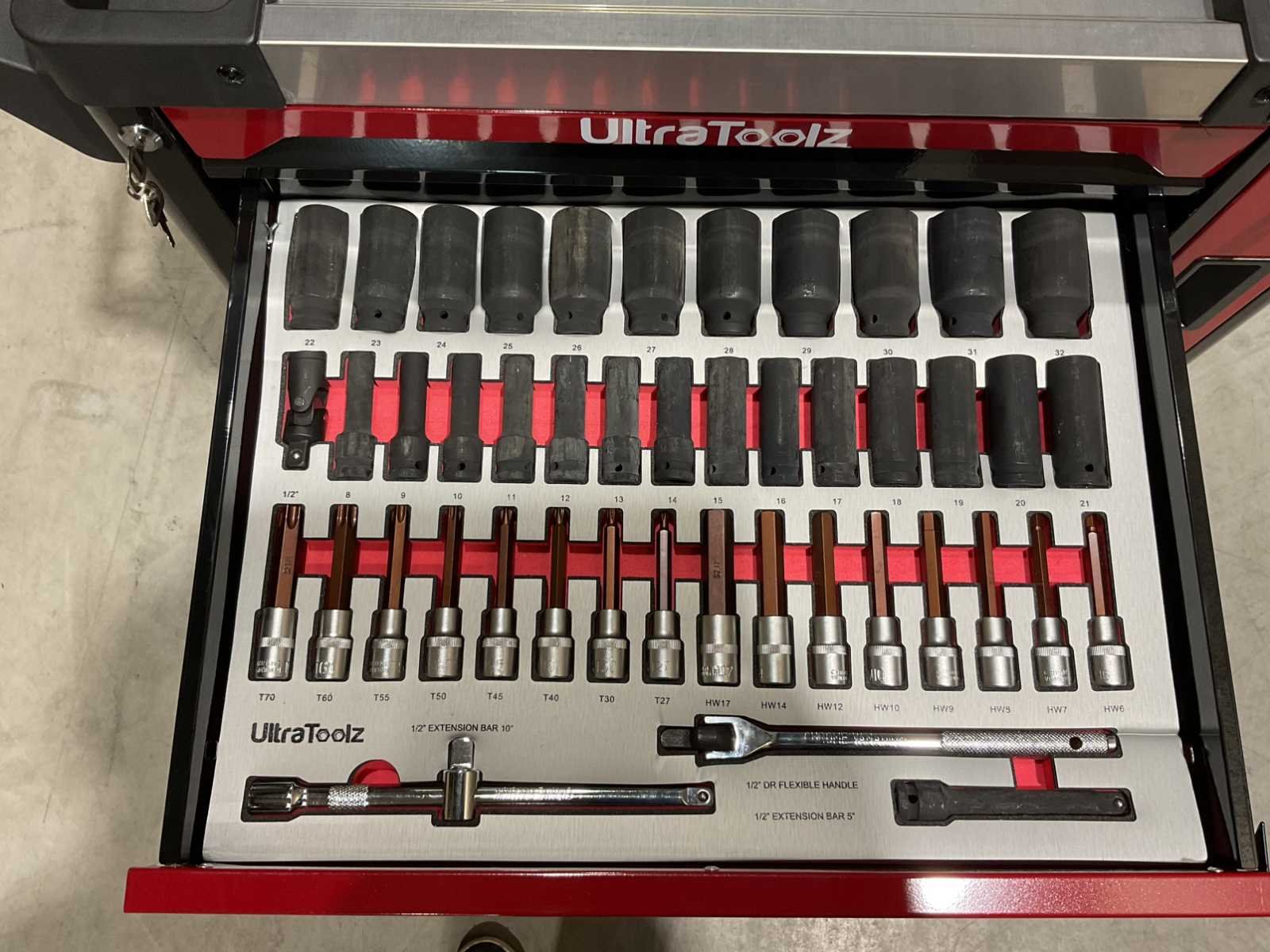 Voorzien van 7 lades waarvan 7 gevuld met gereedschap; zij lade; professioneel chroom-vanadium gereedschap; heavy duty gereedschapswagen; stevig werkblad; 4 wielen; stevig handvat; ongebruikt in doos (transport afmetingen 80x50x85 cm) Merk: UltraToolz Type: Germany 7/7 pro Bouwjaar: 2025 Aantal laden: 7 Met inhoud: true Eigen gewicht: 80kg Totale afmeting L: 800mm Totale afmeting Breedte: 500mm Totale afmeting Hoogte: 850mm