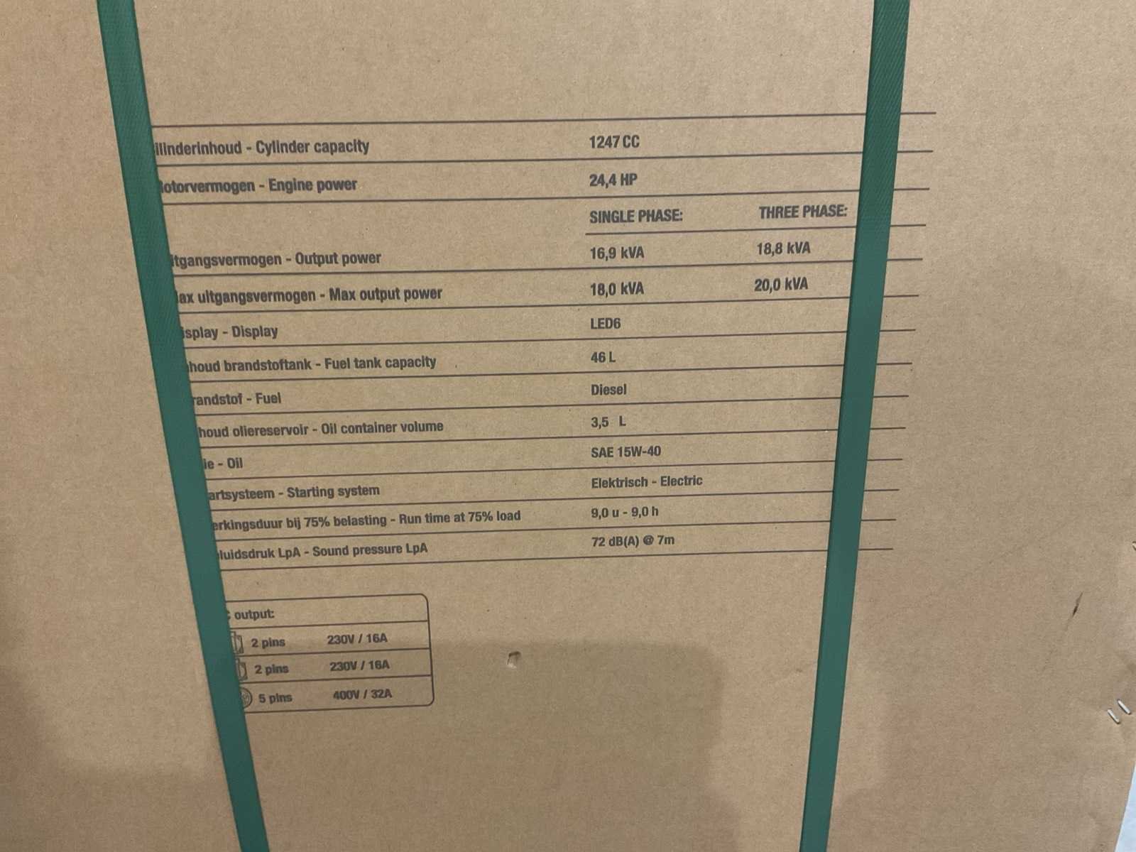Voorzien van ATS; Afstands bediening; 1247cc Dieselmotor; 24,4HP; Output single fase 16,9 kva; Output drie fase 18,8 kva; Max output single fase 18 kva; Max output drie fase 20 kva; 46 liter; olie3,5 liter; Display LED; elektrische start; werkingsduur bij 75% belasting 9 uur; geluidsdruk LpA 72dB(A) @ 7m output 2 pins 230v 16a; 5 pins 400v 32a. ongebruikt in doos (Transport afmeting; 1160x70x1125mm; Gewicht 354kg) Merk: Stahlwerk Type: SW-20KW Bouwjaar: 2025 Capaciteit.: 20kVA Diesel: true Aantal cilinders: 2 Luchtgekoeld: true Mobiel: true Handboek aanwezig: true Machinegewicht: 334kg Totale afmeting L: 1140mm Totale afmeting Breedte: 1100mm Totale afmeting Hoogte: 680mm