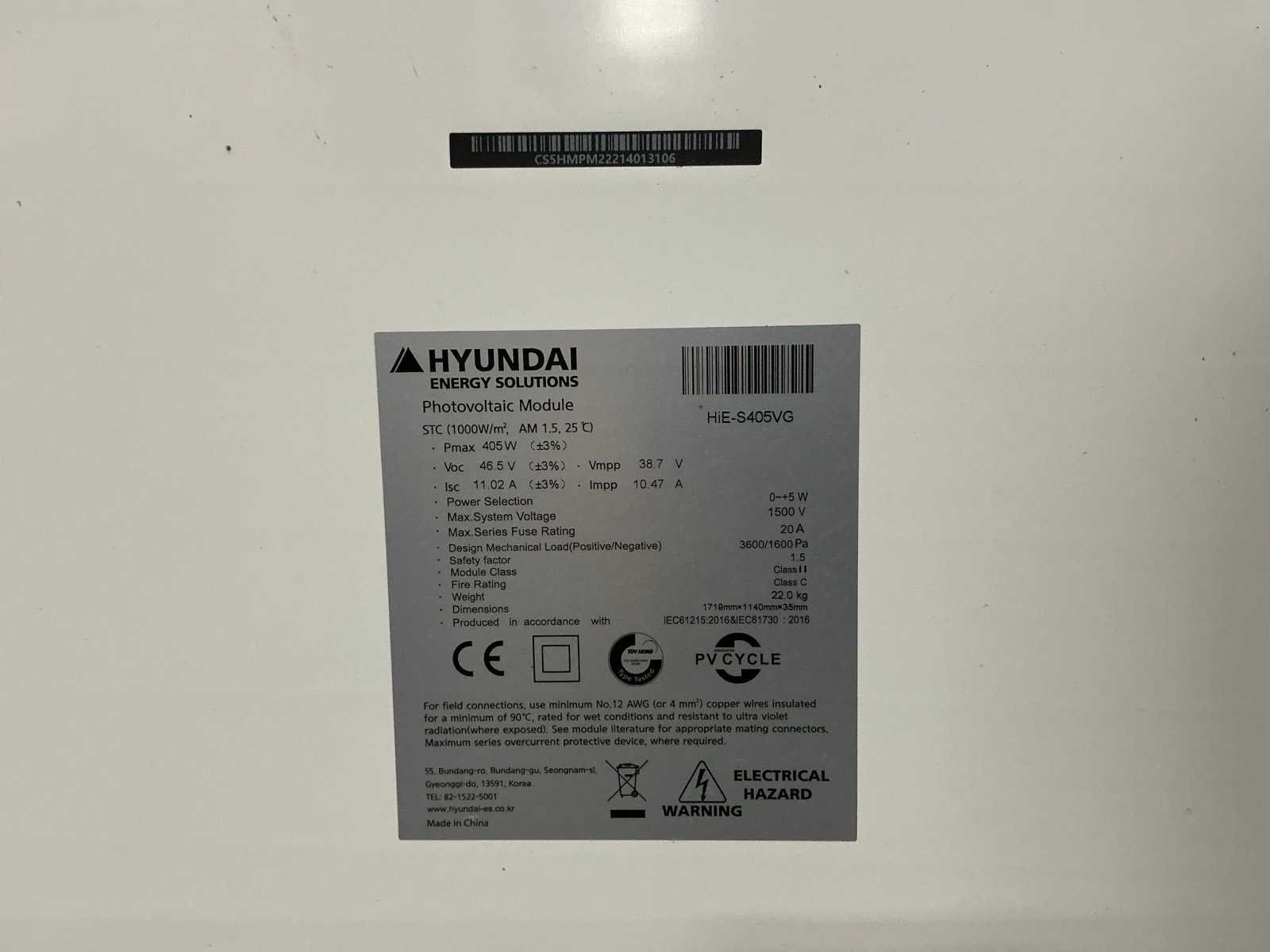 Merk: Hyundai Type: HIE-S405VG Max. dc power: 405W