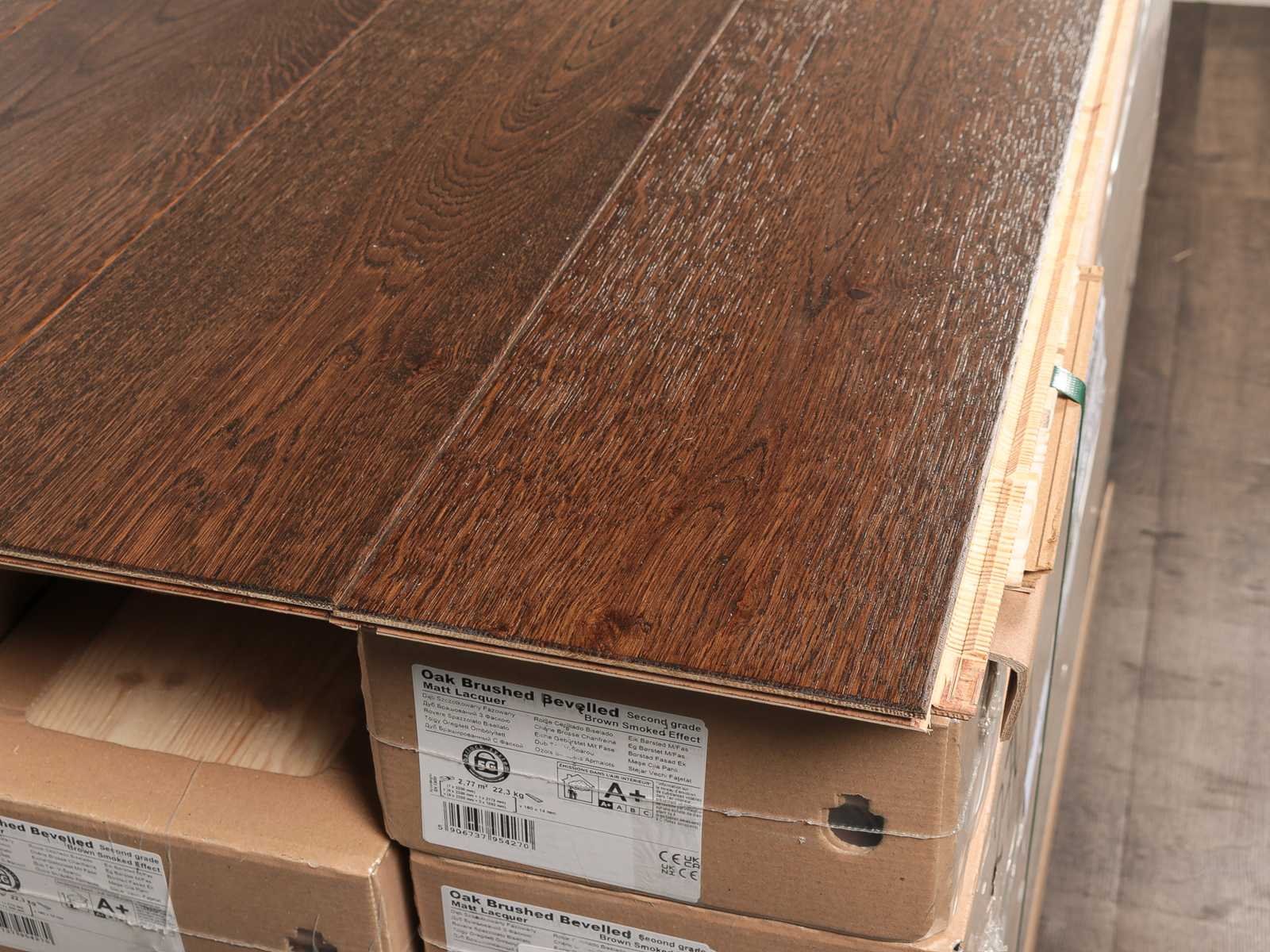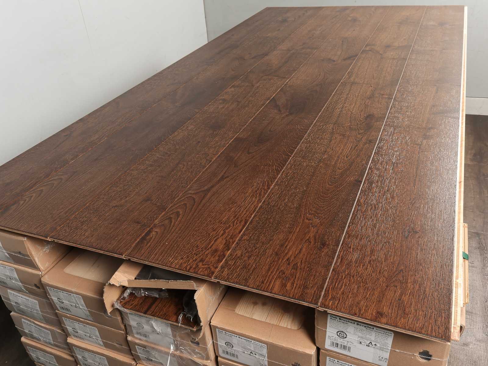 Gemakkelijk te leggen wegens 5G clicksysteem, geschikt voor alle soorten vloer en koelverwarmingen, kwaliteits parketvloer, vloer is van hoogwaardig Europees eiken hout, kant en klaar behandeld, dikte 14 mm, toplaag 3 mm, 32 pakken a 2,77 m2 Within 14 days Merk: Ambiance Product type: Parket Oppervlakte: 88m² Geschikt voor vloerverwarming: Ja V-groef: Ja Afwerking: Mat gelakt, geborsteld, met v-groef Aantal m² per verpakking: 2.77m² Kleur: Brown smoked effect 270 Gewicht: 735kg Lengte: 2200mm Breedte: 180mm Materiaal: Eiken multiplank