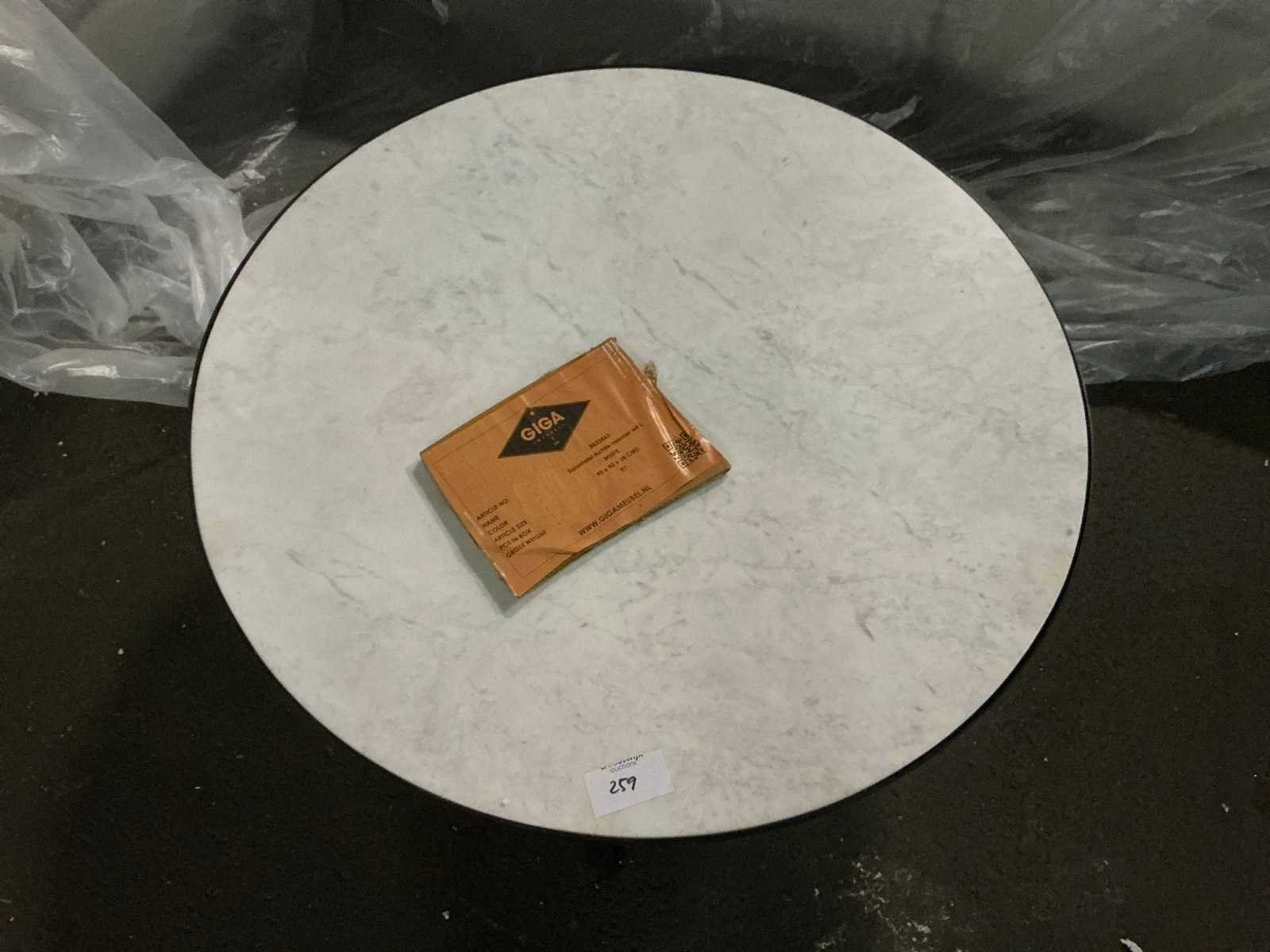 Merk: Gigameubel Model: Achile marmer Vorm: Rond Kleur: Wit Lengte: 90cm Breedte: 90cm Hoogte: 38cm Materiaal: Marmer blad op metalen poot