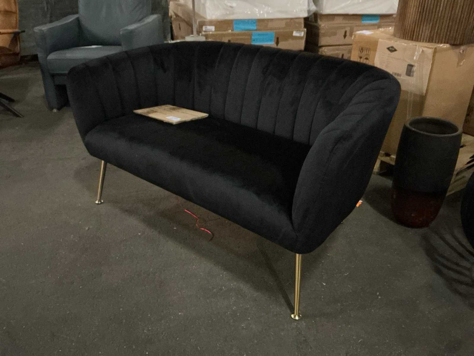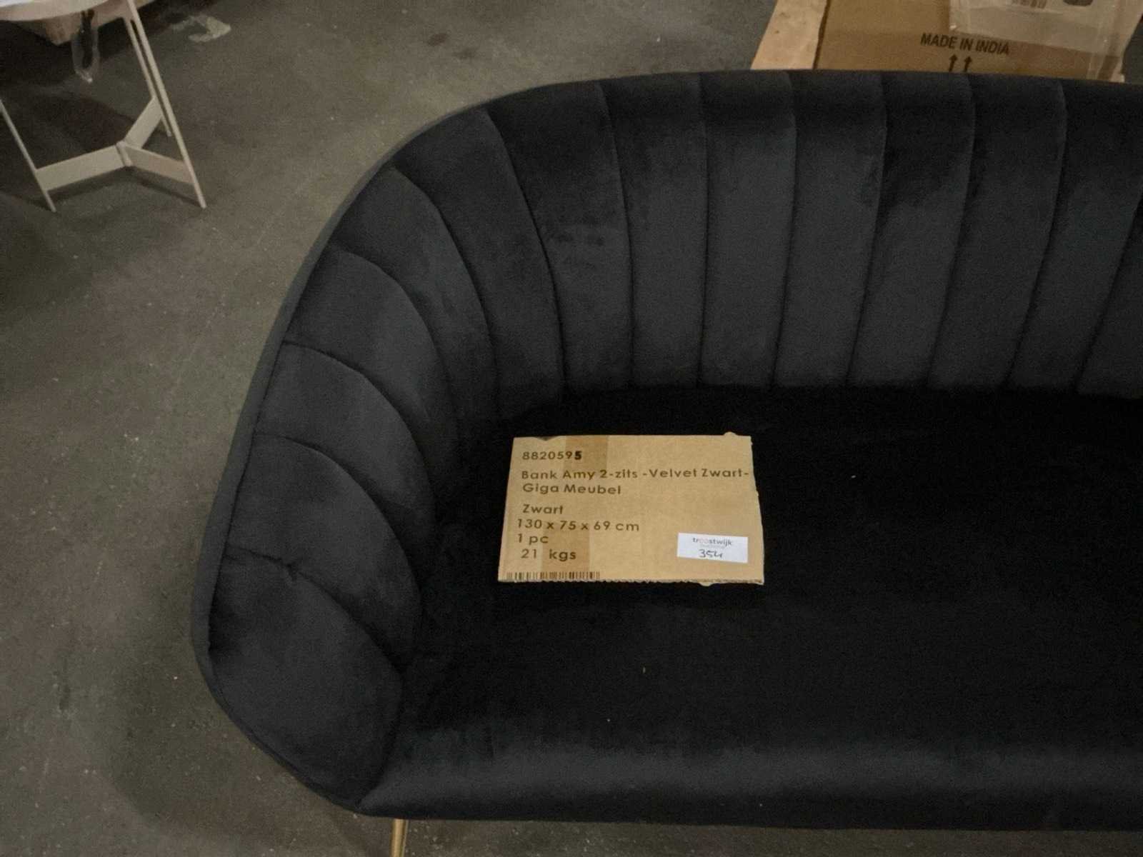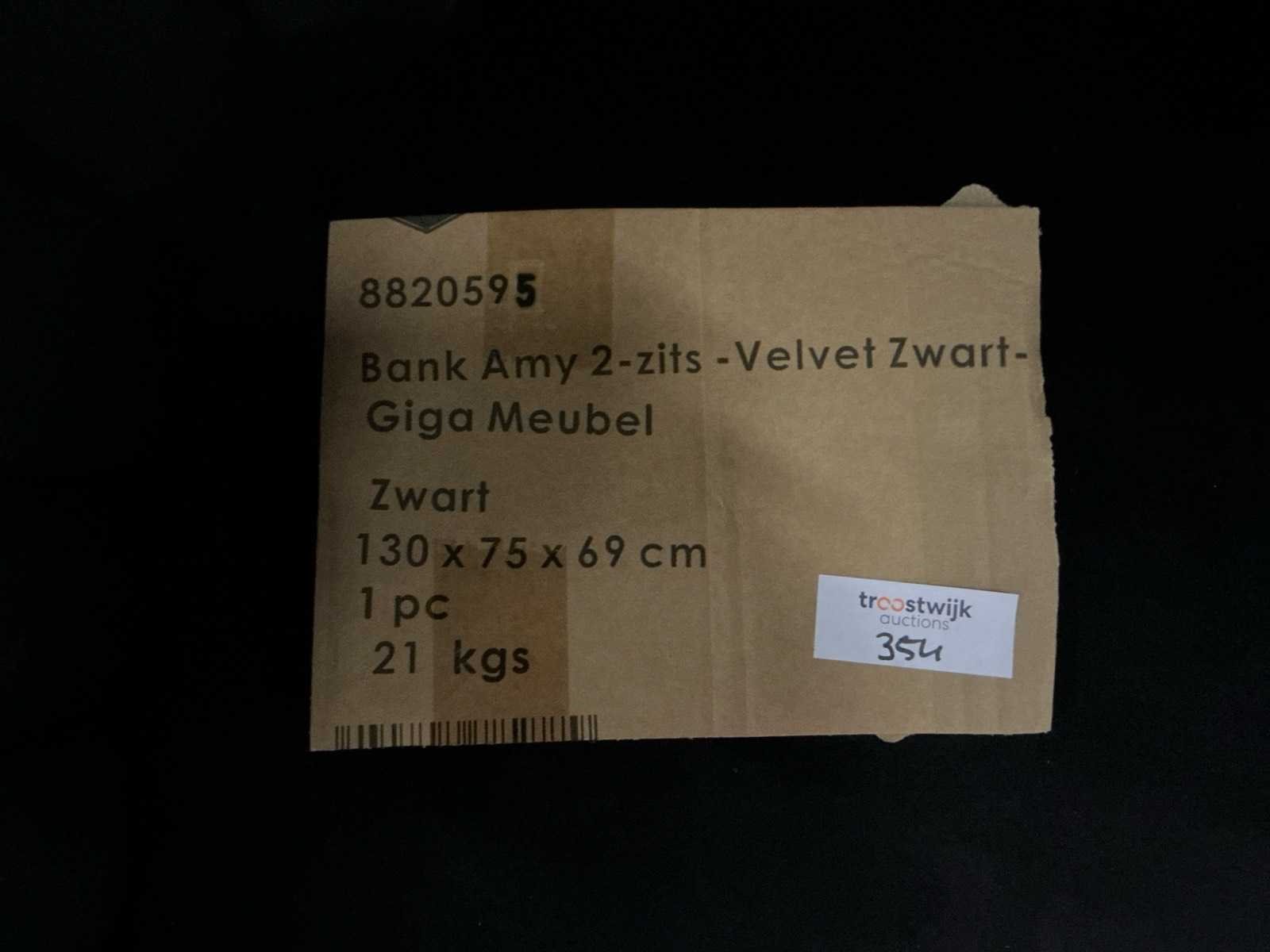 Merk: Gigameubel Model: Amy Zitplaatsen: 2 Kleur: Velvet zwart Lengte: 130cm Breedte: 75cm Hoogte: 69cm Materiaal: Velvet stoffen bekleding op metalen poot