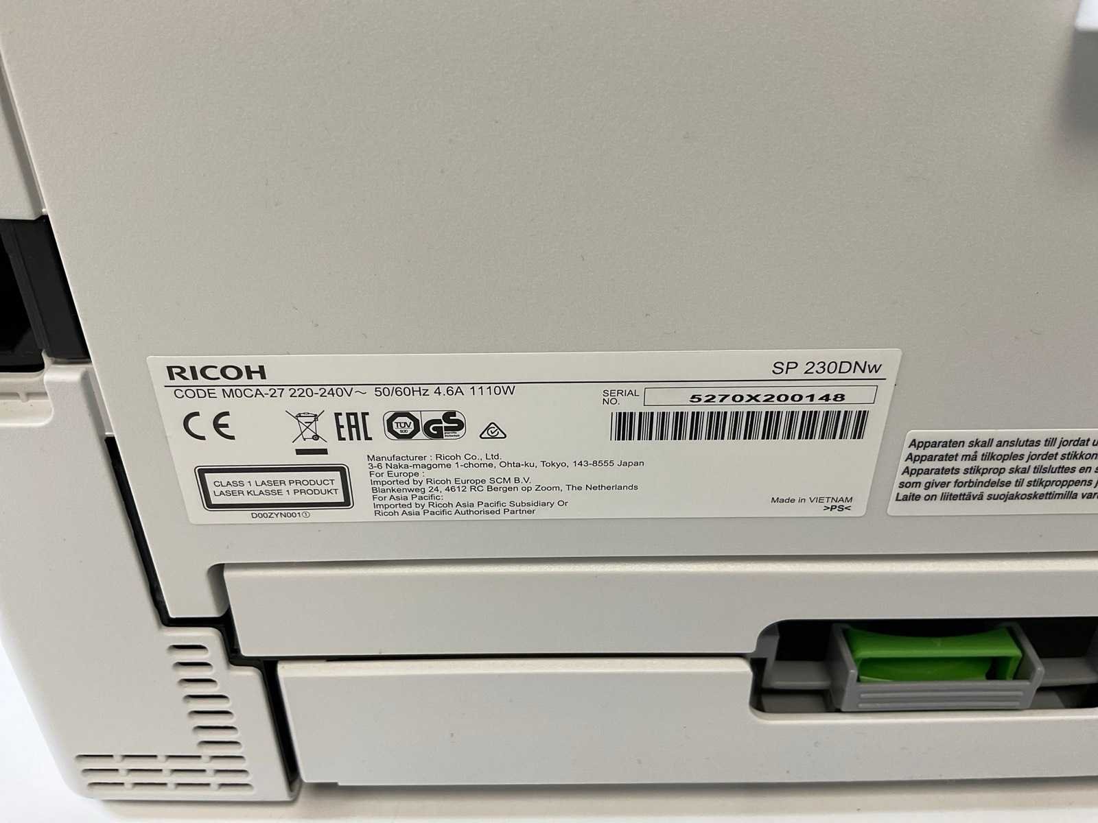 (SP 230DNw), Black and White Printer; - Tested for Power, - Excl. Power and connection cable. Merk: Ricoh