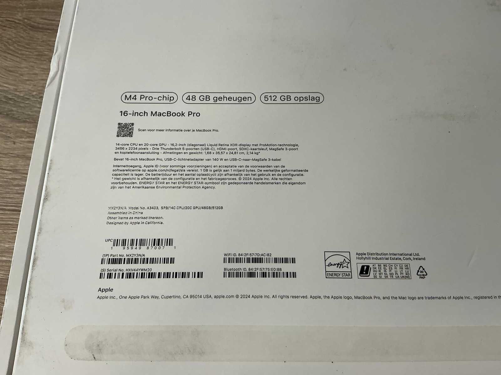 Merk: Apple Inc. Type: MX2Y3N/A Serienummer: HXV44YWM20 Processor type: Apple M4 Pro RAM Geheugen Type: 48 GB Totale opslagcapaciteit: 500GB Besturingssysteem: Geen besturingssysteem geinstalleerd. Met adapter: true Beelddiagonaal: 16'' Wifi: true Bluetooth: true Webcam: true