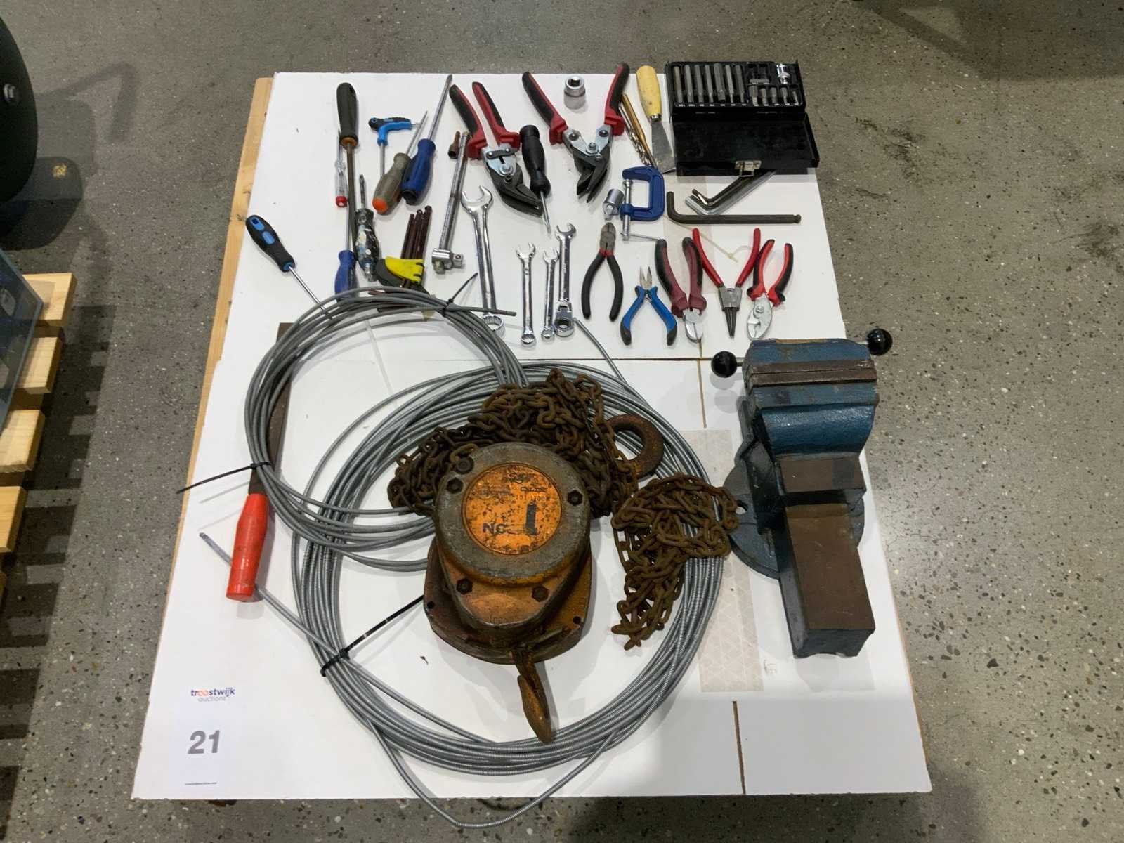 Waaronder: 1 handkettingtakel, 1 stalen bankschroef, tangetjes, steek / ringsleutels, trekveren