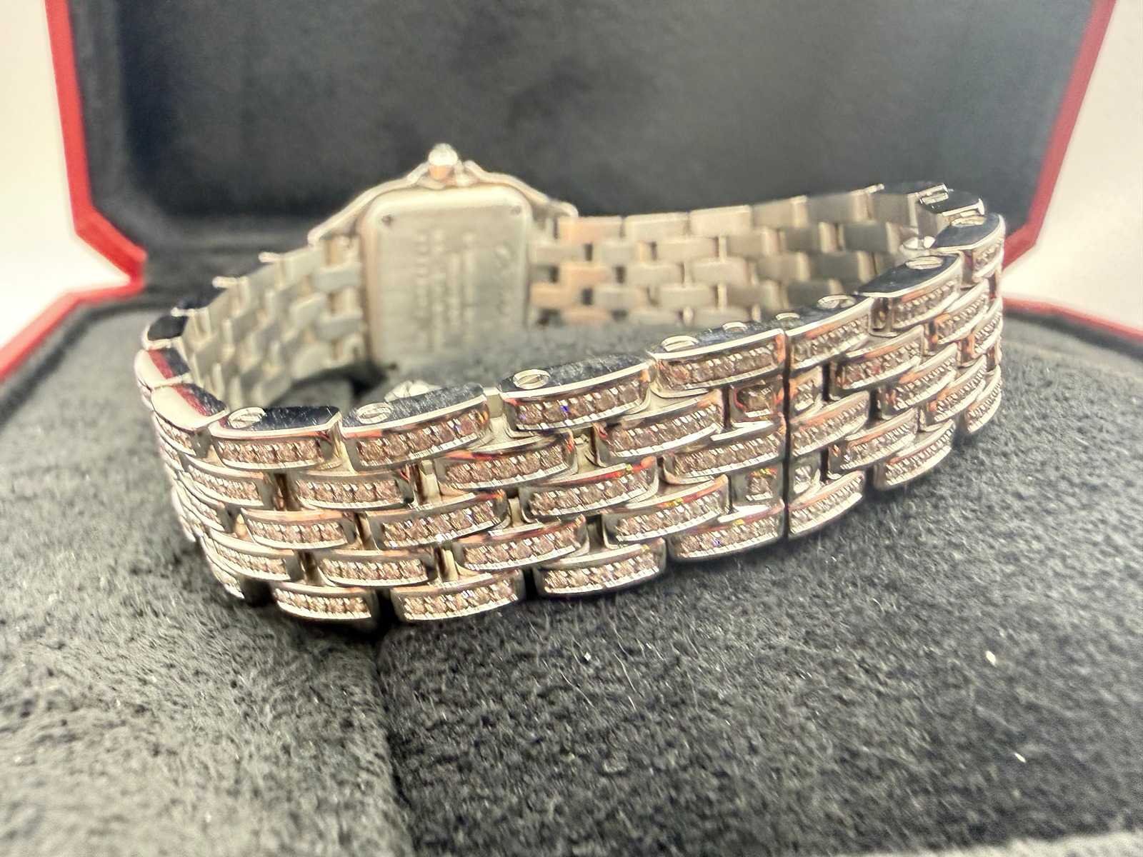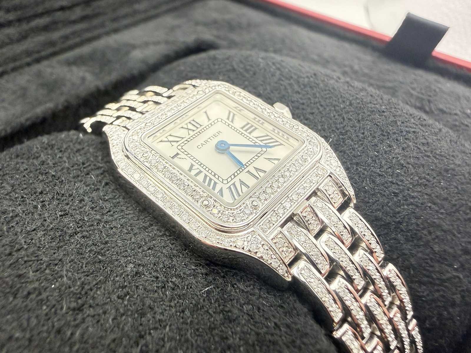 Featuring a perfectly proportioned square case, Roman numeral dial, and signature linked bracelet — all now beautifully enhanced with a full diamond setting. Key Features: Model: Cartier Panthère de Cartier Reference: WSPN0006 Year: 2025 Condition: Brand new, unworn Material: Stainless steel, fully set with natural diamonds Dial: White with Roman numerals Bracelet: Fully set with natural diamonds Movement: Quartz Set: Cartier box Please note: this is a customised watch, meaning it may include components that differ from the original factory specifications. Customisation can vary widely, so we highlight the following possibilities for full transparency: Aftermarket parts The watch may include third-party components (such as bezels, dials, hands, crystals or gem settings) that are not produced by the brand owner. These parts are often added for aesthetic reasons, but are not considered original by the manufacturer. Original parts from other models Some components (e.g. dials or bracelets) may have been sourced from other genuine watches by the same brand. While these parts are authentic, they were not originally fitted to this particular model or reference, which may affect collectability or eligibility for manufacturer service. Non-original parts In some cases, customised watches may include parts that are neither original nor manufactured by the brand. These components can affect the watch’s value. We encourage all bidders to carefully review the photos and description before placing a bid. Keep in mind: customised watches may not be eligible for official service or warranty from the brand. All bids should be placed with full awareness of the customisation status described above. Merk: Cartier Model: Panthere Bouwjaar: 2024 Referentienummer: WSPN0006 Materiaal kast: Steel / Diamonds Materiaal horlogeband: Steel / Diamonds Materiaal sluiting: Steel / Diamonds Wijzerplaat: White Roman Kastmaat: 22 mm