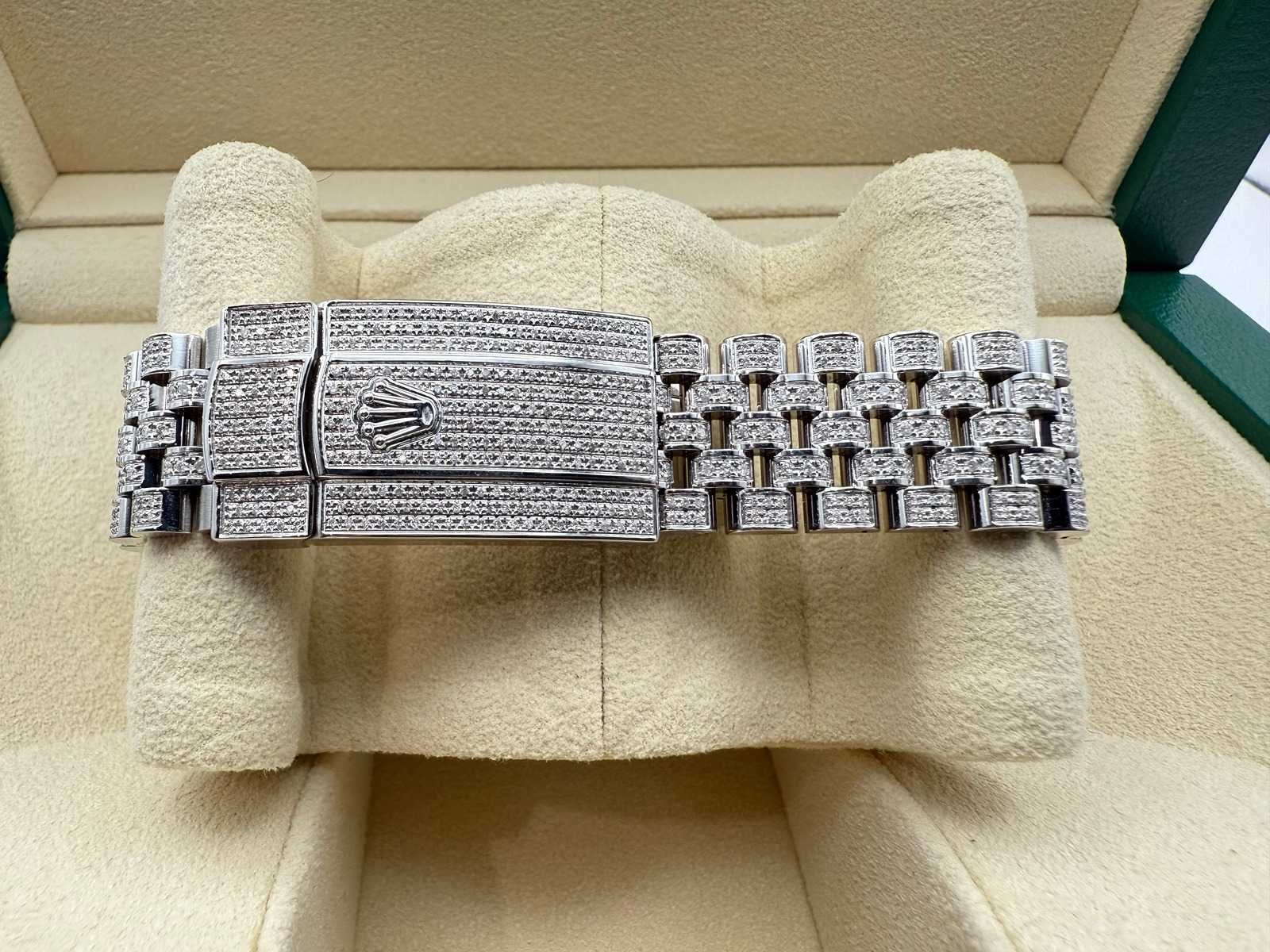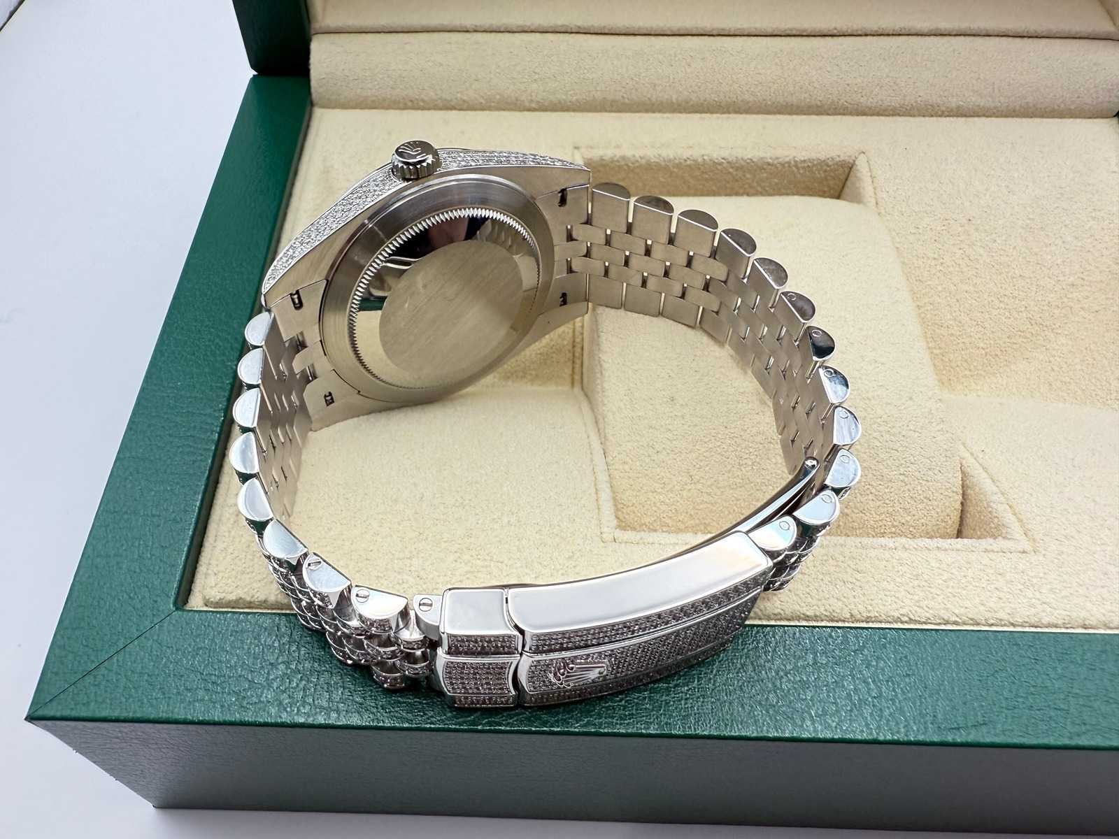 Rolex Datejust 41mm “Iced Out” – Fully Set with Diamonds This breathtaking Rolex Datejust 41mm, completely covered in diamonds, including the dial, is in brand-new and unworn condition. Often referred to as “iced out,” this stunning timepiece is a true statement of luxury. It comes as a full set, including the original Rolex box, booklets, warranty card holder, Rolex guarantee card, and tag. Key features: Model: Rolex Datejust 41mm Condition: Brand new, unworn Full diamond setting: Case, bracelet, and dial are fully set with diamonds Full set: Includes box, papers, warranty card, and Rolex tag This exceptional piece is a rare find, offering unmatched elegance and a striking appearance, perfect for collectors or anyone seeking a truly unique luxury watch. Merk: Rolex Model: Datejust Bouwjaar: 2022 Referentienummer: 126300 Materiaal kast: Steel / Diamonds Materiaal horlogeband: Steel / Diamonds Jubilee Materiaal sluiting: Steel / Diamonds Wijzerplaat: Diamonds Kastmaat: 41 mm