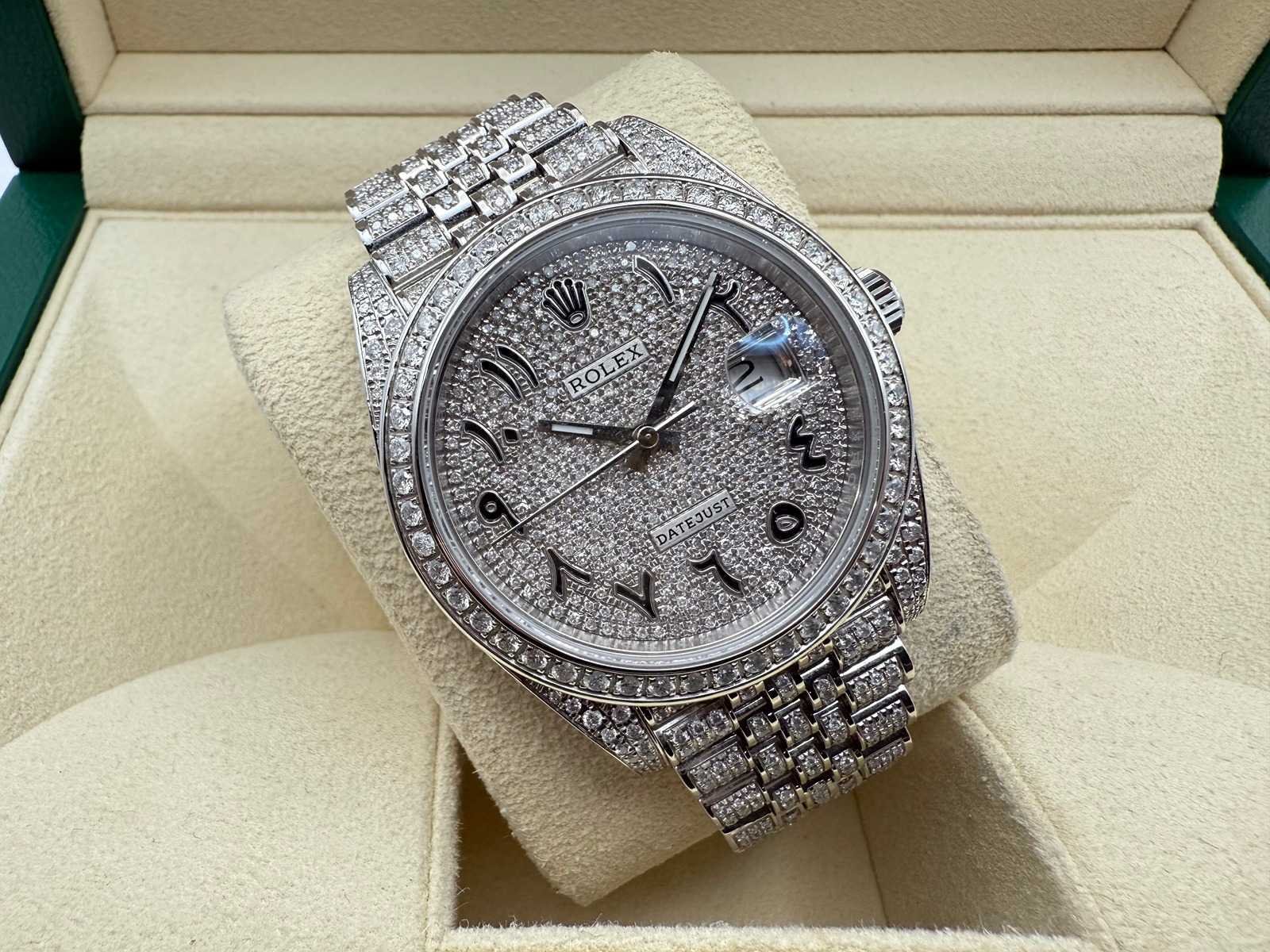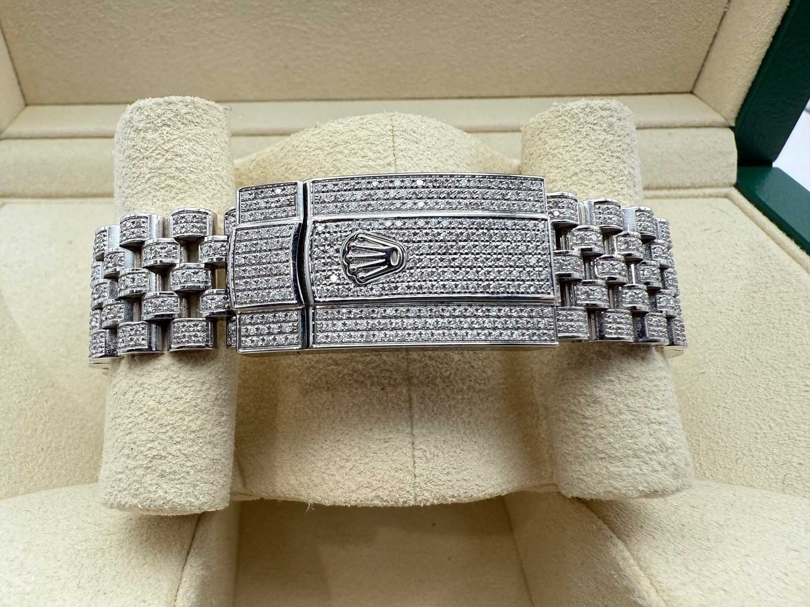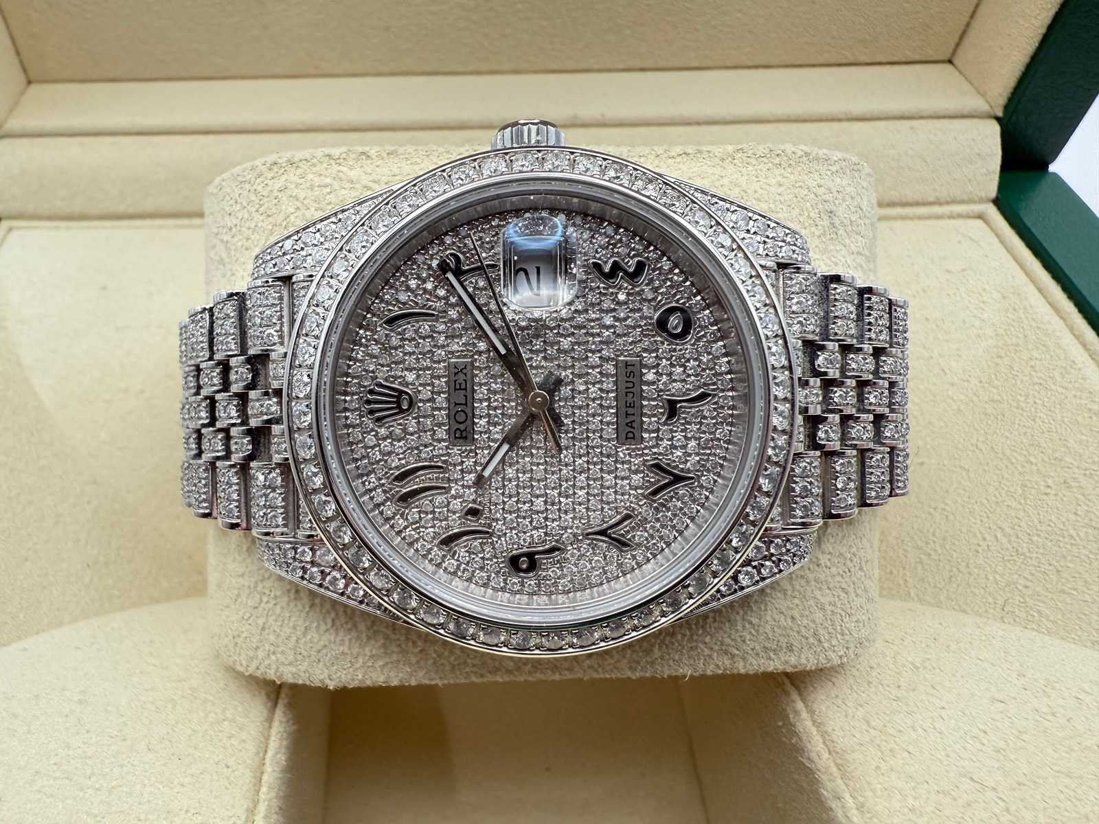 Rolex Datejust 41mm “Iced Out” – Fully Set with Diamonds This breathtaking Rolex Datejust 41mm, completely covered in diamonds, including the dial, is in brand-new and unworn condition. Often referred to as “iced out,” this stunning timepiece is a true statement of luxury. It comes as a full set, including the original Rolex box, booklets, warranty card holder, Rolex guarantee card, and tag. Key features: Model: Rolex Datejust 41mm Condition: Brand new, unworn Full diamond setting: Case, bracelet, and dial are fully set with diamonds Full set: Includes box, papers, warranty card, and Rolex tag This exceptional piece is a rare find, offering unmatched elegance and a striking appearance, perfect for collectors or anyone seeking a truly unique luxury watch. Merk: Rolex Model: Datejust Bouwjaar: 2022 Referentienummer: 126300 Materiaal kast: Steel / Diamonds Materiaal horlogeband: Steel / Diamonds Materiaal sluiting: Steel / Diamonds Wijzerplaat: Diamonds Kastmaat: 41 mm