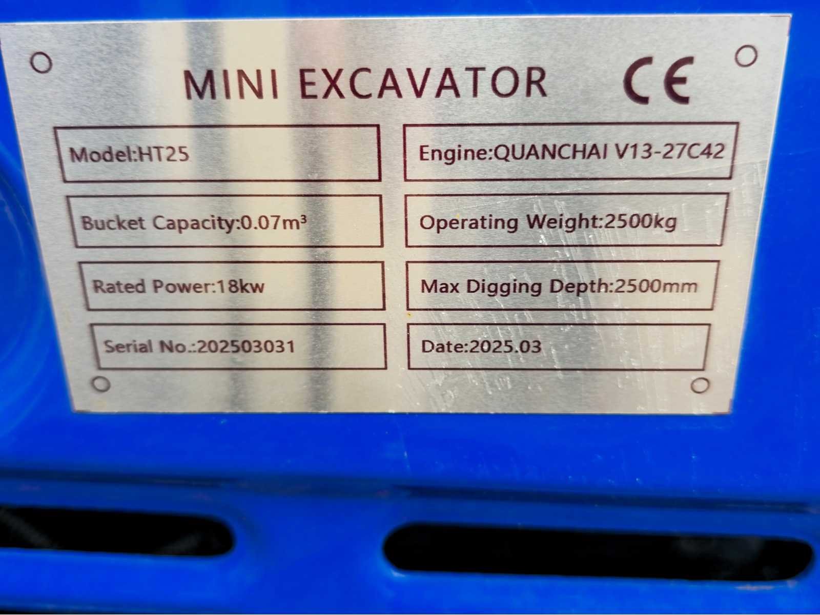 Voorzien van; zwenkgiek, 1000 mm graafarm, extra hydraulische leidingen, vulblad, rubberen rupsen, 540 mm graafbak; Ongebruikt Merk: JPC Type: HT25 Bouwjaar: 2025 Merk motor: Quanchai V13-27C42 Motorvermogen (kW): 18kW Brandstof: Diesel Bedrijfsgewicht: 2500kg