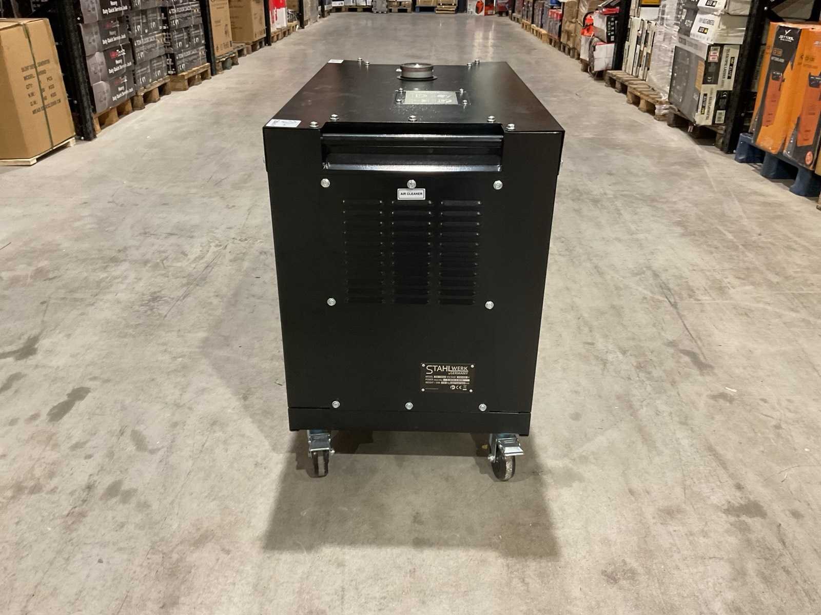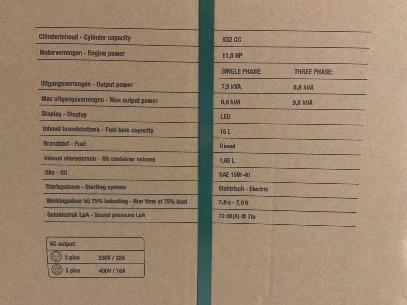 Voorzien van Dieselmotor; Cilinderinhoud: 532 CC; Motorvermogen: 11,0 HP; Uitgangsvermogen (nominaal): Enkel fase: 7,9 kVA, Drie fase: 8,8 kVA; Maximaal uitgangsvermogen: Enkel fase: 8,8 kVA, Drie fase: 9,8 kVA, Brandstoftank: 15 liter; Oliecapaciteit: 1,65 liter; Elektrisch (Electric Start); Display: LED; Geluidsniveau: 72 dB(A) @ 7 meter; Bedrijfstijd bij 75% belasting: 7,0 – 7,5 uur; AC-uitgangen: 1x 230V / 32A (3-pins), 1x 400V / 16A (5-pins); Ongebruikt (Transport afmeting; 980x56x860mm; Gewicht 182 kg) Merk: Stahlwerk Type: SW-10KW Bouwjaar: 2025 Capaciteit.: 10kVA Diesel: true Mobiel: true Handboek aanwezig: true Machinegewicht: 170kg Totale afmeting L: 960mm Totale afmeting Breedte: 820mm Totale afmeting Hoogte: 540mm