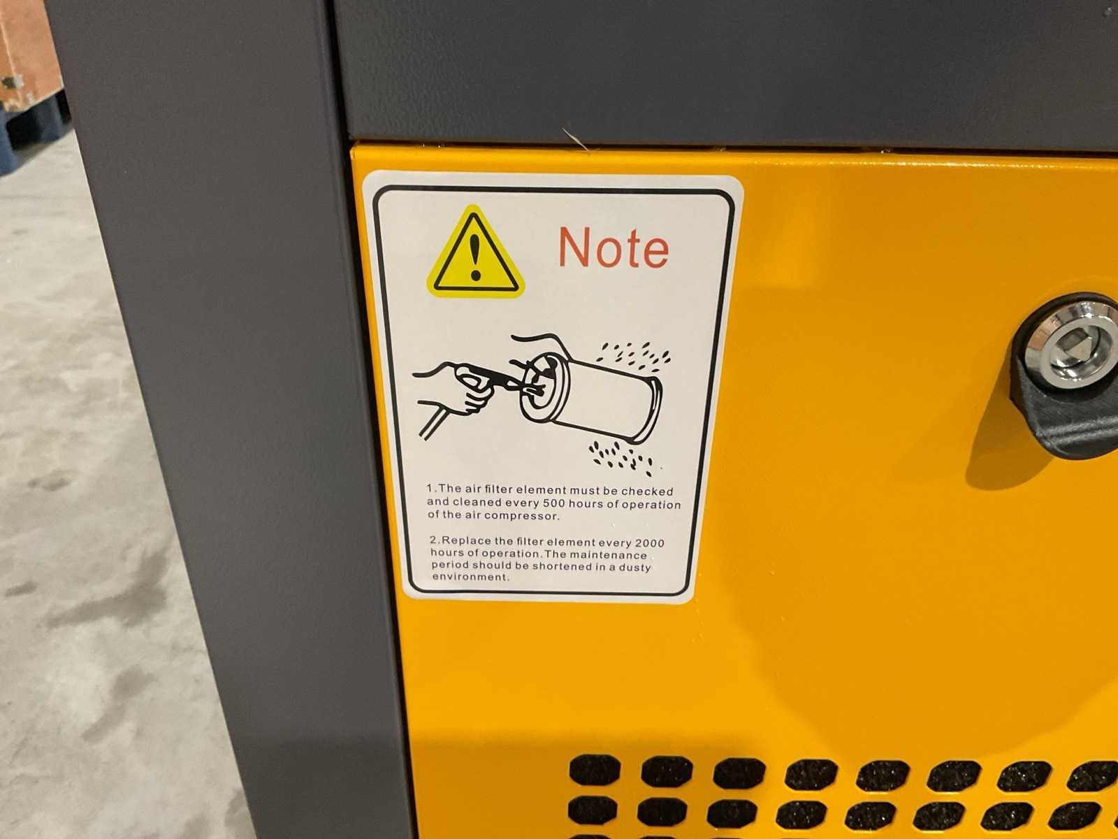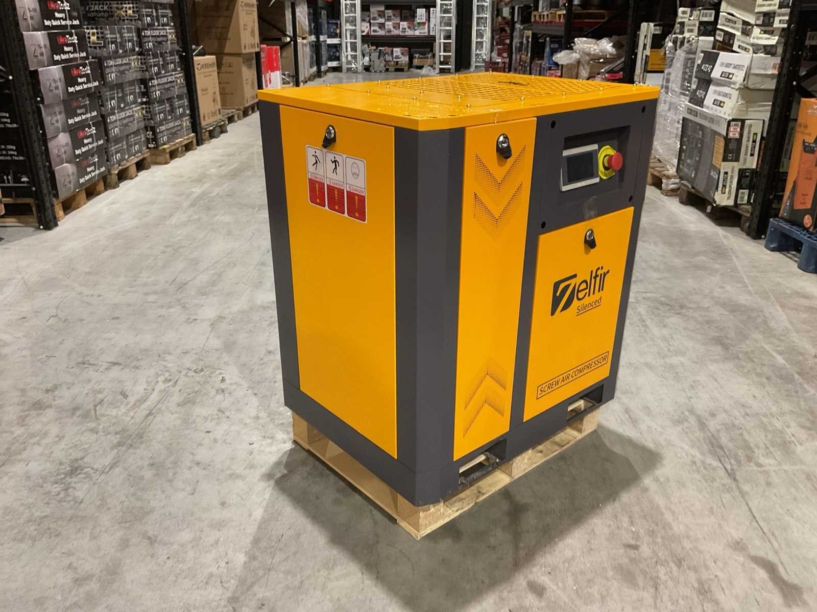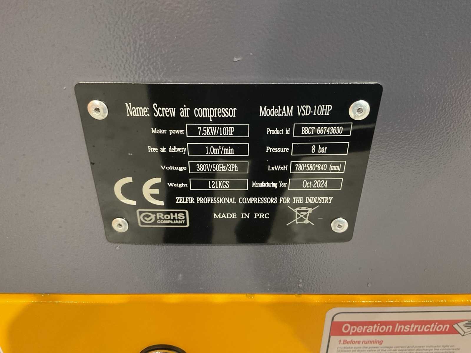 Voorzien van vermogen 10pk; voeding 380-415v 3 fase elektrisch; elektrisch; Vrij afgeleverd volume (FAD): 1,0 m³/min (≈ 35 CFM); Werkdruk: 8 bar; geluidgedempte kast; compressortechniek: oliegesmeerde schroefcompressor; nieuw in doos Merk: Zelfier Type: VSD-10HP Bouwjaar: 2025