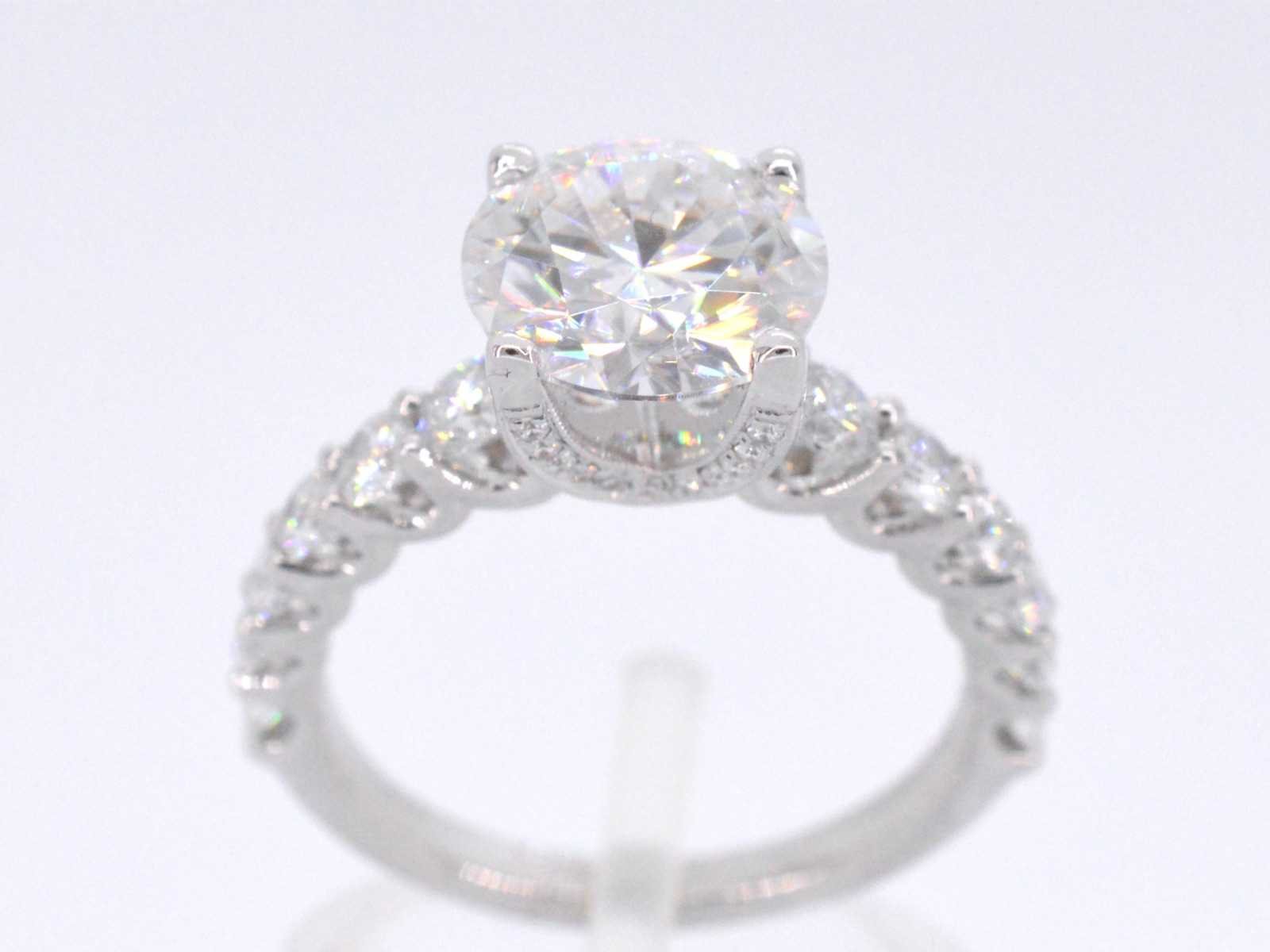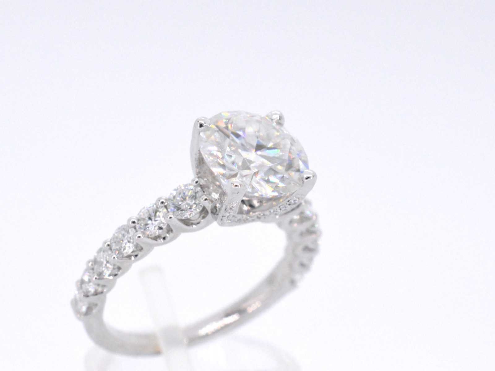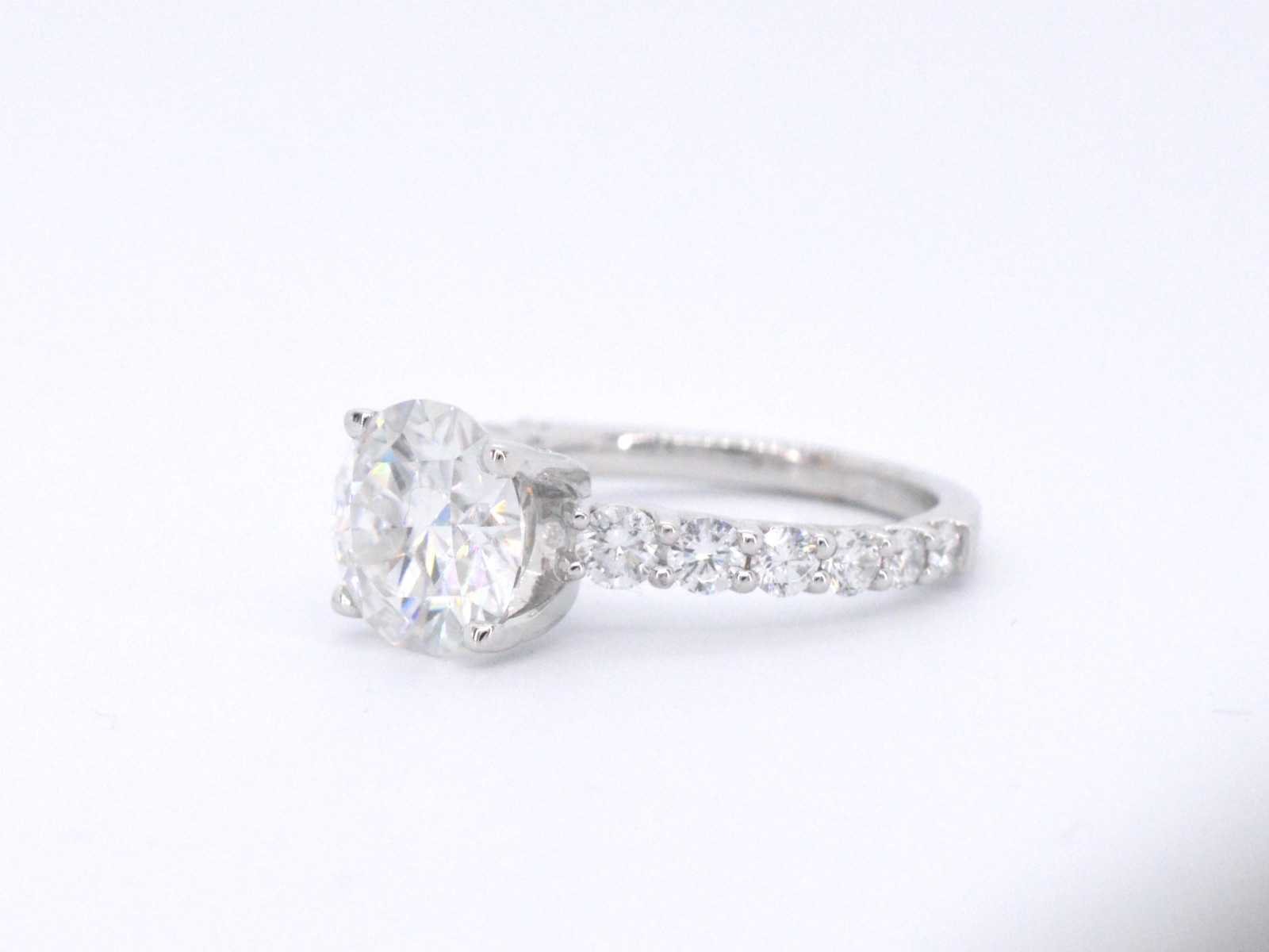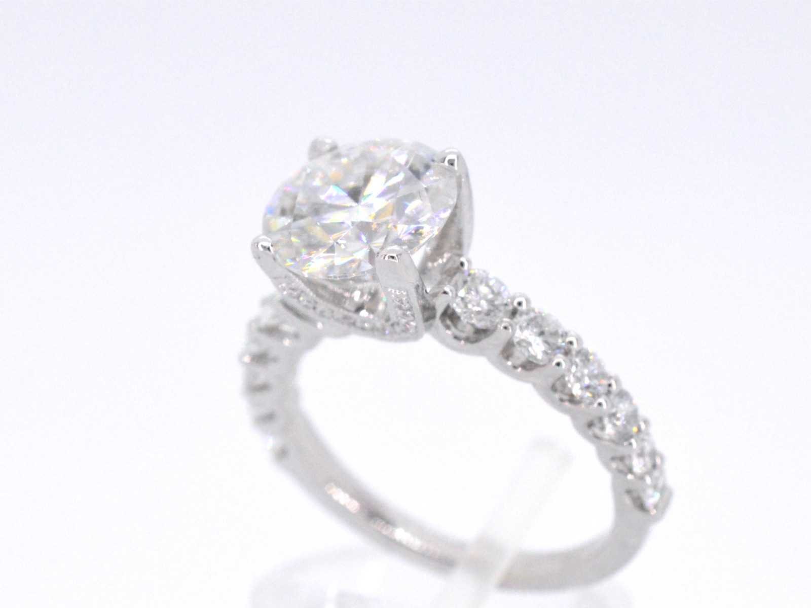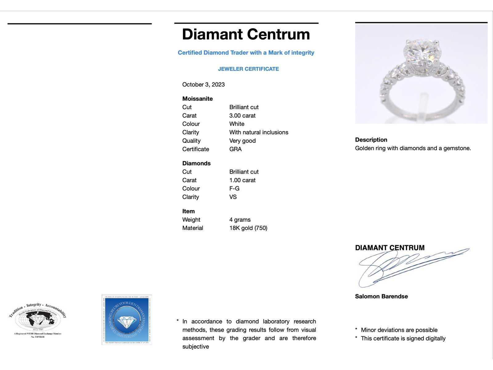 Samenvatting van gegevens Witgouden diamanten ring met een briljant van 3.00 carat Diamant: Natuurlijk; Slijpvorm: Briljant geslepen; Gewicht (carat): 1.00 carat totaal; Kleur: F-G; Zuiverheid: VS; Edelsteen: Moisanniet; Slijpvorm: Briljant geslepen; Gewicht (carat): 3.00 carat; Kleur: Wit; Zuiverheid: Zeer zuiver; Slijpkwaliteit: Very good; Juweel: Ring; Gewicht: 4 gram; Ringmaat (op maat gemaakt*): 53 (17 mm); Materiaal: 18K goud (750); Conditie: Nieuw; Verpakking: Luxe sieradendoos; Toelichting: De kwaliteit is overgenomen van het rapport behorend bij item. De waardebepaling is een beoordeling van een gecertificeerde diamantair, gebaseerd op consumentenprijzen.; Extra informatie: Het gemeten gewicht van de edelstenen is volgens diamant maten; Consumentenprijs: € 18.000,- Within 14 days Materiaal: Goud Voornaamste diamant: Natuurlijk Gewicht diamant: 1.00ct Edelsteen: Moisanniet Totaal gewicht: 4g Keurmerk: 750 Kleur diamant: F-G Slijpvorm diamant: Briljant geslepen Zuiverheidsgraad diamant: VS Kleur edelsteen: Wit Slijpvorm edelsteen: Briljant geslepen Slijpkwaliteit edelsteen: Very good Zuiverheidsgraad edelsteen: Zeer zuiver