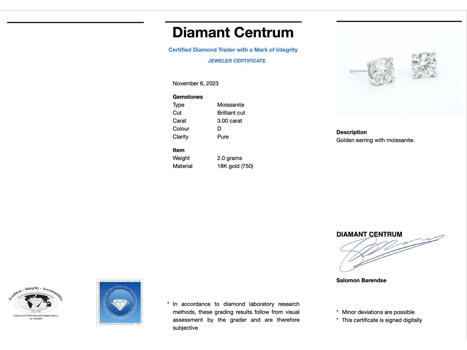 Samenvatting van gegevens Gouden briljant oorbellen van 3.00 carat Edelsteen: Moisanniet; Slijpvorm: Briljant geslepen; Gewicht (carat): 3.00 carat; Kleur: D; Zuiverheid: Zuiver; Slijpkwaliteit: Very good; Juweel: Oorbellen; Gewicht: 2 gram; Materiaal: 18k goud (750); Conditie: Nieuw; Verpakking: Luxe sieradendoos; Toelichting: De kwaliteit is overgenomen van het rapport behorend bij item. De waardebepaling is een beoordeling van een gecertificeerde diamantair, gebaseerd op consumentenprijzen.; Extra informatie: Het gemeten gewicht van de edelstenen is volgens diamant maten; Consumentenprijs: € 6.600,- Within 14 days Totaal gewicht: 2g Keurmerk: 750