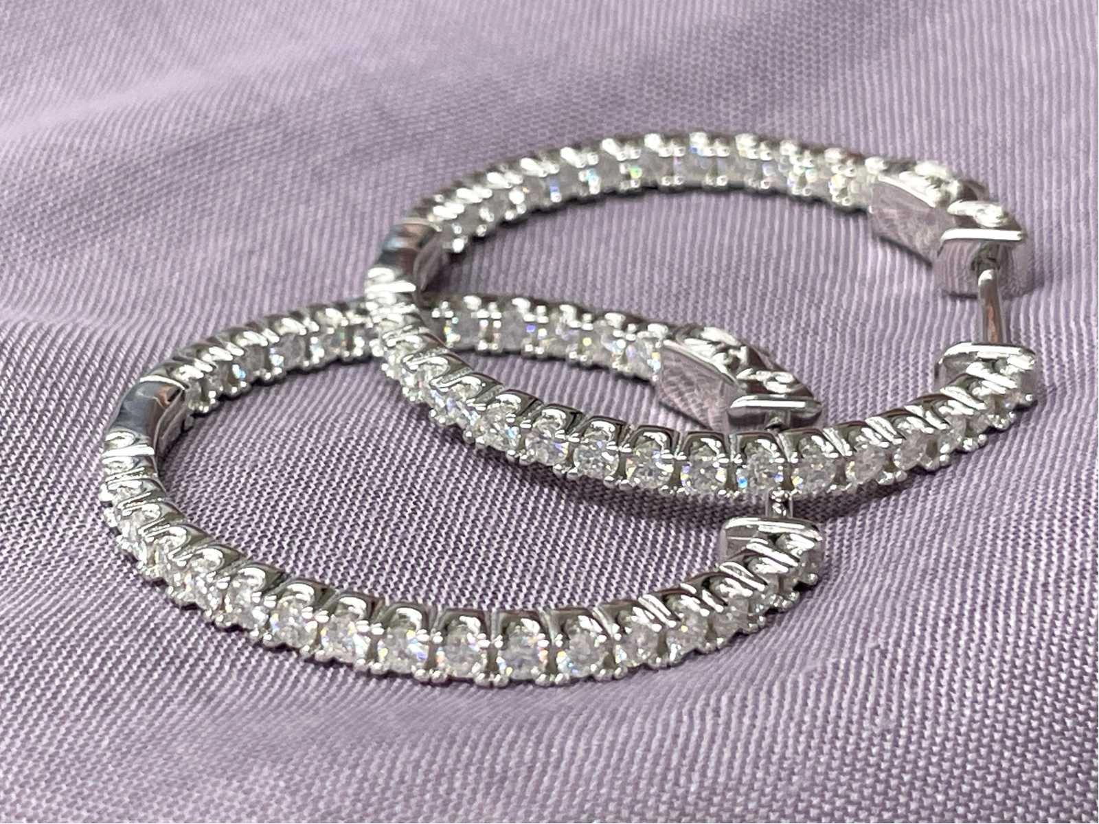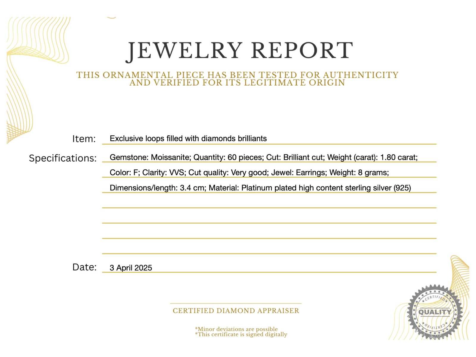 Samenvatting van gegevens Exclusieve loops vol gezet met briljanten Edelsteen: Moissaniet; Aantal: 60 stuks; Slijpvorm: Briljant geslepen; Gewicht (carat): 1.80 carat; Kleur: F; Zuiverheid: VVS; Slijpkwaliteit: Zeer mooi; Juweel: Oorbellen; Merk: Harmony; Gewicht: 8 gram; Afmetingen/lengte: 3.4 cm; Materiaal: Geplatineerd hoog gehalte sterling zilver (925); Conditie: Nieuw; Verpakking: Sieradendoos of fluwelen etui; Toelichting: De kwaliteit is overgenomen van het rapport behorend bij item. De waardebepaling is een beoordeling van een gecertificeerde diamantair, gebaseerd op consumentenprijzen..; Extra informatie: Het gemeten gewicht van de edelstenen is volgens diamant maten; Consumentenprijs: € 1.000,- Within 14 days Materiaal: Zilver Edelsteen: Moissaniet Kleur edelsteen: F Slijpvorm edelsteen: Briljant geslepen Slijpkwaliteit edelsteen: Zeer mooi Zuiverheidsgraad edelsteen: VVS Totaal gewicht: 8g Keurmerk: 925