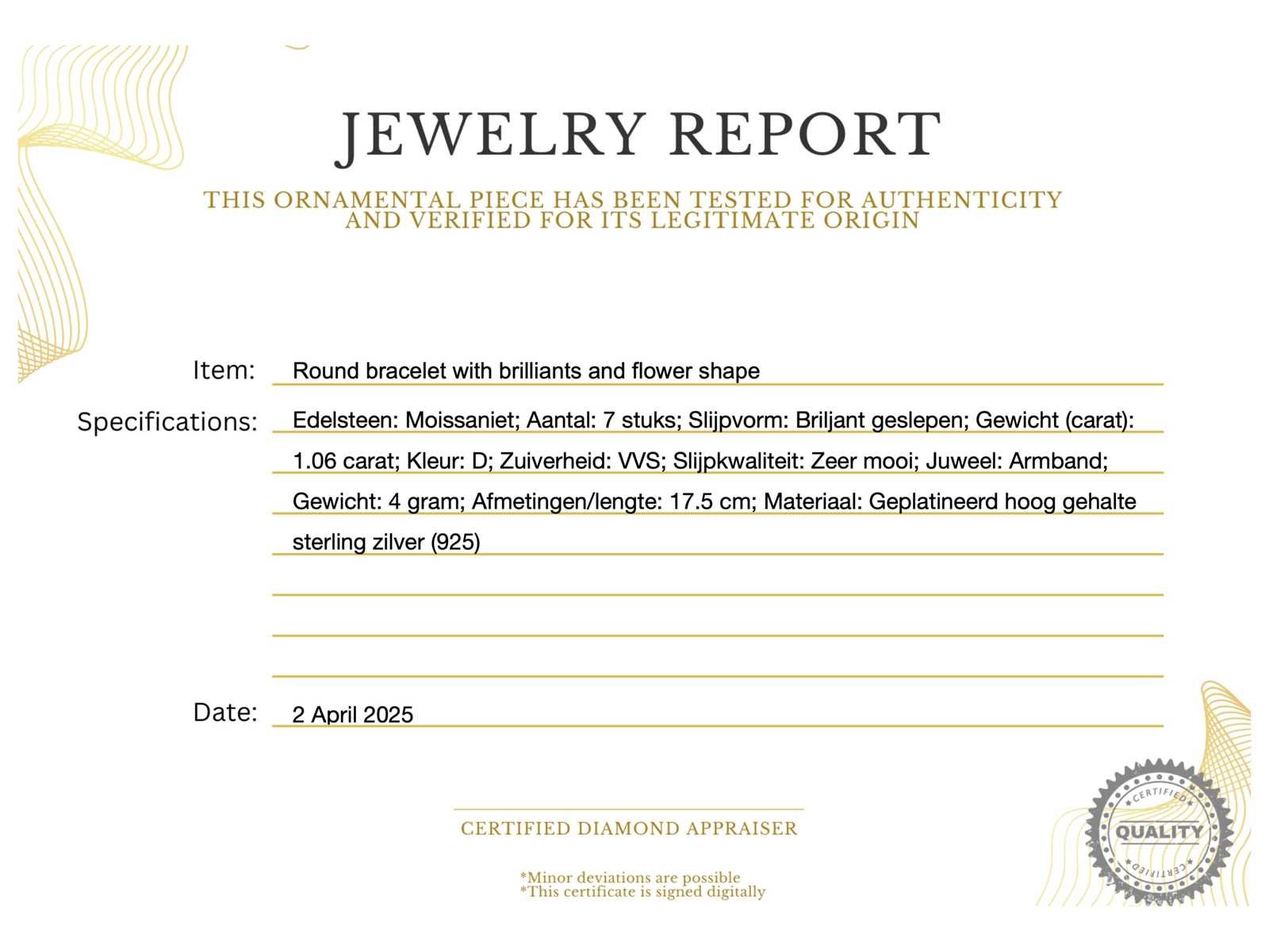 Samenvatting van gegevens Ronde armband met briljanten en bloem vorm Edelsteen: Moissaniet; Aantal: 7 stuks; Slijpvorm: Briljant geslepen; Gewicht (carat): 1.06 carat; Kleur: D; Zuiverheid: VVS; Slijpkwaliteit: Zeer mooi; Juweel: Armband; Merk: Harmony; Gewicht: 4 gram; Afmetingen/lengte: 17.5 cm; Materiaal: Geplatineerd hoog gehalte sterling zilver (925); Conditie: Nieuw; Verpakking: sieradendoos of fluwelen etui; Toelichting: De kwaliteit is overgenomen van het rapport behorend bij item. De waardebepaling is een beoordeling van een gecertificeerde diamantair, gebaseerd op consumentenprijzen.; Extra informatie: Het gemeten gewicht van de edelstenen is volgens diamant maten; Consumentenprijs: € 580,- Within 14 days Materiaal: Zilver Edelsteen: Moissaniet Kleur edelsteen: D Slijpvorm edelsteen: Briljant geslepen Slijpkwaliteit edelsteen: Zeer mooi Zuiverheidsgraad edelsteen: VVS Totaal gewicht: 4g Keurmerk: 925