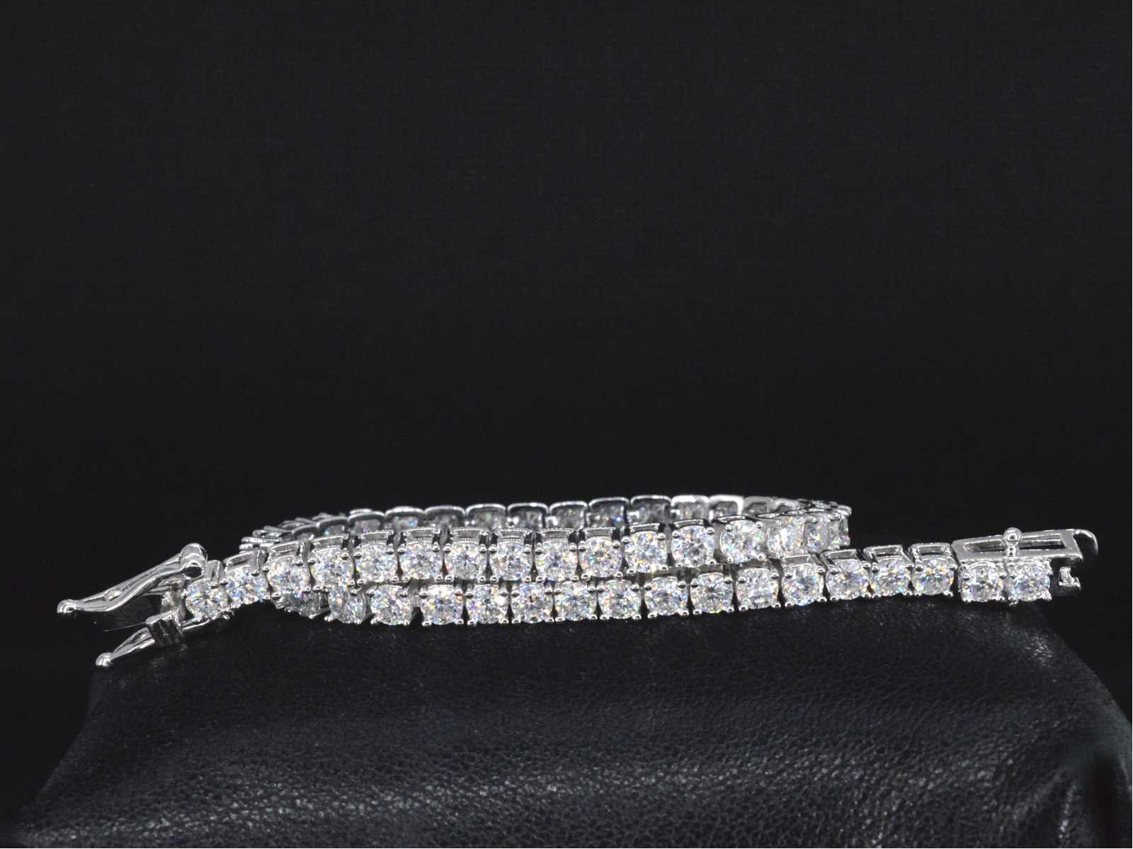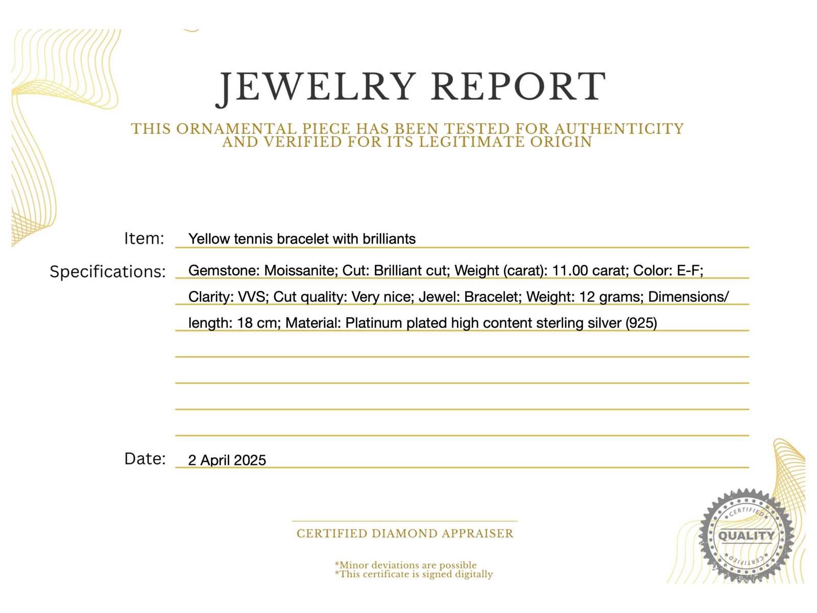 Samenvatting van gegevens Witte tennisarmband met briljanten Edelsteen: Moissaniet; Slijpvorm: Briljant geslepen; Gewicht (carat): 11.00 carat; Kleur: E-F; Zuiverheid: VVS; Slijpkwaliteit: Zeer mooi; Juweel: Armband; Merk: Harmony; Gewicht: 12 gram; Afmetingen/lengte: 18 cm; Materiaal: Geplatineerd hoog gehalte sterling zilver (925); Conditie: Nieuw; Verpakking: Sieradendoos of fluwelen etui; Toelichting: De kwaliteit is overgenomen van het rapport behorend bij item. De waardebepaling is een beoordeling van een gecertificeerde diamantair, gebaseerd op consumentenprijzen.; Extra informatie: Het gemeten gewicht van de edelstenen is volgens diamant maten; Consumentenprijs: € 1.600,- Within 14 days Materiaal: Zilver Edelsteen: Moissaniet Kleur edelsteen: E-F Slijpvorm edelsteen: Briljant geslepen Slijpkwaliteit edelsteen: Zeer mooi Zuiverheidsgraad edelsteen: VVS Totaal gewicht: 12g Keurmerk: 925
