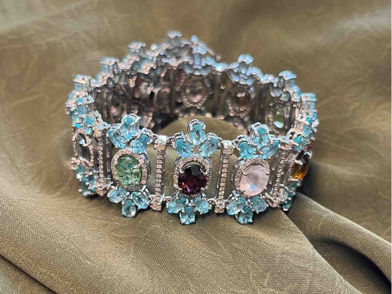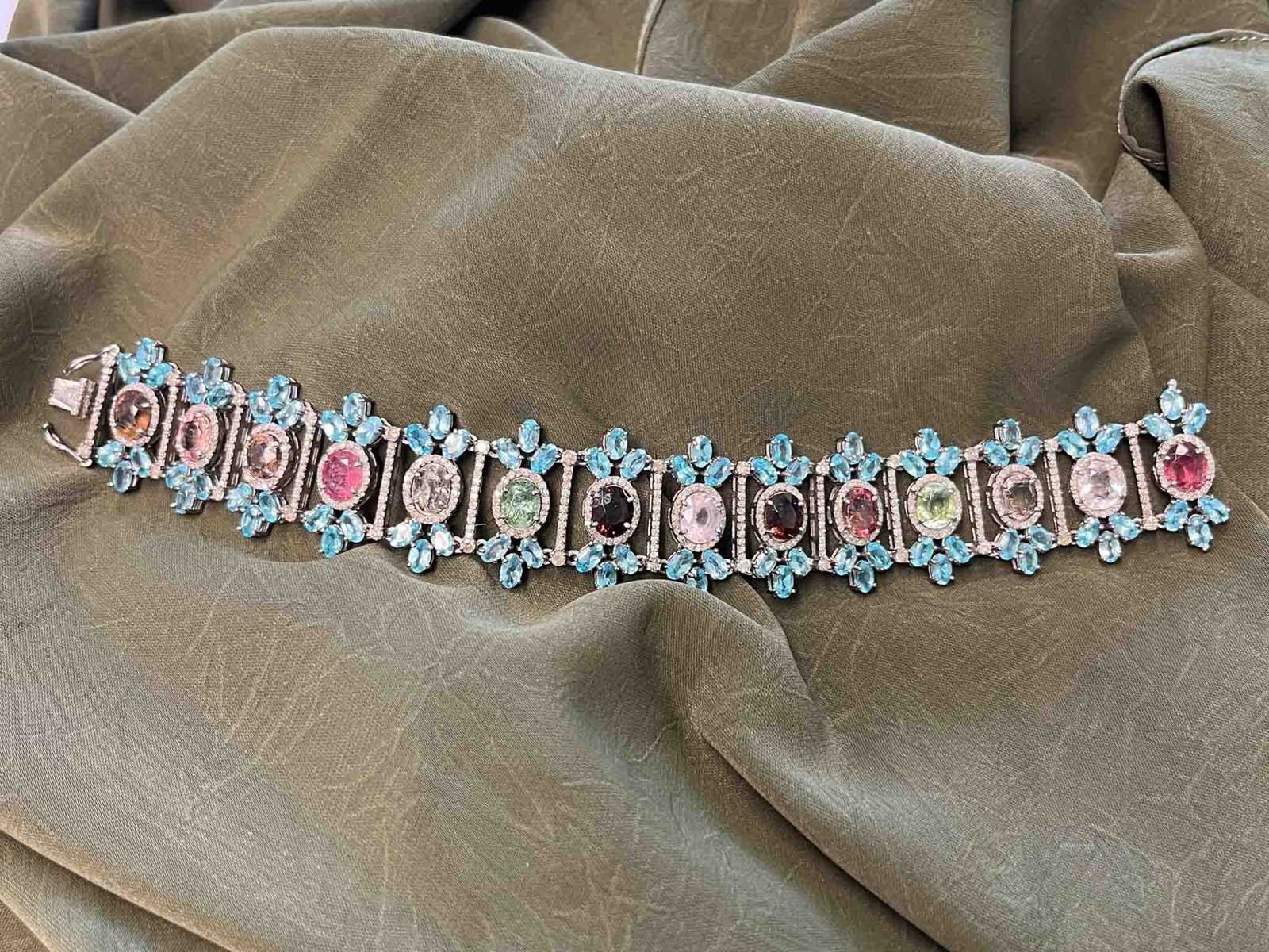 Samenvatting van gegevens Bijzondere armband met natuurlijke edelstenen en diamant Diamant: Echte Natuurlijk diamanten; Gewicht (carat): 4.00 carat; Zuiverheid: Met natuurlijke insluitsels; Edelsteen: Natuurlijke toermalijnen; Slijpvorm: Ovaal geslepen; Gewicht (carat): 25.00 carat; Kleur: Multicolour; Zuiverheid: Mat natuurlijke insluitsels; Edelsteen (secundair): Natuurlijke apetiet; Slijpvorm: Ovaal geslepen; Gewicht (carat): 22.00 carat; Kleur: Licht blauw; Juweel: Armband; Gewicht: 41 gram; Afmetingen/lengte: 18 cm; Materiaal: Hoge kwaliteit Sterling zilver; Conditie: Vintage; Verpakking: Sieradendoos of fluwelen etui; Toelichting: De kwaliteit is overgenomen van het rapport behorend bij item. De waardebepaling is een beoordeling van een gecertificeerde diamantair, gebaseerd op consumentenprijzen.; Extra informatie: Dit is een met de hand vervaardigd sieraad.; Consumentenprijs: € 7.480,- Within 14 days Materiaal: Zilver Voornaamste diamant: Echte Natuurlijk diamanten Gewicht diamant: 4.00ct Zuiverheidsgraad diamant: Met natuurlijke insluitsels Edelsteen: Natuurlijke toermalijnen Kleur edelsteen: Multicolour Slijpvorm edelsteen: Ovaal geslepen Zuiverheidsgraad edelsteen: Mat natuurlijke insluitsels Totaal gewicht: 41g