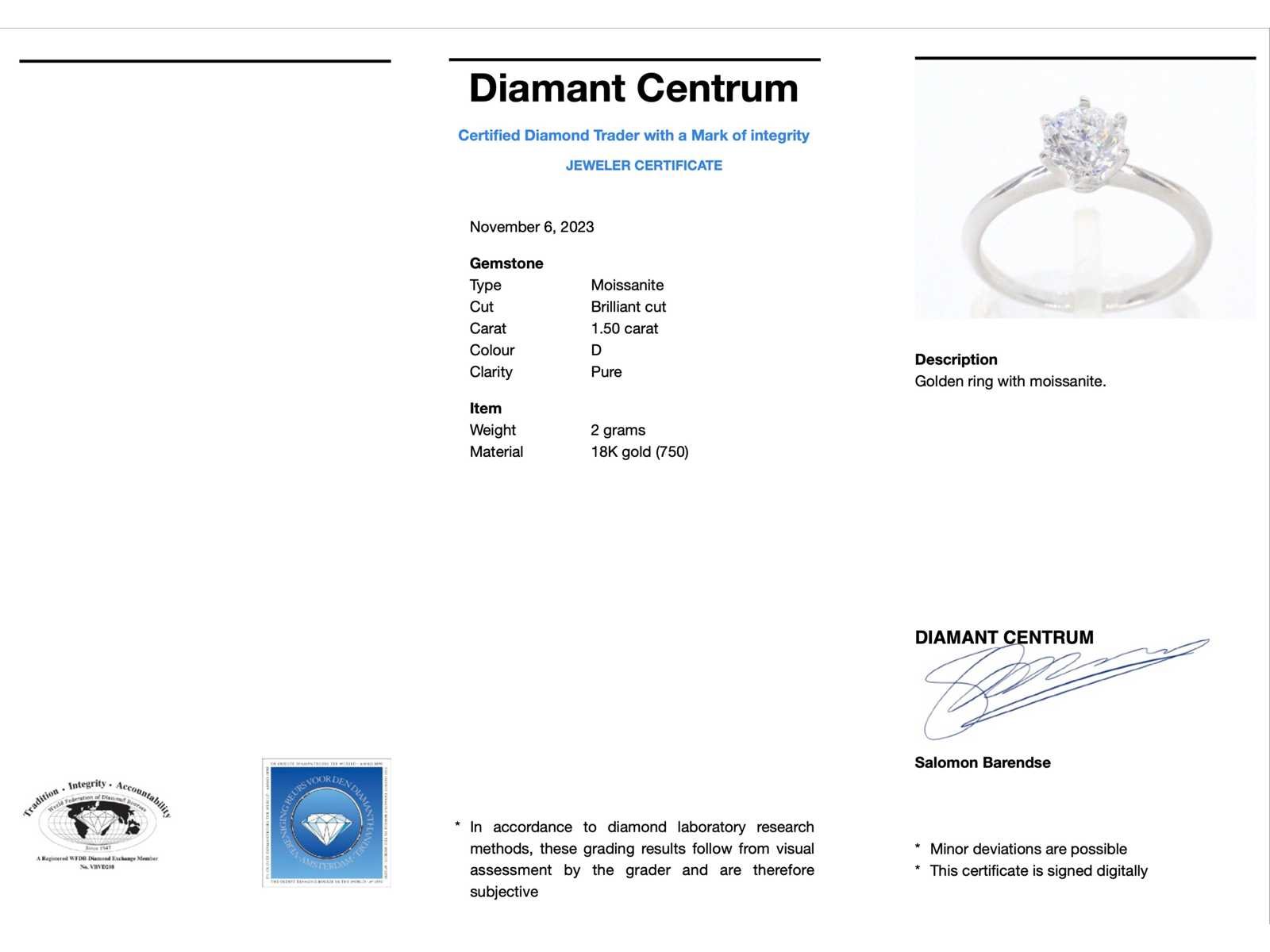 Samenvatting van gegevens Witgouden solitair ring met 1.50 carat briljant Edelsteen: Moissaniet; Slijpvorm: Briljant geslepen; Gewicht (carat): 1.50 carat; Kleur: D; Zuiverheid: Zuiver; Juweel: Ring; Gewicht: 2 gram; Ringmaat (op maat gemaakt*): 53 (17 mm); Materiaal: 18k goud (750); Conditie: Nieuw; Verpakking: Luxe sieradendoos; Toelichting: De kwaliteit is overgenomen van het rapport behorend bij item. De waardebepaling is een beoordeling van een gecertificeerde diamantair, gebaseerd op consumentenprijzen.; Extra informatie: Het gemeten gewicht van de edelstenen is volgens diamant maten; Consumentenprijs: € 4.680,- Within 14 days Materiaal: Goud Edelsteen: Moissaniet Totaal gewicht: 2g Keurmerk: 750 Kleur edelsteen: D Slijpvorm edelsteen: Briljant geslepen Zuiverheidsgraad edelsteen: Zuiver