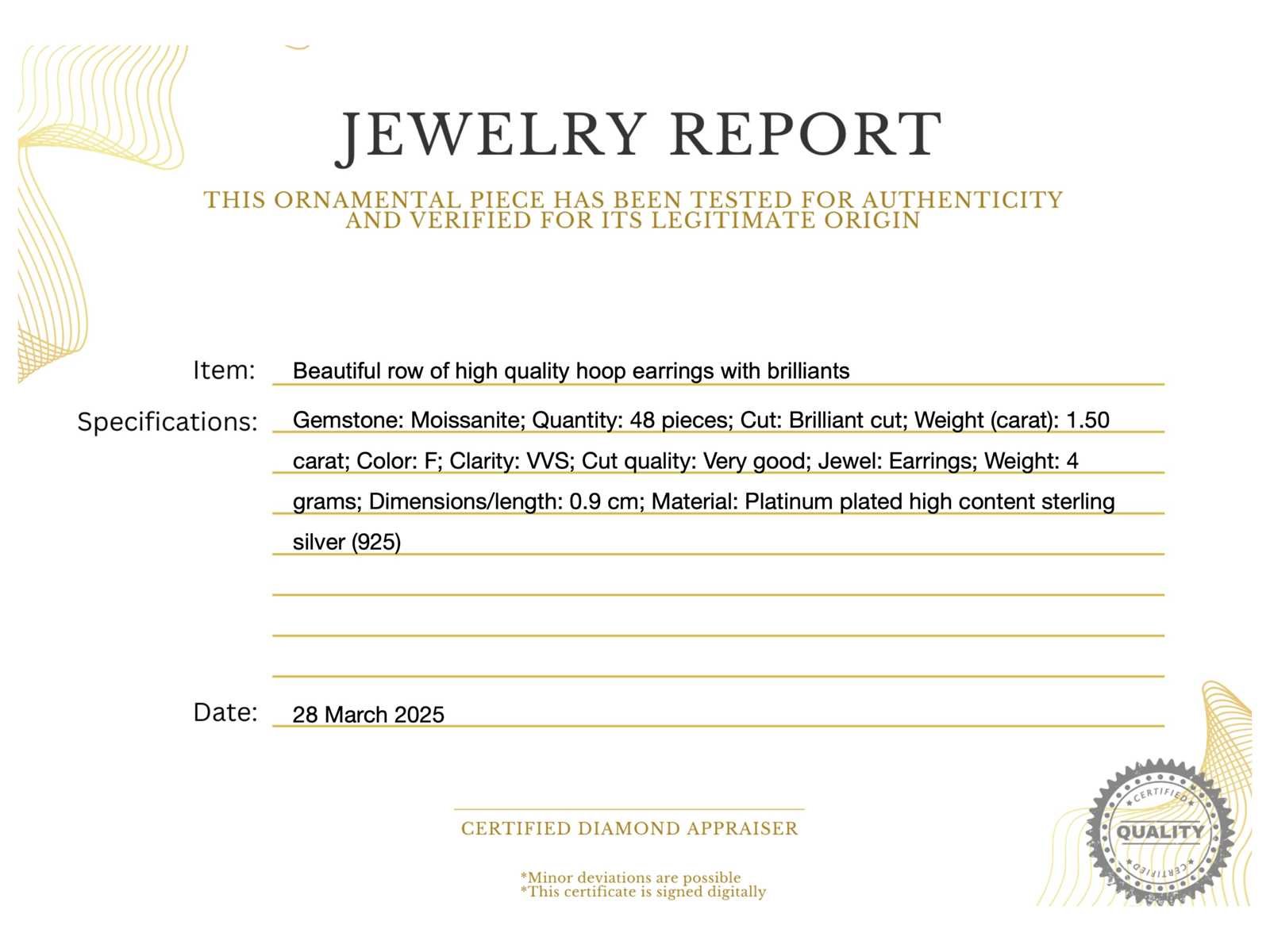 Samenvatting van gegevens Mooie rij oorbellen van hoge kwaliteit met briljanten Edelsteen: Moissaniet; Aantal: 48 stuks; Slijpvorm: Briljant geslepen; Gewicht (carat): 1.50 carat; Kleur: F; Zuiverheid: VVS; Slijpkwaliteit: Zeer mooi; Juweel: Oorbellen; Merk: Harmony; Gewicht: 4 gram; Afmetingen/lengte: 0.9 cm; Materiaal: Geplatineerd hoog gehalte sterling zilver (925); Conditie: Nieuw; Verpakking: Sieradendoos of fluwelen etui; Extra informatie: Het gemeten gewicht van de edelstenen is volgens diamant maten; Consumentenprijs: € 800,- Within 14 days Materiaal: Zilver Edelsteen: Moissaniet Kleur edelsteen: F Slijpvorm edelsteen: Briljant geslepen Slijpkwaliteit edelsteen: Zeer mooi Zuiverheidsgraad edelsteen: VVS Totaal gewicht: 4g Keurmerk: 925