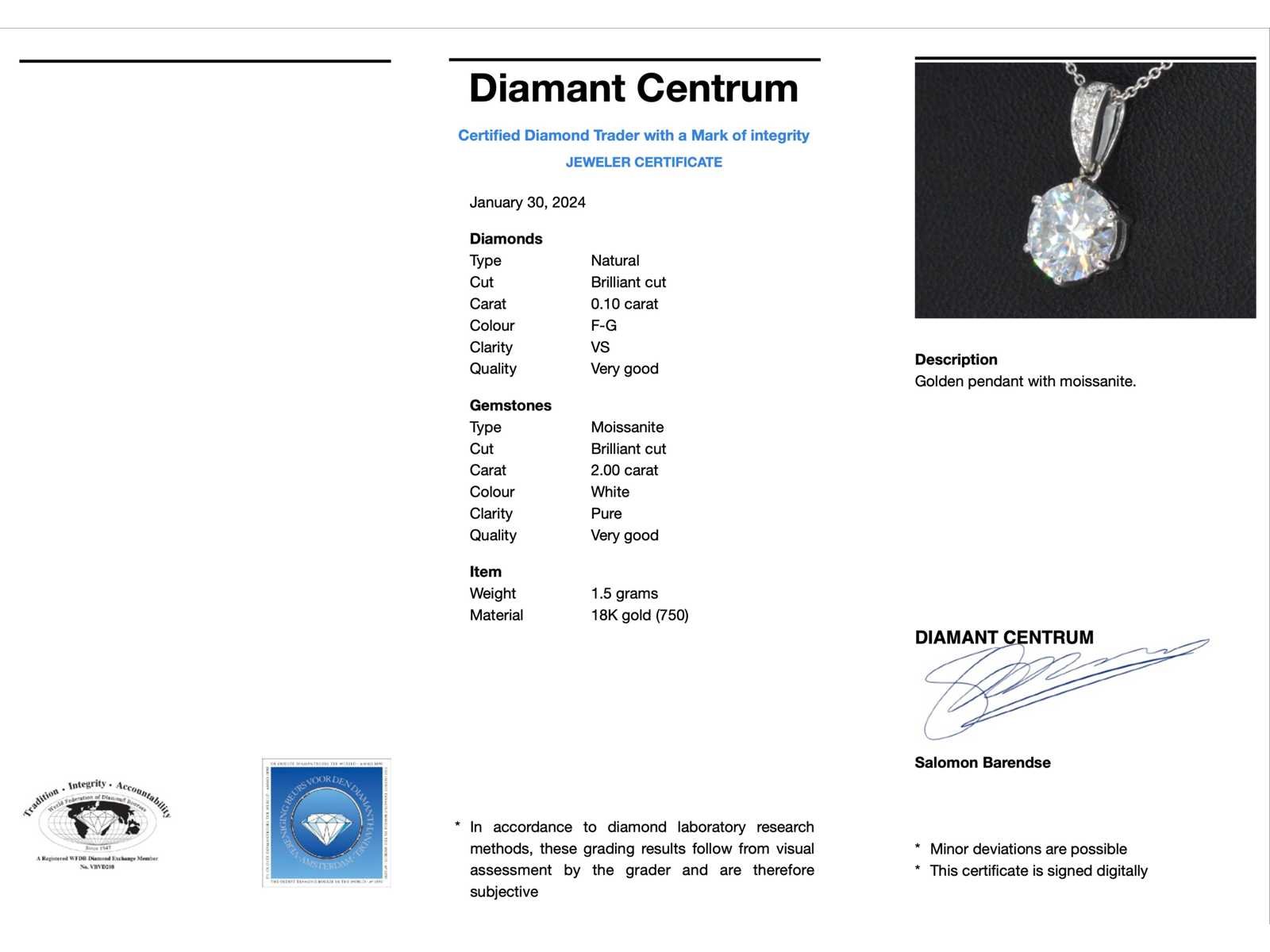 Samenvatting van gegevens Witgouden hanger met diamanten en een briljant van 2.00 carat Aantal: 5 stuks; Slijpvorm: Briljant geslepen; Gewicht (carat): 0.10 carat totaal; Kleur: F-G; Zuiverheid: VS; Slijpkwaliteit: Zeer mooi; Edelsteen: Moissaniet; Aantal: 1 stuk; Slijpvorm: Briljant geslepen; Gewicht (carat): 2.00 carat; Kleur: Wit; Zuiverheid: Zeer zuiver; Slijpkwaliteit: Zeer mooi; Juweel: Hanger (excl. ketting); Gewicht: 1.5 gram; Afmetingen/lengte: 17 mm; Materiaal: 18k goud (750); Conditie: Nieuw; Verpakking: Luxe sieradendoos; Toelichting: De kwaliteit is overgenomen van het rapport behorend bij item. De waardebepaling is een beoordeling van een gecertificeerde diamantair, gebaseerd op consumentenprijzen.; Extra informatie: Het gemeten gewicht van de edelstenen is volgens diamant maten; Consumentenprijs: € 4.680,- Within 14 days Materiaal: Goud Kleur diamant: F-G Gewicht diamant: 0.10ct Slijpvorm diamant: Briljant geslepen Slijpkwaliteit diamant: Zeer mooi Zuiverheidsgraad diamant: VS Edelsteen: Moissaniet Kleur edelsteen: Wit Slijpvorm edelsteen: Briljant geslepen Slijpkwaliteit edelsteen: Zeer mooi Zuiverheidsgraad edelsteen: Zeer zuiver Totaal gewicht: 1.5g Keurmerk: 750