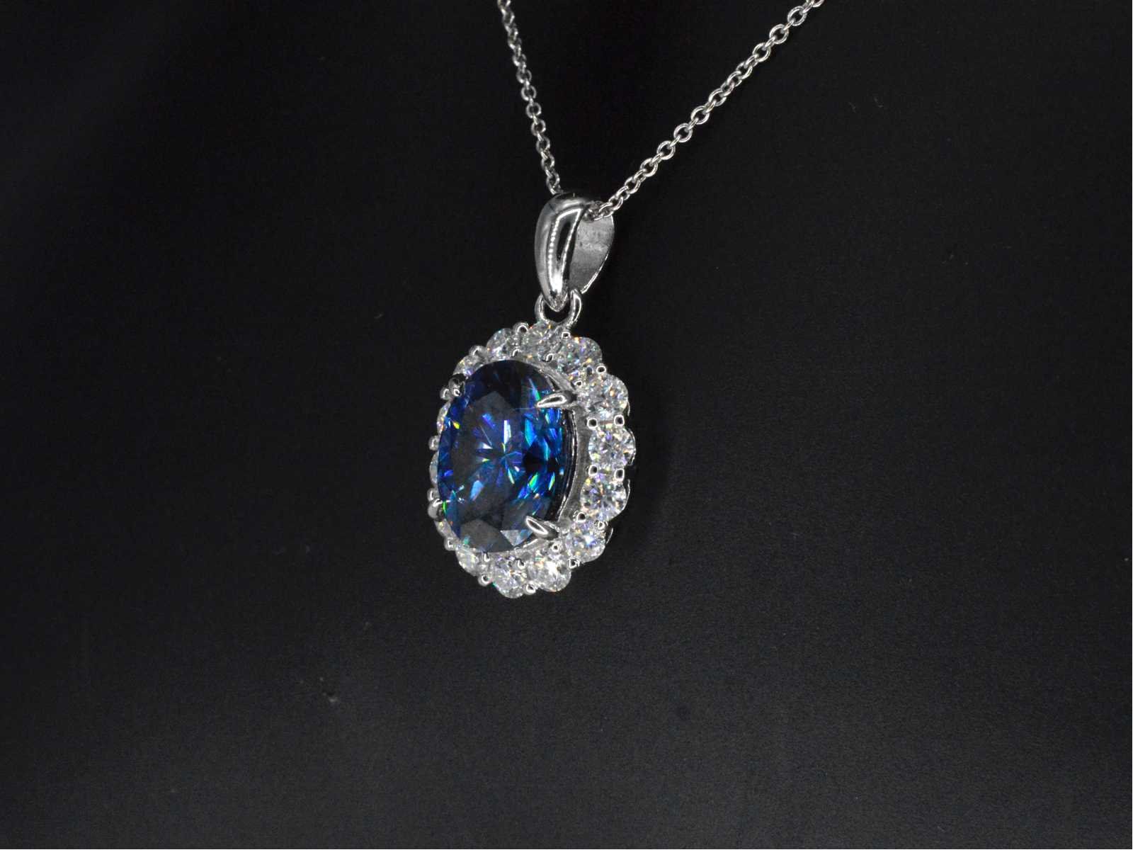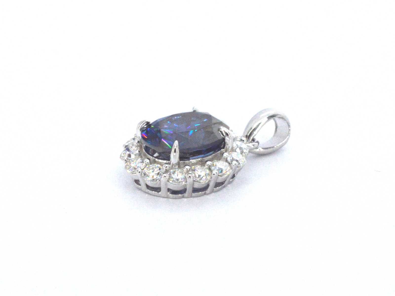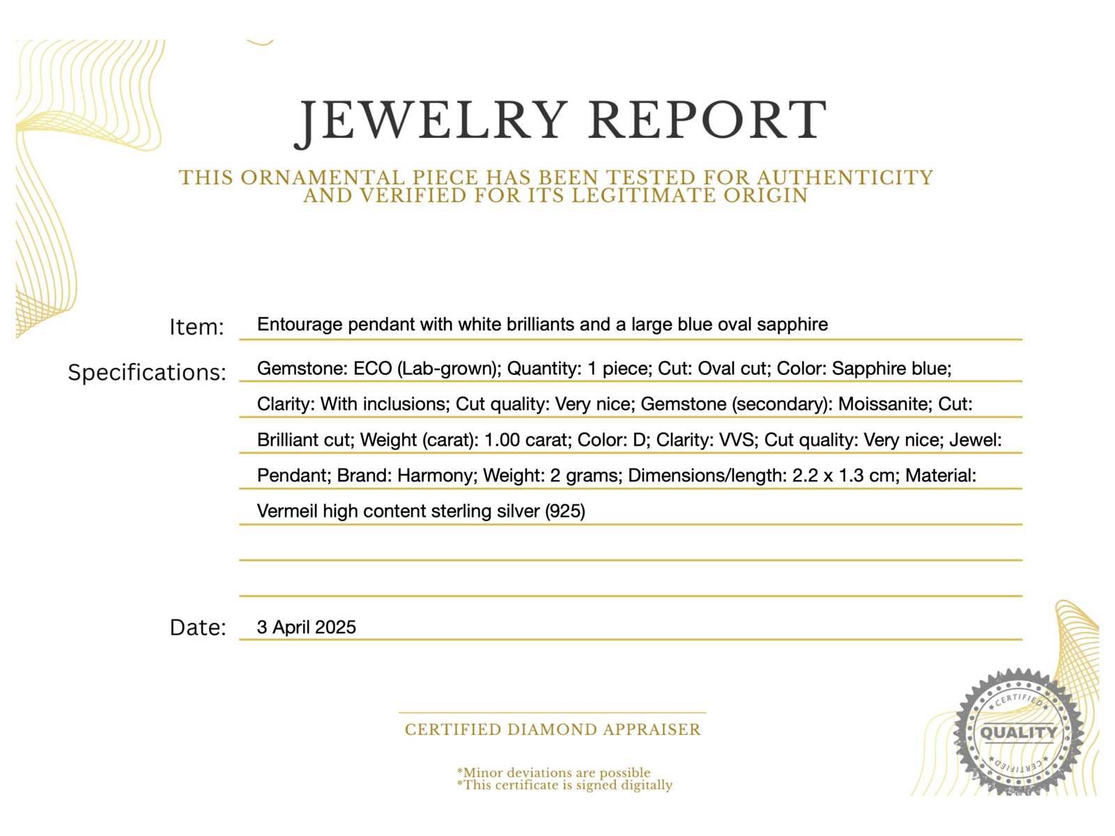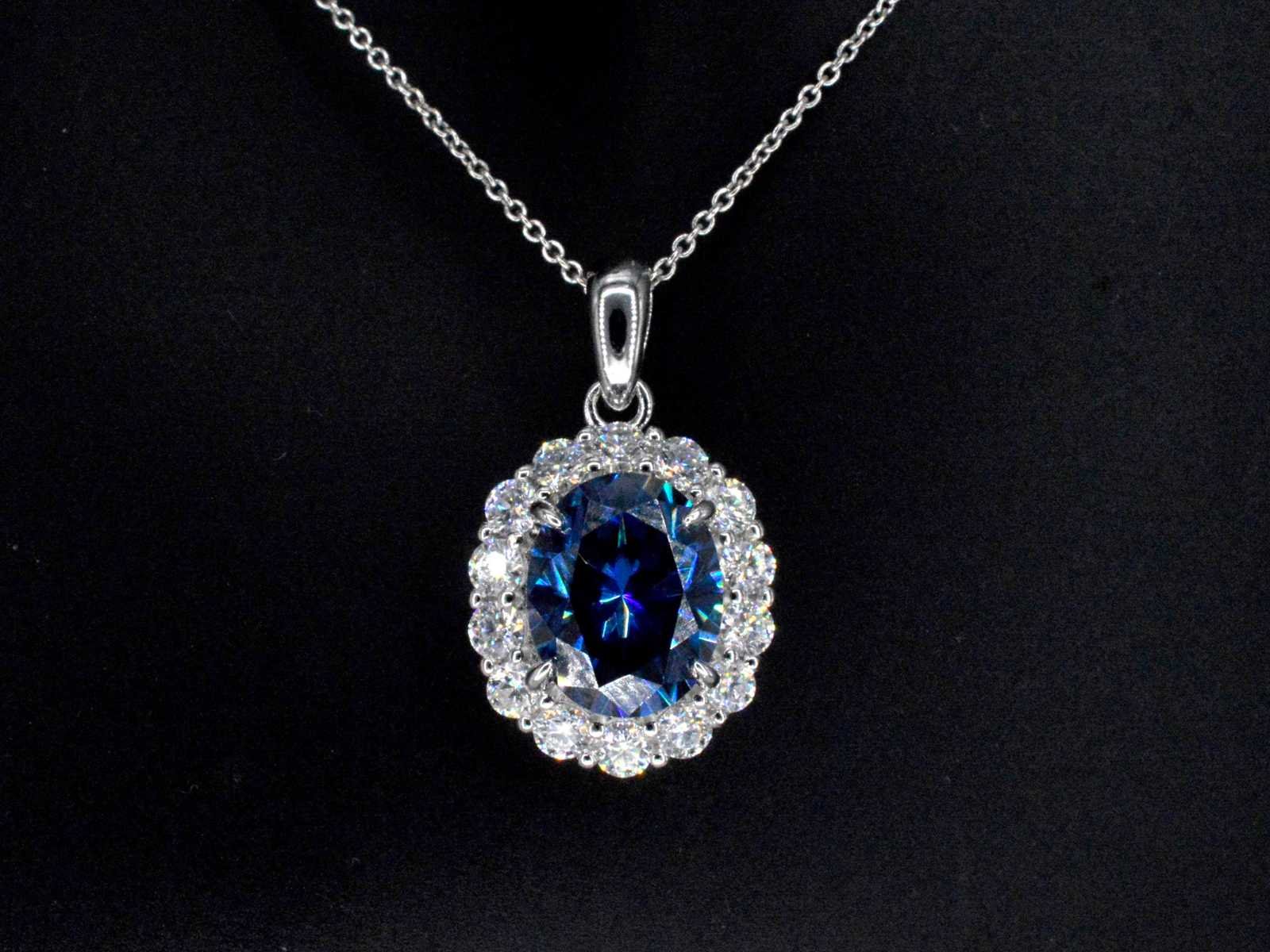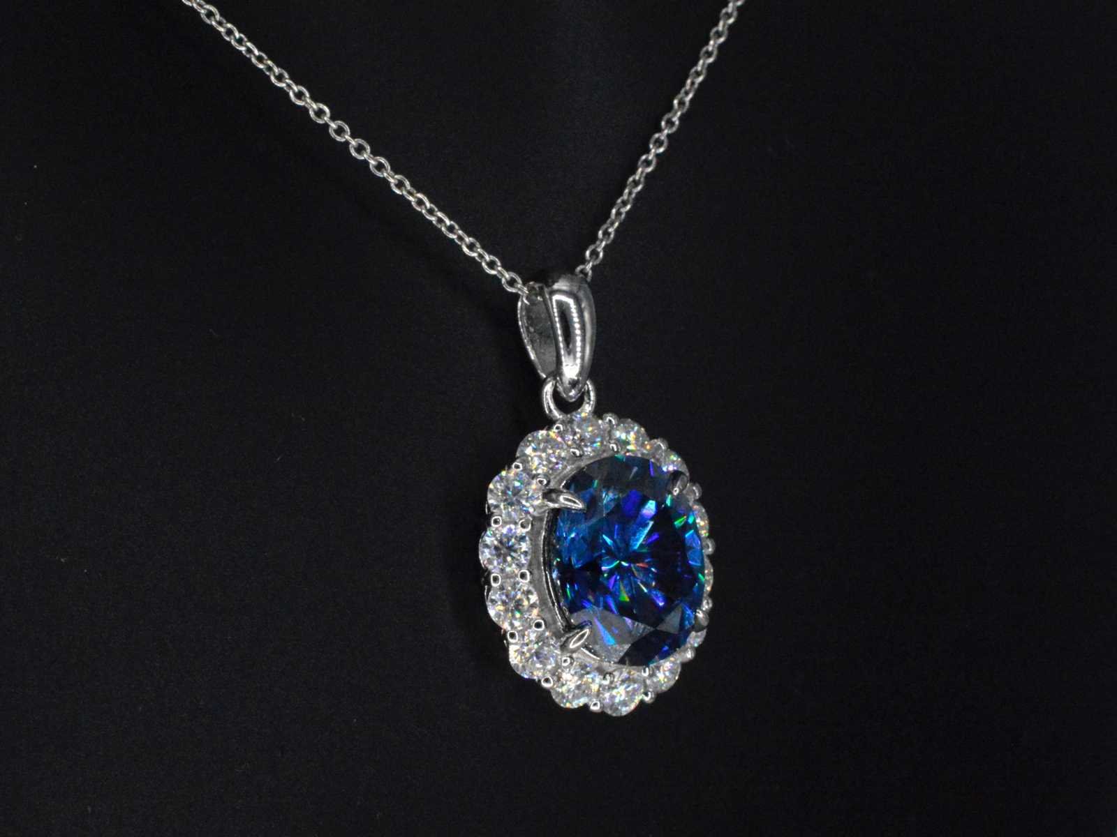 Samenvatting van gegevens Entourage hanger met witte briljanten en een grote saffier blauwe ovaal Edelsteen: ECO (Lab-grown); Aantal: 1 stuk; Slijpvorm: Ovaal geslepen; Kleur: Saffier blauw; Zuiverheid: Met insluitsels; Slijpkwaliteit: Zeer mooi; Edelsteen (secundair): Moissaniet; Slijpvorm: Briljant geslepen; Gewicht (carat): 1.00 carat; Kleur: D; Zuiverheid: VVS; Slijpkwaliteit: Zeer mooi; Juweel: Hanger; Merk: Harmony; Gewicht: 2 gram; Afmetingen/lengte: 2.2 x 1.3 cm; Materiaal: Vermeil hoog gehalte sterling zilver (925); Conditie: Nieuw; Verpakking: sieradendoos of fluwelen etui; Toelichting: De kwaliteit is overgenomen van het rapport behorend bij item. De waardebepaling is een beoordeling van een gecertificeerde diamantair, gebaseerd op consumentenprijzen.; Extra informatie: Het gemeten gewicht van de edelstenen is volgens diamant maten; Consumentenprijs: € 1.400,- Within 14 days Materiaal: Zilver Edelsteen: ECO (Lab-grown) Kleur edelsteen: Saffier blauw Slijpvorm edelsteen: Ovaal geslepen Slijpkwaliteit edelsteen: Zeer mooi Zuiverheidsgraad edelsteen: Met insluitsels Totaal gewicht: 2g Keurmerk: 925