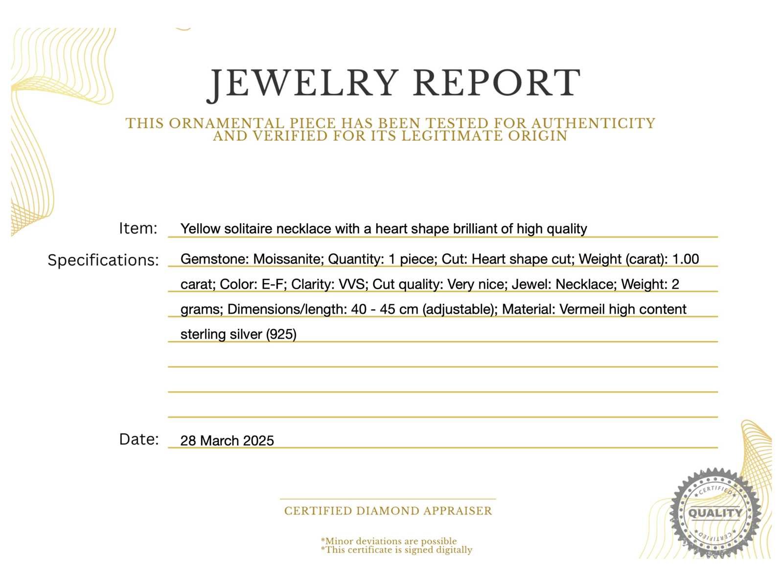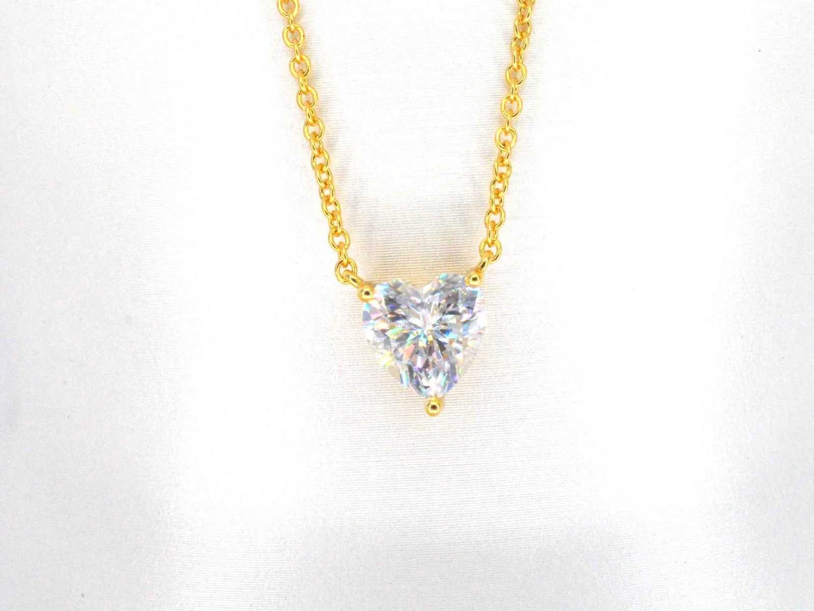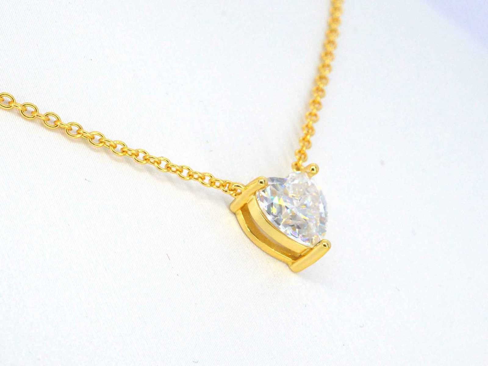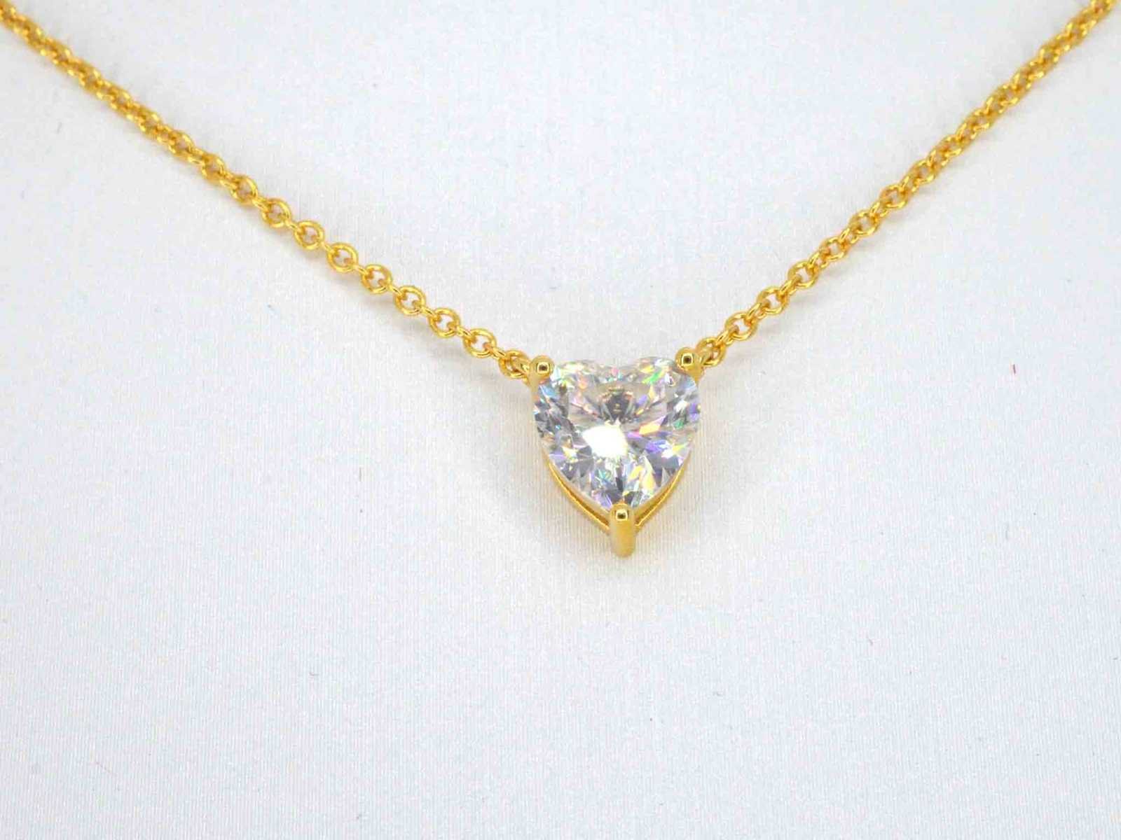 Samenvatting van gegevens Gele solitair halsketting met een hart vorm briljant van hoge kwaliteit Edelsteen: Moissaniet; Aantal: 1 stuk; Slijpvorm: Hart vorm geslepen; Gewicht (carat): 1.00 carat; Kleur: E-F; Zuiverheid: VVS; Slijpkwaliteit: Zeer mooi; Juweel: Halsketting; Merk: Harmony; Gewicht: 2 gram; Afmetingen/lengte: 40 - 45 cm (verstelbaar); Materiaal: Vermeil hoog gehalte sterling zilver (925); Conditie: Nieuw; Verpakking: Sieradendoos of fluwelen etui; Toelichting: De kwaliteit is overgenomen van het rapport behorend bij item. De waardebepaling is een beoordeling van een gecertificeerde diamantair, gebaseerd op consumentenprijzen.; Extra informatie: Het gemeten gewicht van de edelstenen is volgens diamant maten; Consumentenprijs: € 960,- Within 14 days Materiaal: Zilver Edelsteen: Moissaniet Kleur edelsteen: E-F Totaal gewicht: 2g Keurmerk: 925 Slijpkwaliteit edelsteen: Zeer mooi Slijpvorm edelsteen: Hart vorm geslepen Zuiverheidsgraad edelsteen: VVS