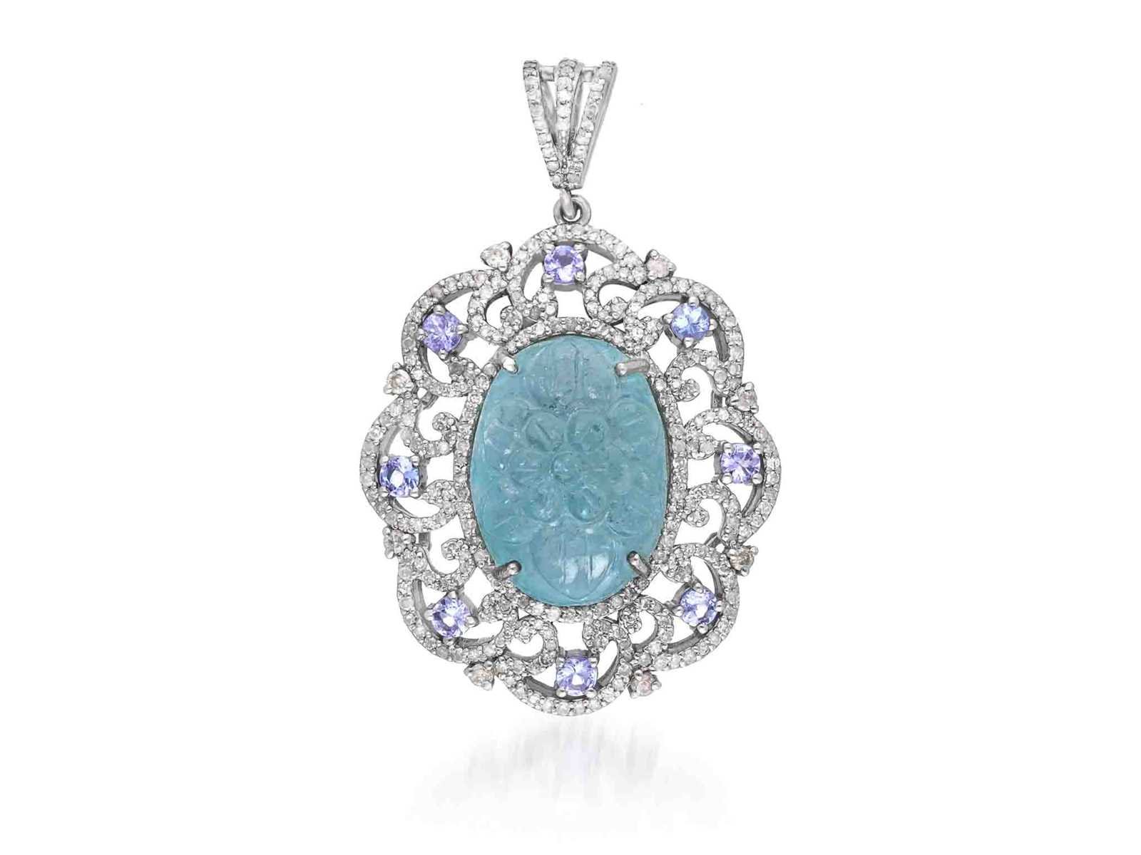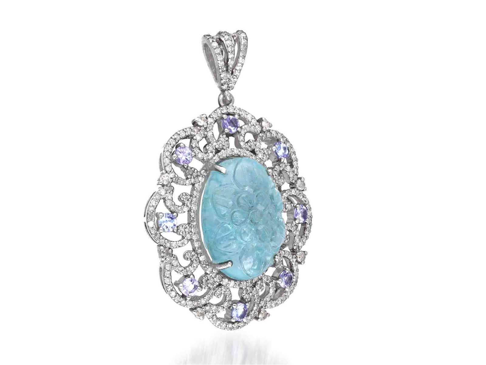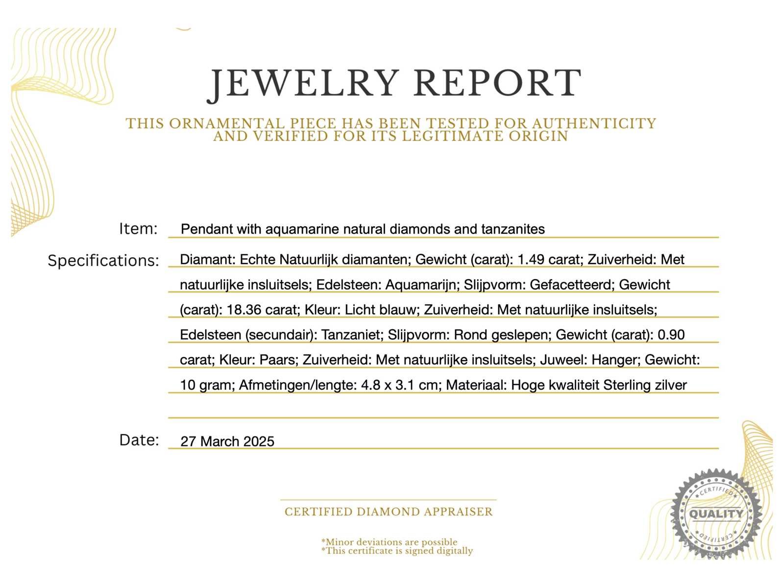 Samenvatting van gegevens Hanger met aquamarijn natuurlijke diamanten en tanzanieten Diamant: Echte Natuurlijk diamanten; Gewicht (carat): 1.49 carat; Zuiverheid: Met natuurlijke insluitsels; Edelsteen: Aquamarijn; Slijpvorm: Gefacetteerd; Gewicht (carat): 18.36 carat; Kleur: Licht blauw; Zuiverheid: Met natuurlijke insluitsels; Edelsteen (secundair): Tanzaniet; Slijpvorm: Rond geslepen; Gewicht (carat): 0.90 carat; Kleur: Paars; Zuiverheid: Met natuurlijke insluitsels; Juweel: Hanger; Gewicht: 10 gram; Afmetingen/lengte: 4.8 x 3.1 cm; Materiaal: Hoge kwaliteit Sterling zilver; Conditie: Vintage; Verpakking: Sieradendoos of fluwelen etui; Toelichting: De kwaliteit is overgenomen van het rapport behorend bij item. De waardebepaling is een beoordeling van een gecertificeerde diamantair, gebaseerd op consumentenprijzen.; Extra informatie: Dit is een met de hand vervaardigd sieraad.; Consumentenprijs: € 3.345,- Within 14 days Materiaal: Zilver Voornaamste diamant: Echte Natuurlijk diamanten Gewicht diamant: 1.49ct Zuiverheidsgraad diamant: Met natuurlijke insluitsels Edelsteen: Aquamarijn Kleur edelsteen: Licht blauw Slijpvorm edelsteen: Gefacetteerd Zuiverheidsgraad edelsteen: Met natuurlijke insluitsels Totaal gewicht: 10g