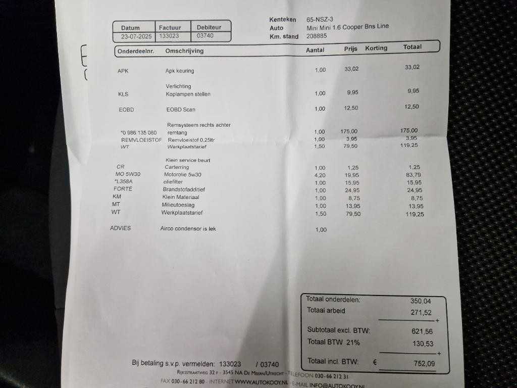 Banden 175/65 r15..h Velgen 5.5jx15 lm 1598ccm 88kw 2-lagen uni 6-versn wisselbak Airconditioning Armleuning v opklapb Bekleding stof Boordcomputer Chroomline exterieur Dak / spiegel zwart Dynam stabi-control Mistlamp m parkeerl Multif-stuurwiel Radio wave cd Sportstuur leer Va 09/2009 Voorruit regensensor Merkspecifieke pakketten & opties 530 : Airconditioning 550 : Boordcomputer 346 : Chrome Line Exterieur 240 : Leder stuurwiel 2RL : Lichtmetalen wielen Rotator Spoke 520 : Mistlampen voor 249 : Multifunctioneel stuurwiel 521 : Regen- en lichtsensor Kenteken: 65-NSZ-3 Merk: Mini Model: Mini Type: 1.6 Cooper Business Line Bouwjaar: 2010 Afgelezen kilometerstand: 212398km Cilinderinhoud: 1598cc Vermogen (kW): 88kW Brandstof: Benzine Chassisnummer: WMWMF31060TZ40556 NAP status: Logisch Datum eerste toelating: 2010-11-25 Datum eerste toelating (NL): 2010-11-25 APK vervaldatum: 2026-08-08 Vermogen (pk): 118hp Aandrijving: Start en rijdt Aantal zitplaatsen: 4 Kleur: wit Transmissie: H6 Emissieklasse: 4 Aantal deuren: 2 Aantal sleutels: 1 Ledig gewicht: 1040kg Bruto BPM (NL): 3843€ Aantal cilinders: 4 Carrosserie: Hatchback Carfax Link: https://was.carfax.eu/v0/api/ccdid/5100016408/svc/201/vinreg/65NSZ3/checksum/eyJhbGciOiJIUzI1NiIsInR5cCI6IkpXVCJ9.eyJleHAiOjE3NzMxNTI3MTV9.HISf3hfWmp00KG6GyhkHR1I960DKl5YPR9J8gL3NeKQ Start en rijdt: Start and drive startinformatie : Start en rijdt
