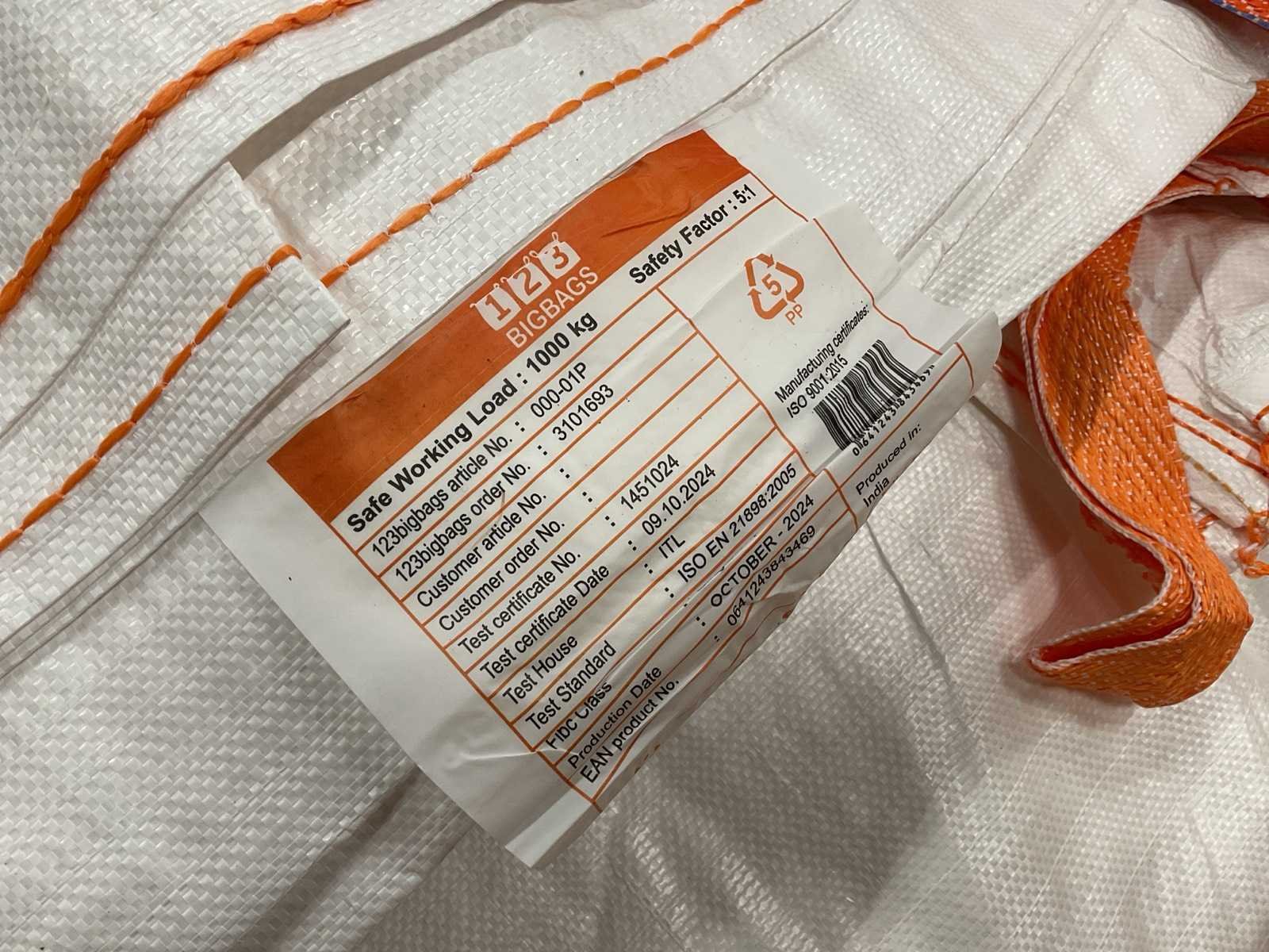 Bestaande uit: 1x asbest-zak, 10x 1000kg afsluitbaar, 29x 1000kg, 13x 1500kg en 7x 2000kg.