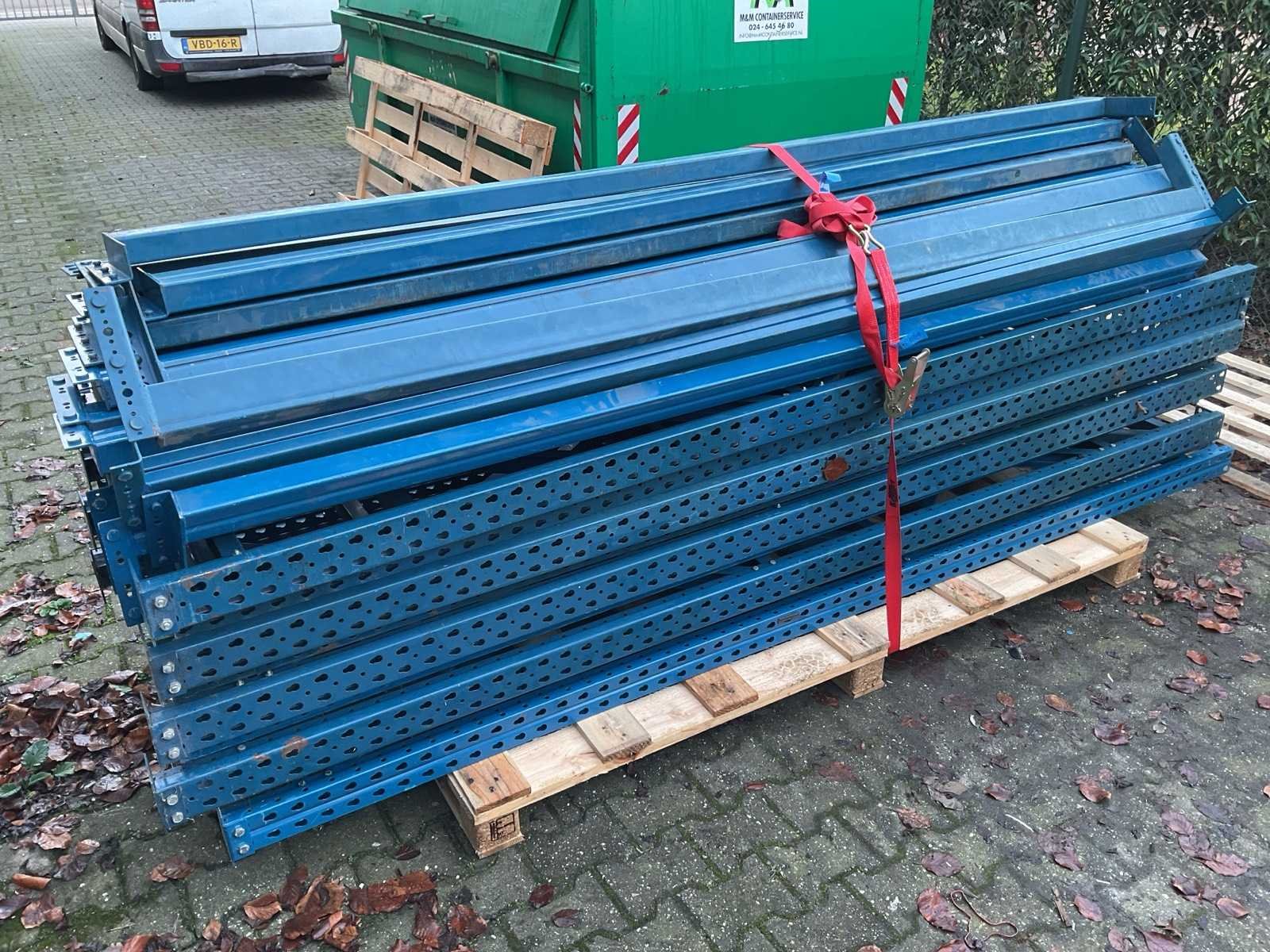 Bestaande uit: 9x juk, afm. ca. H300xB90cm en 34x ligger, lengte ca. 270cm. Materiaal: Metaal