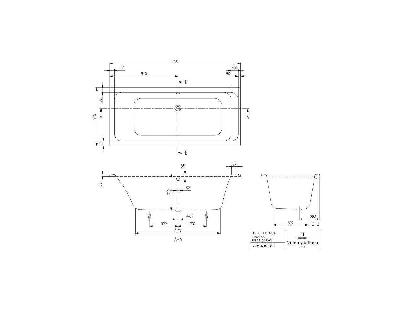 Villeroy & boch bt architectura 180x80cm uba10ara2v-01 duobad