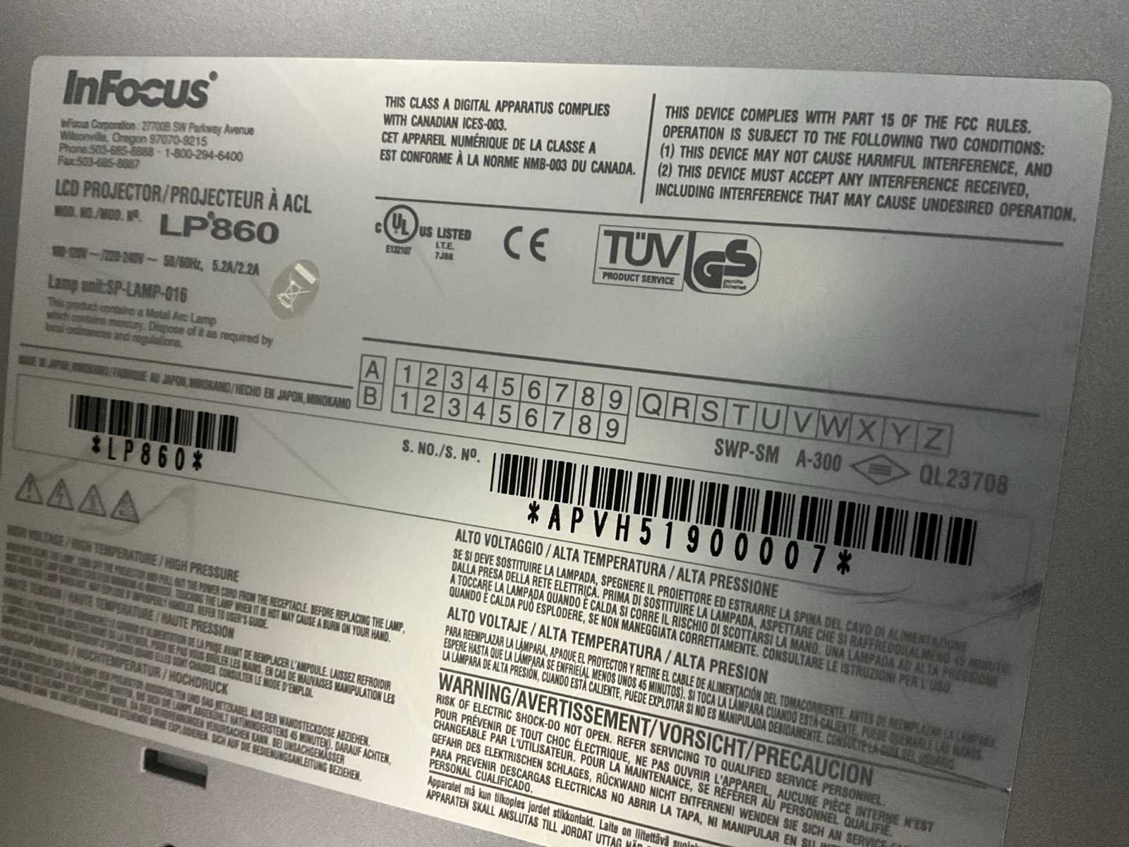 Reserve lamp en lucht filter, Merk: Infocus Type: LP860 Eigen gewicht: 8kg Serienummer: APVH5190007 Output: 4500lm Afstandsbediening: true Aansluiting: 230V