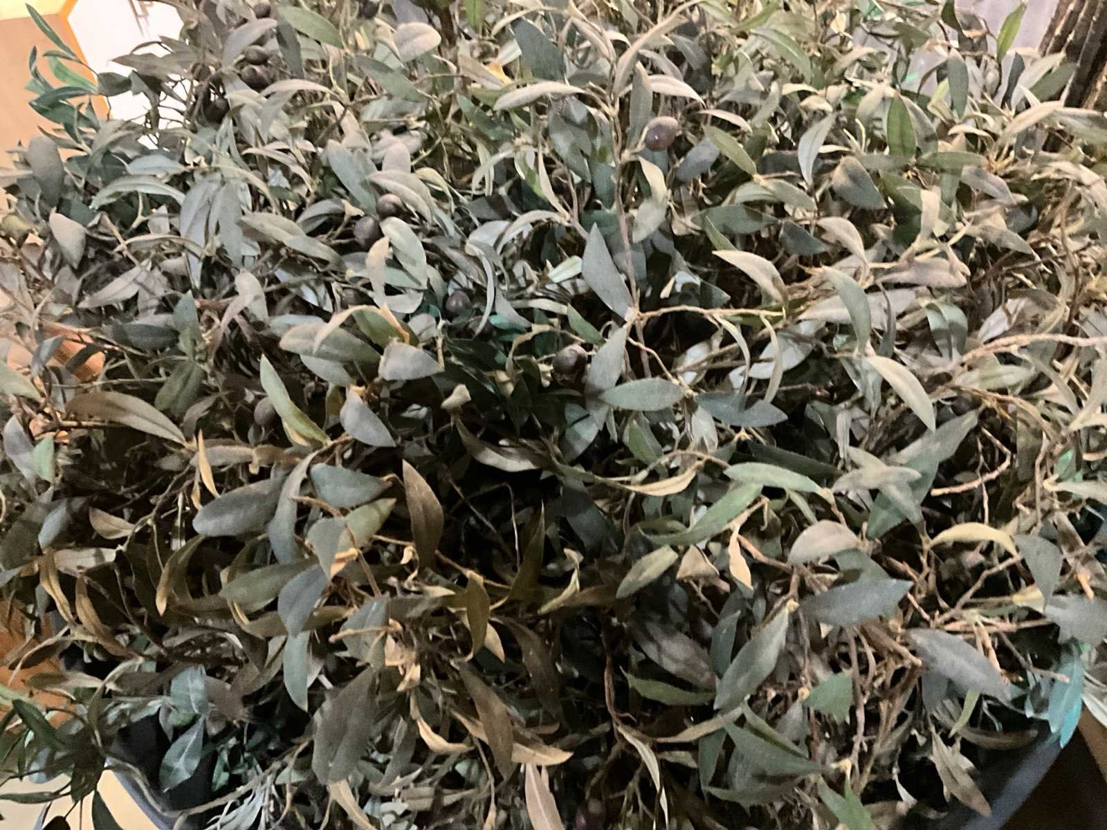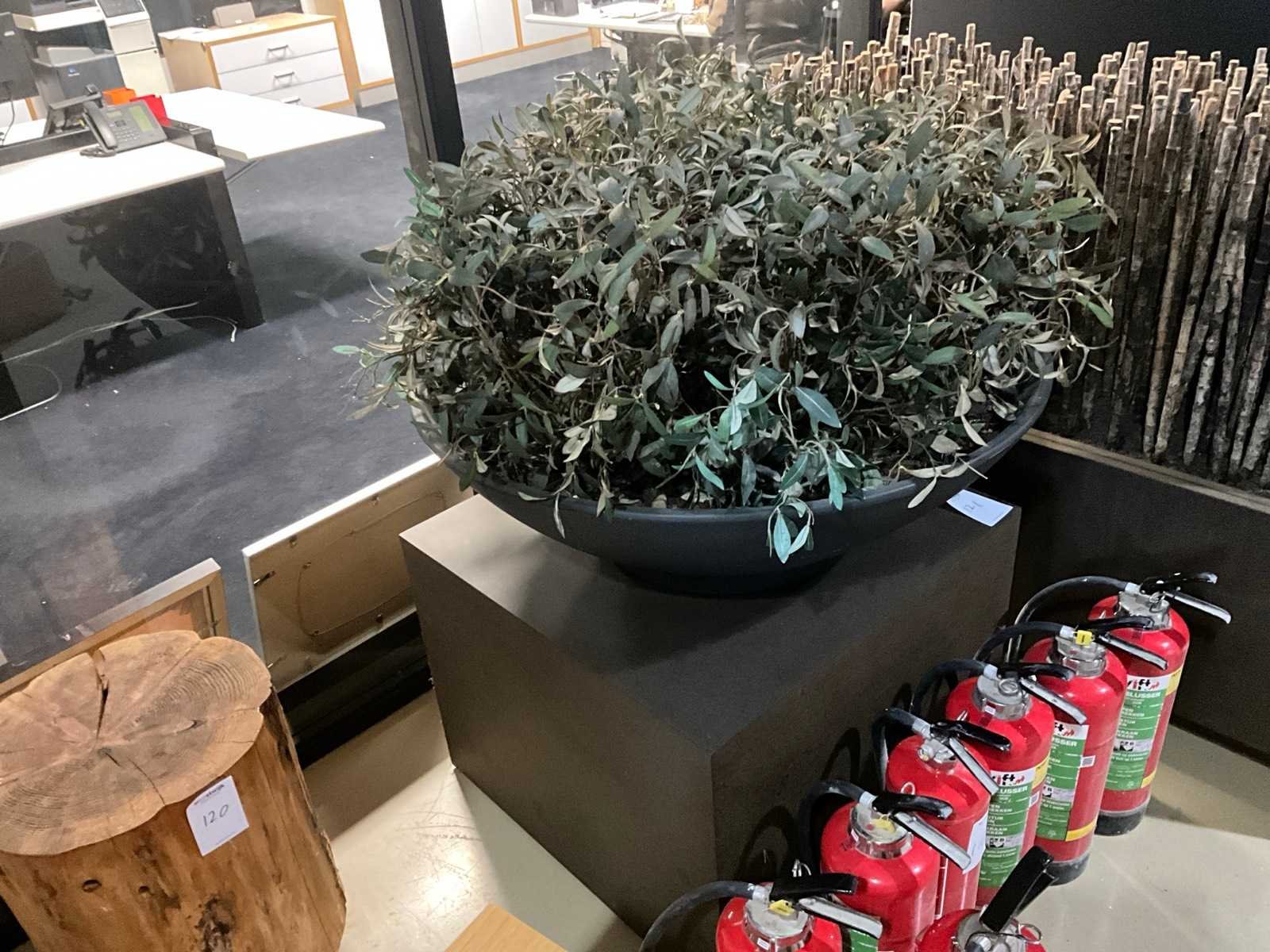 Houten voet, ronde schaal met kunststof plant (olijf) Lengte: 100cm Breedte: 100cm Hoogte: 130cm