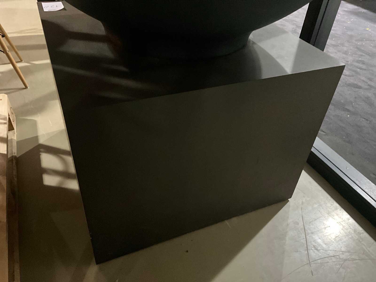 Houten voet, ronde schaal met kunststof plant (olijf) Lengte: 100cm Breedte: 100cm Hoogte: 130cm