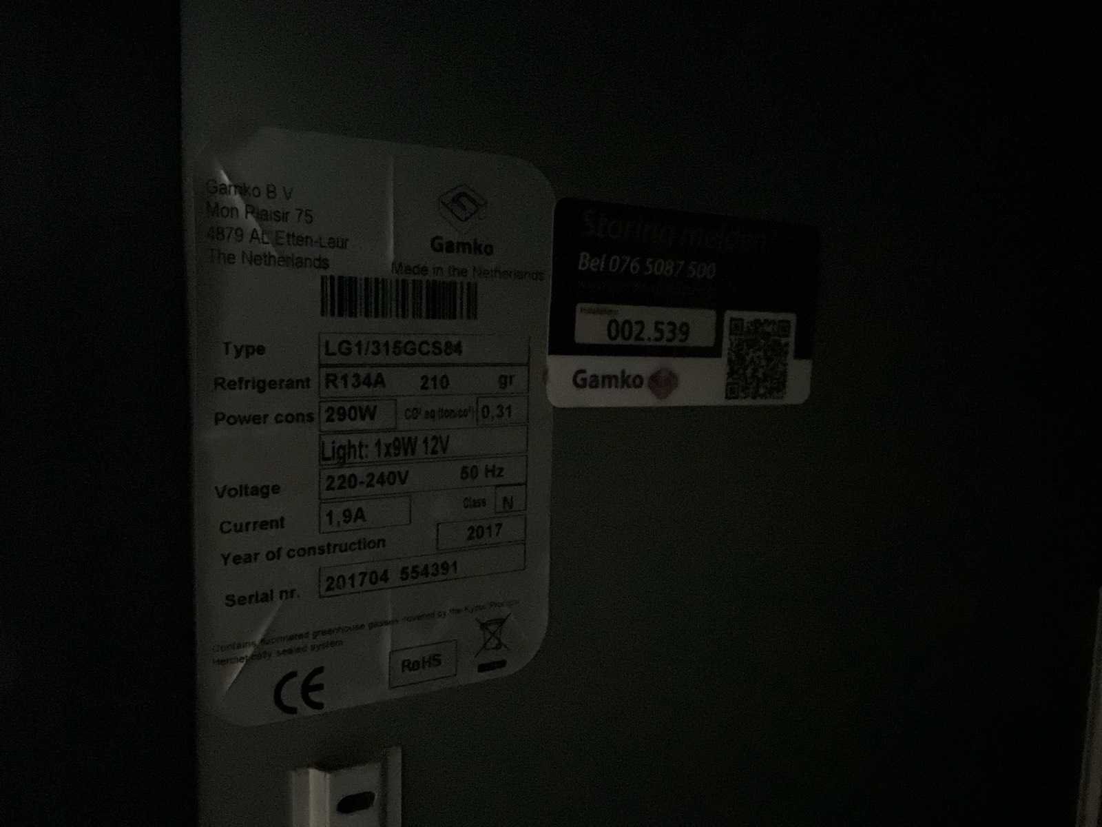 Merk: Gamko Type: LG1/315GCS84 Serienummer: 2014554391 Klapdeur(en): 3 Regelbare thermostaat: true Bouwjaar: 2017 Digitale uitlezing: true Aansluiting: 230V Totale afmeting Breedte: 1300mm Totale afmeting Hoogte: 850mm