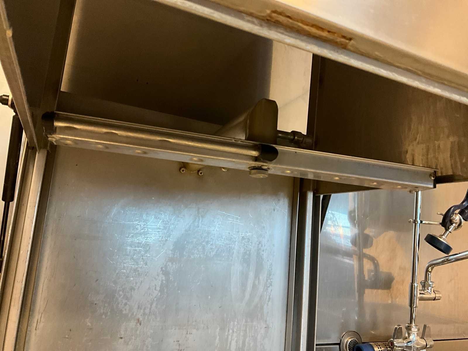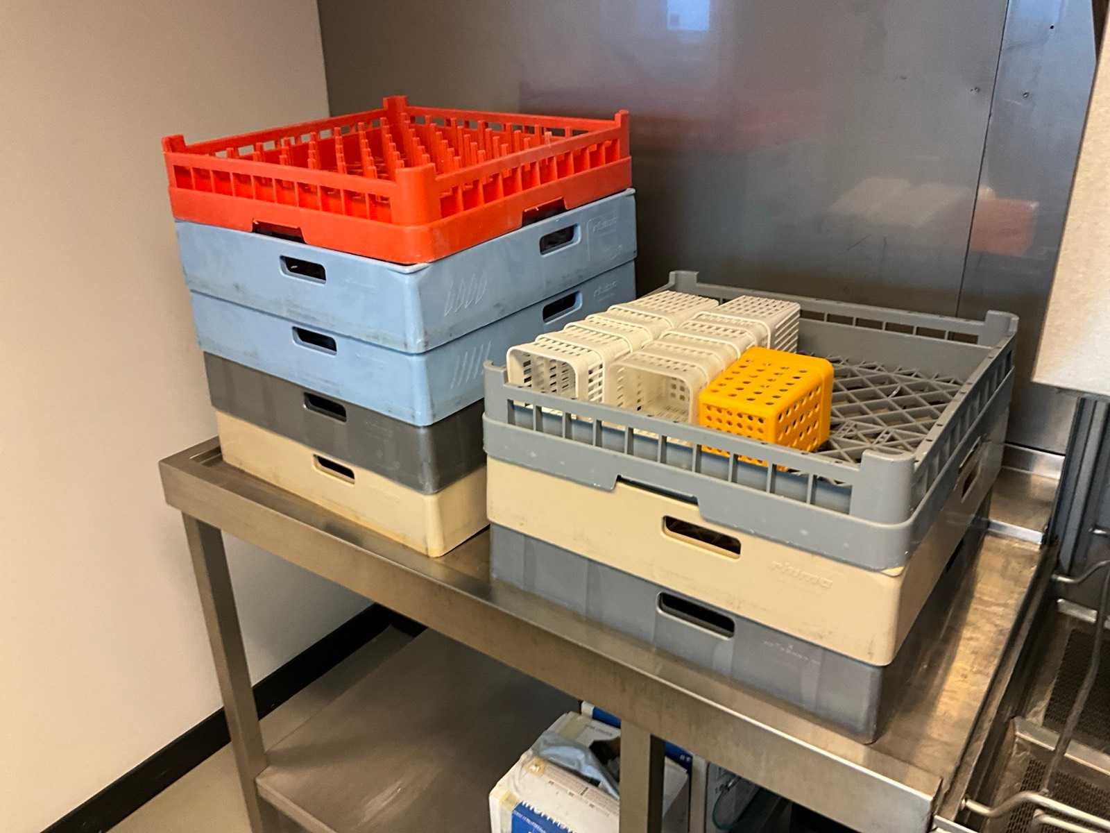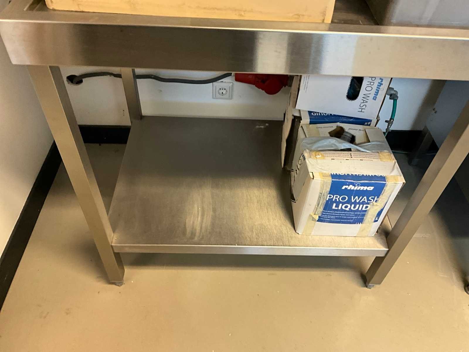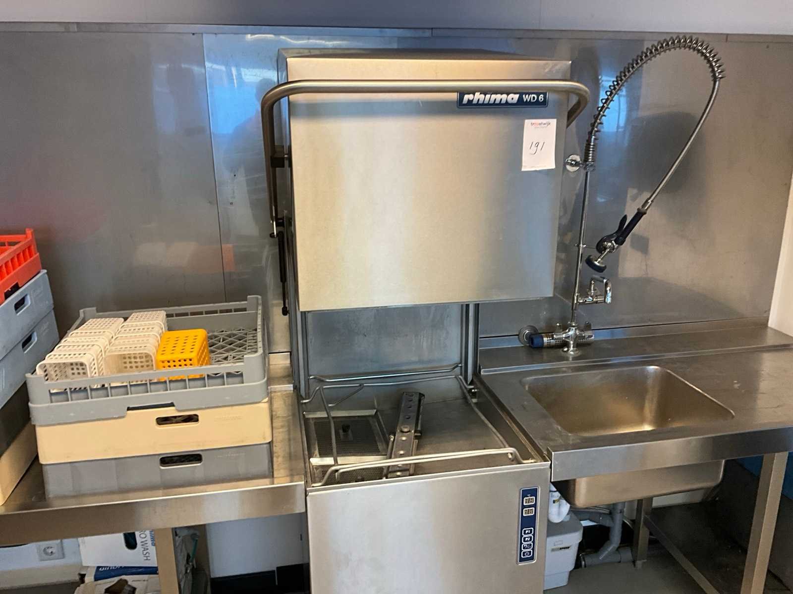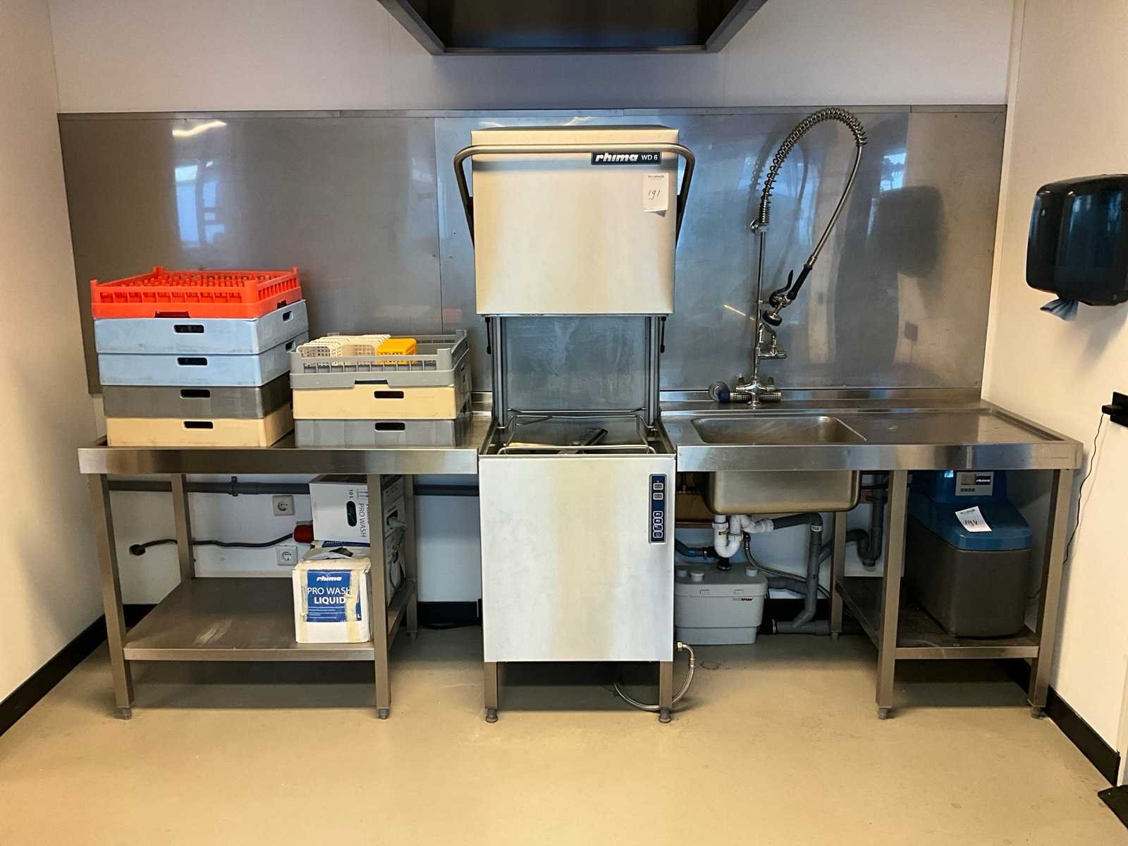 Complete doorschuif vaatwasser met RVS aanvoertafel met spoelbak, RVS afvoertafel, RVS achterwand, inclusief 8x vaatwas korven. Koper dient deze kavel zelf professioneel te demonteren. Merk: Rhima Model: WD 6 Spanning: 400V Lengte: 80cm Breedte: 300cm Hoogte: 200cm