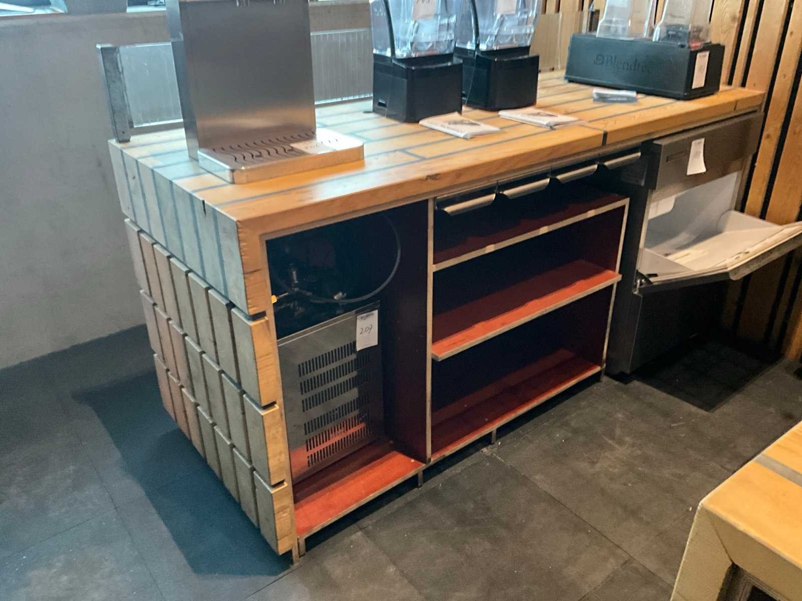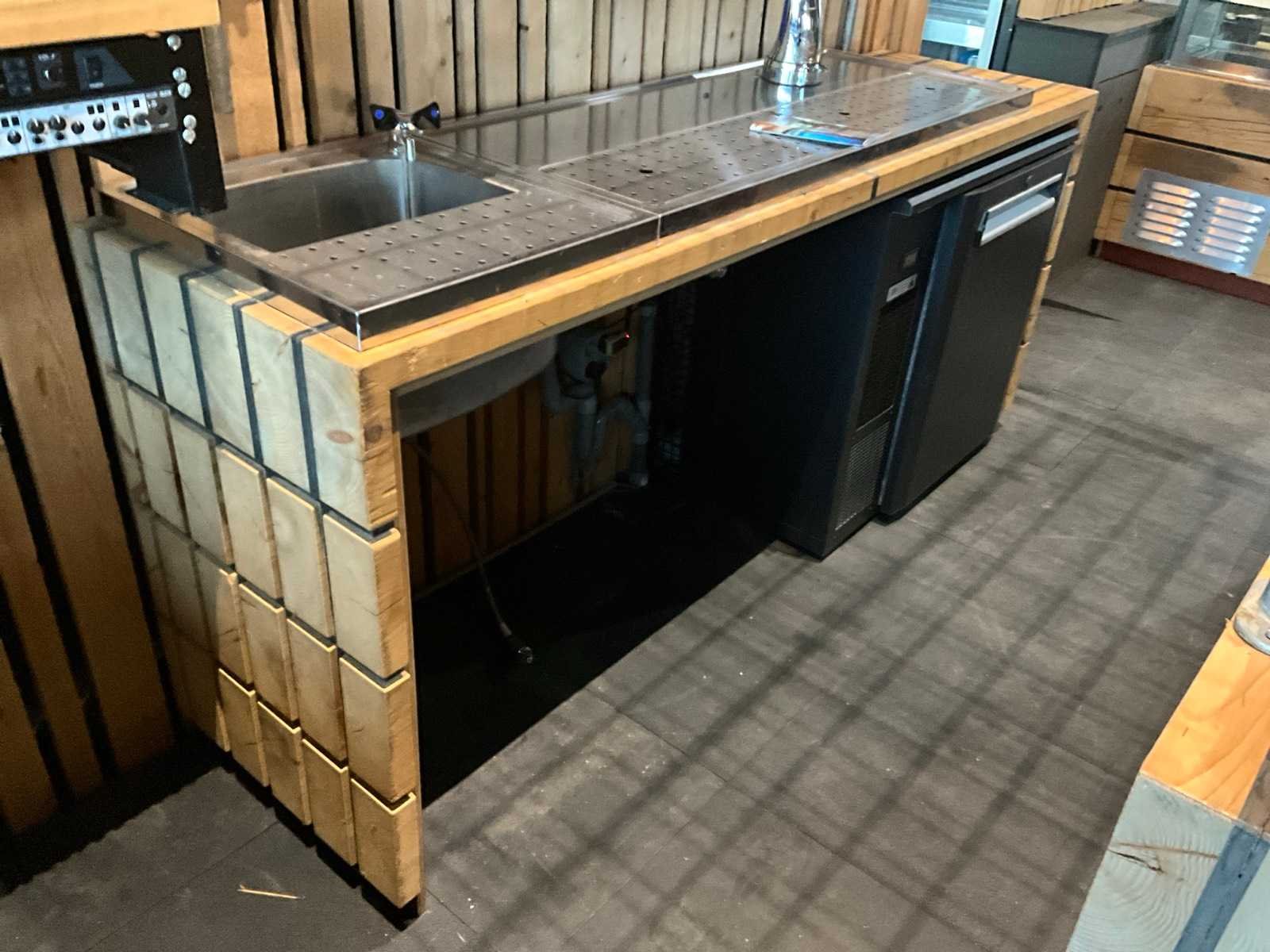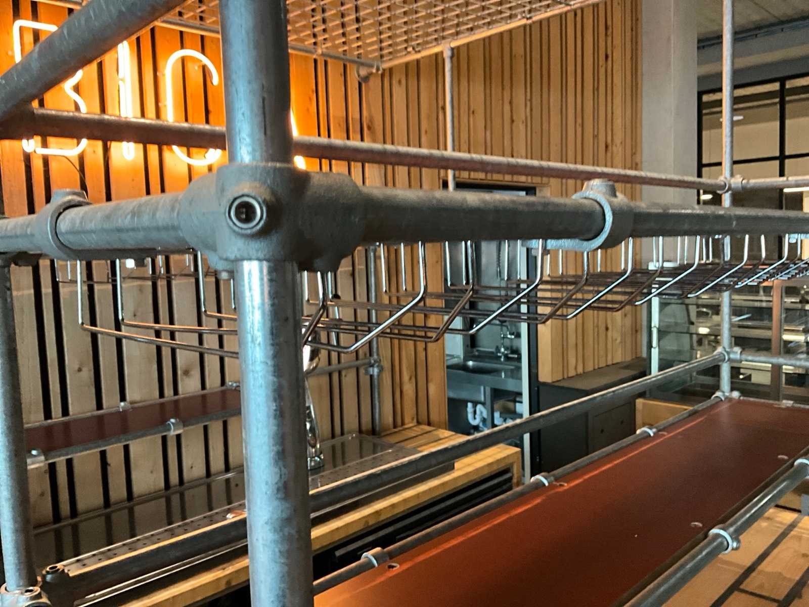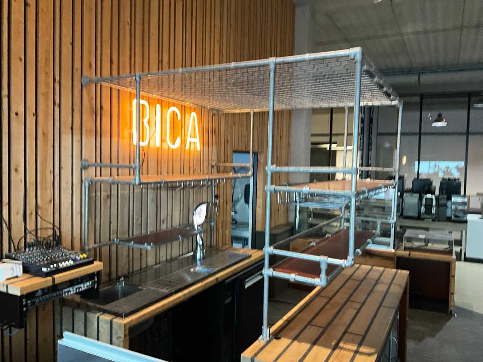 Unieke door de Bossche interieurbouwer Bomski handgemaakte houten bar uit onze espressobar, modulair opgebouwd, bestaande uit 1x stuk 4,5m breed, 1x stuk 2m breed met glazen achter rand, 2x stuk 2,1m breed, inclusief complete met daarop vloer rubberen anti-slip horeca tegels , steigerbuizen opbouw frame met legplanken en glashouders. Koper is zelf verantwoordelijk deze kavel professioneel te demonteren.