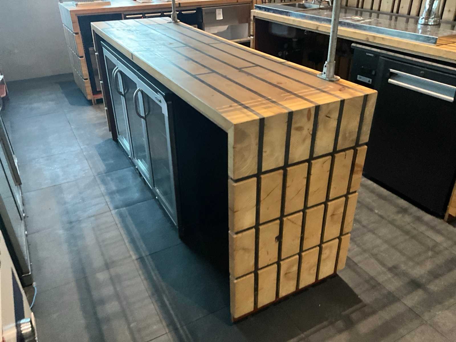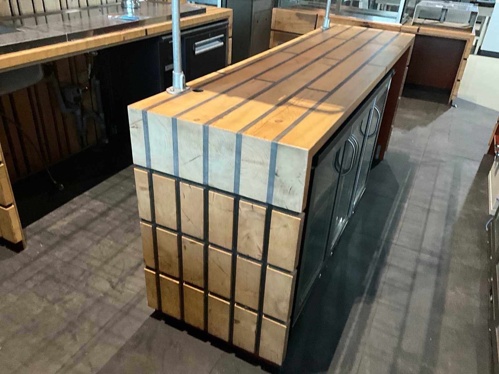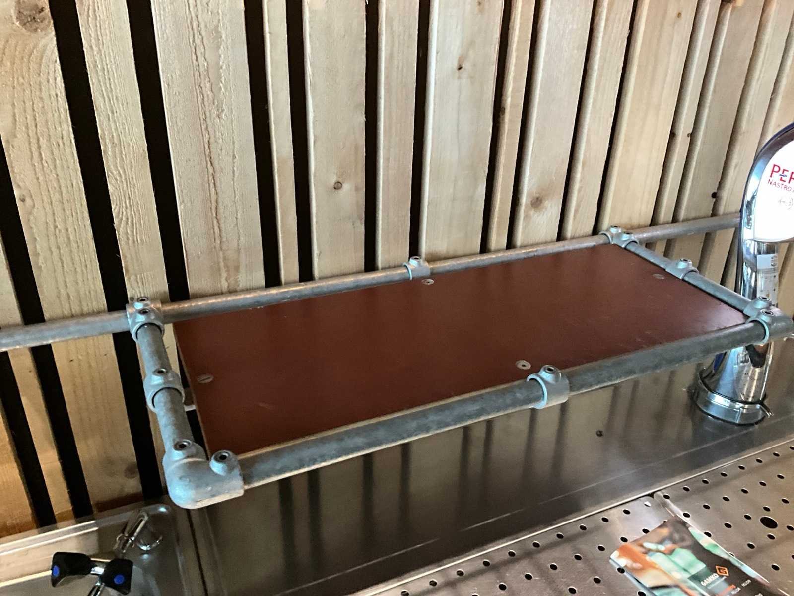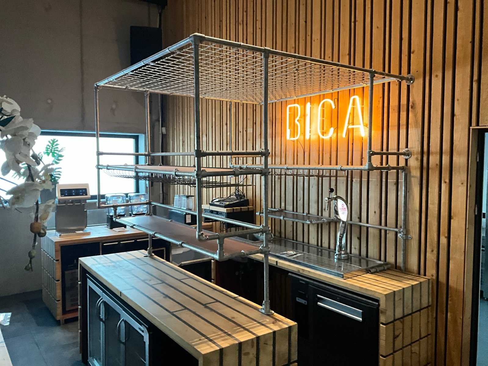 Unieke door de Bossche interieurbouwer Bomski handgemaakte houten bar uit onze espressobar, modulair opgebouwd, bestaande uit 1x stuk 4,5m breed, 1x stuk 2m breed met glazen achter rand, 2x stuk 2,1m breed, inclusief complete met daarop vloer rubberen anti-slip horeca tegels , steigerbuizen opbouw frame met legplanken en glashouders. Koper is zelf verantwoordelijk deze kavel professioneel te demonteren.