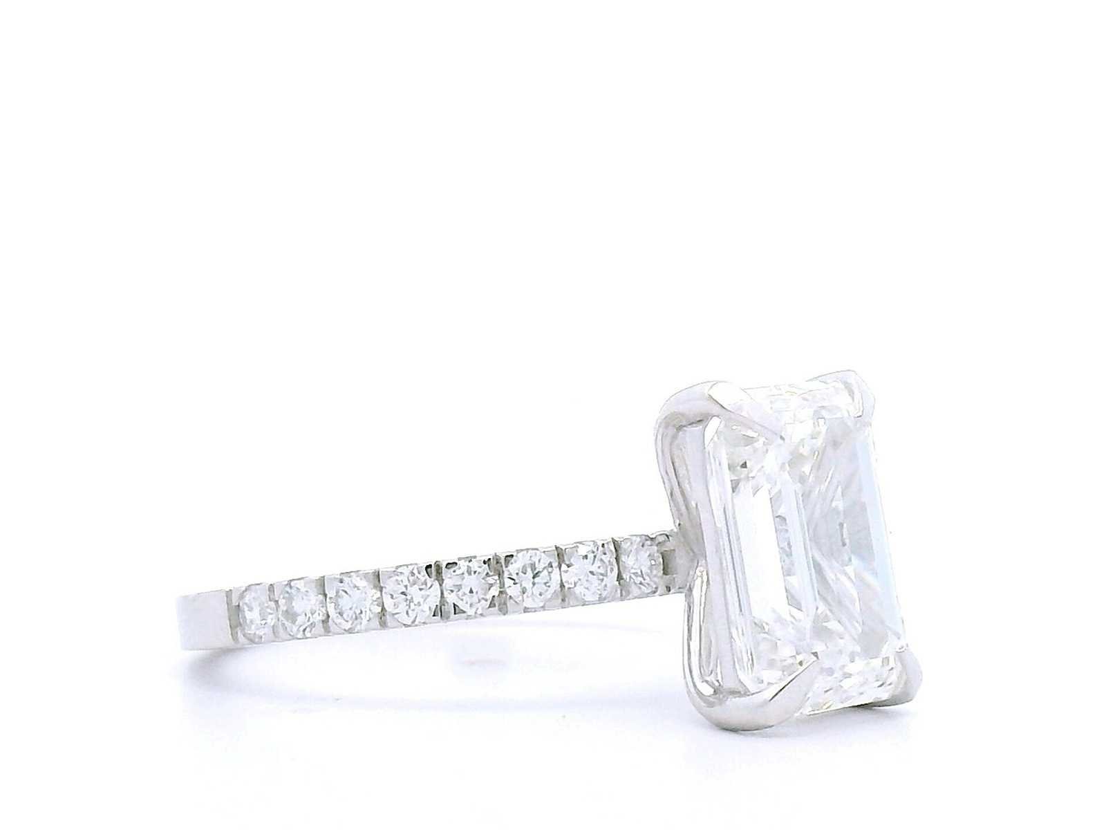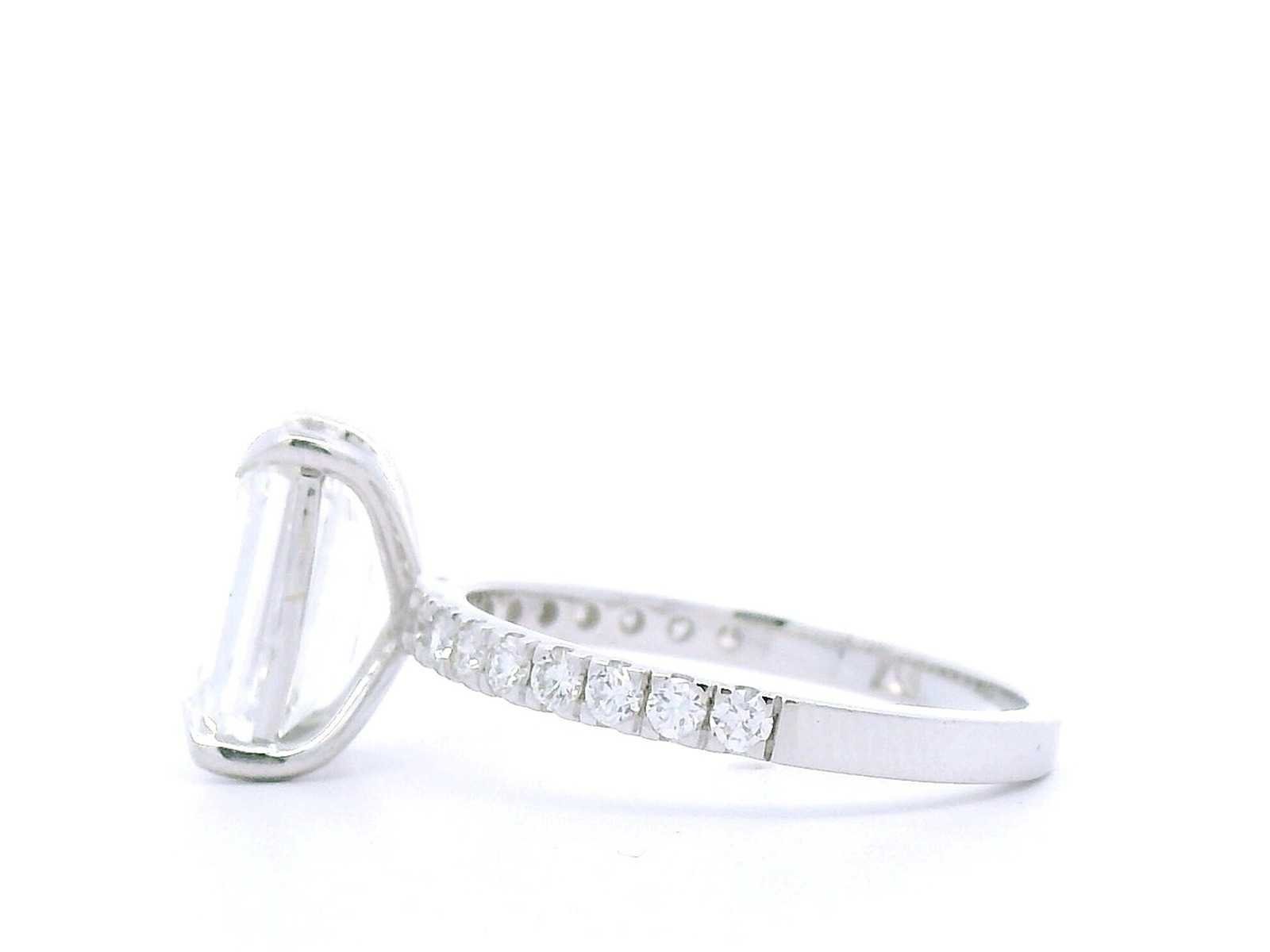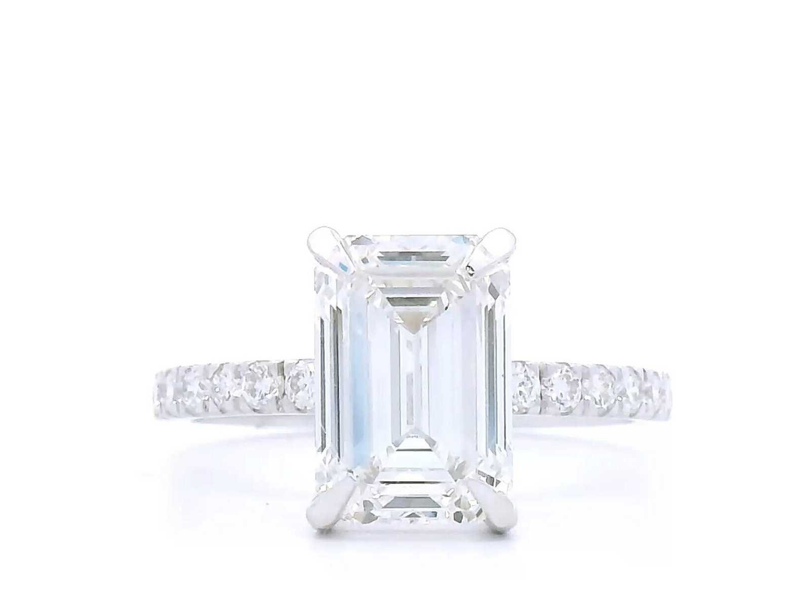 Exclusieve 18K witgouden ring Rapportnummer IGI: LG737530020 Vorm: Emerald Gewicht van de hoofdsteen : 3,09 CT Kleur: E Helderheid: VVS2 Snede: uitstekend Symmetrie: uitstekend Omringende stenen - 0,37 karaat (16 stuks) Totaal karaatgewicht - 3,46 karaat Bezichtiging op afspraak Materiaal: Witgoud Ringmaat : 55 Certificaat: Ja Lage schatting: 5800€