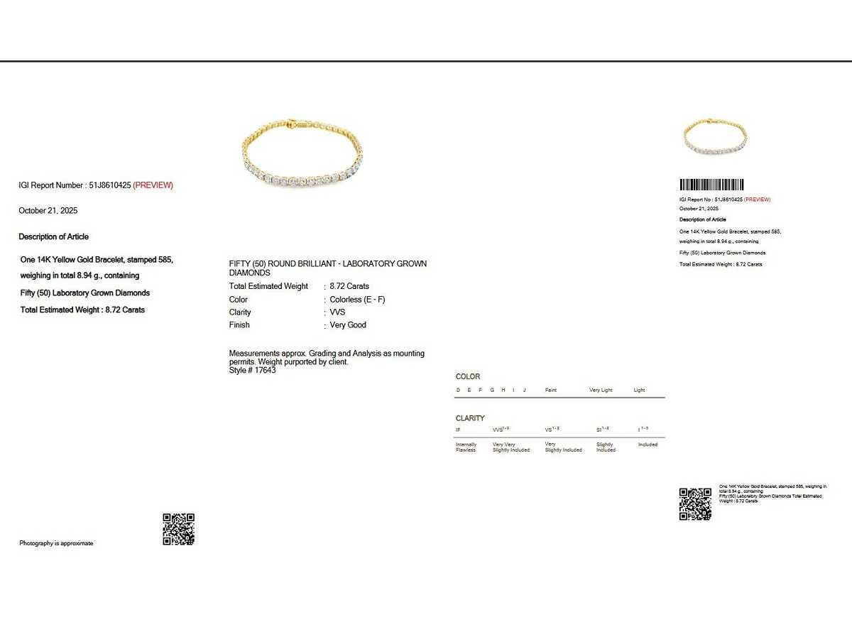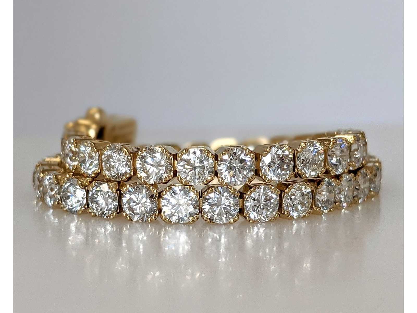 Exclusieve 14K geelgouden tennisarmband Totaal caraat: 8,72 Briljant geslepen Kleur: E-F Helderheid: VVS1 Aantal stenen: 50 Bezichtiging op afspraak Materiaal: Geelgoud Certificaat: Ja Lage schatting: 12200€