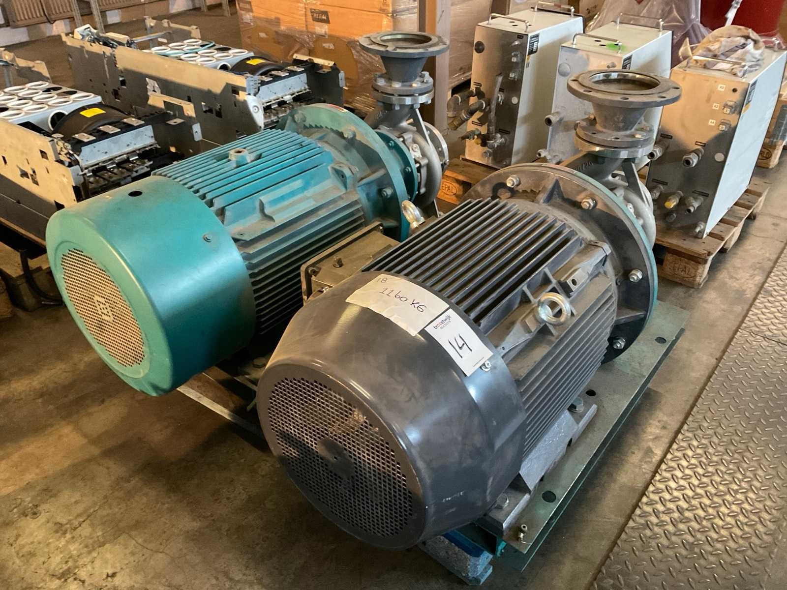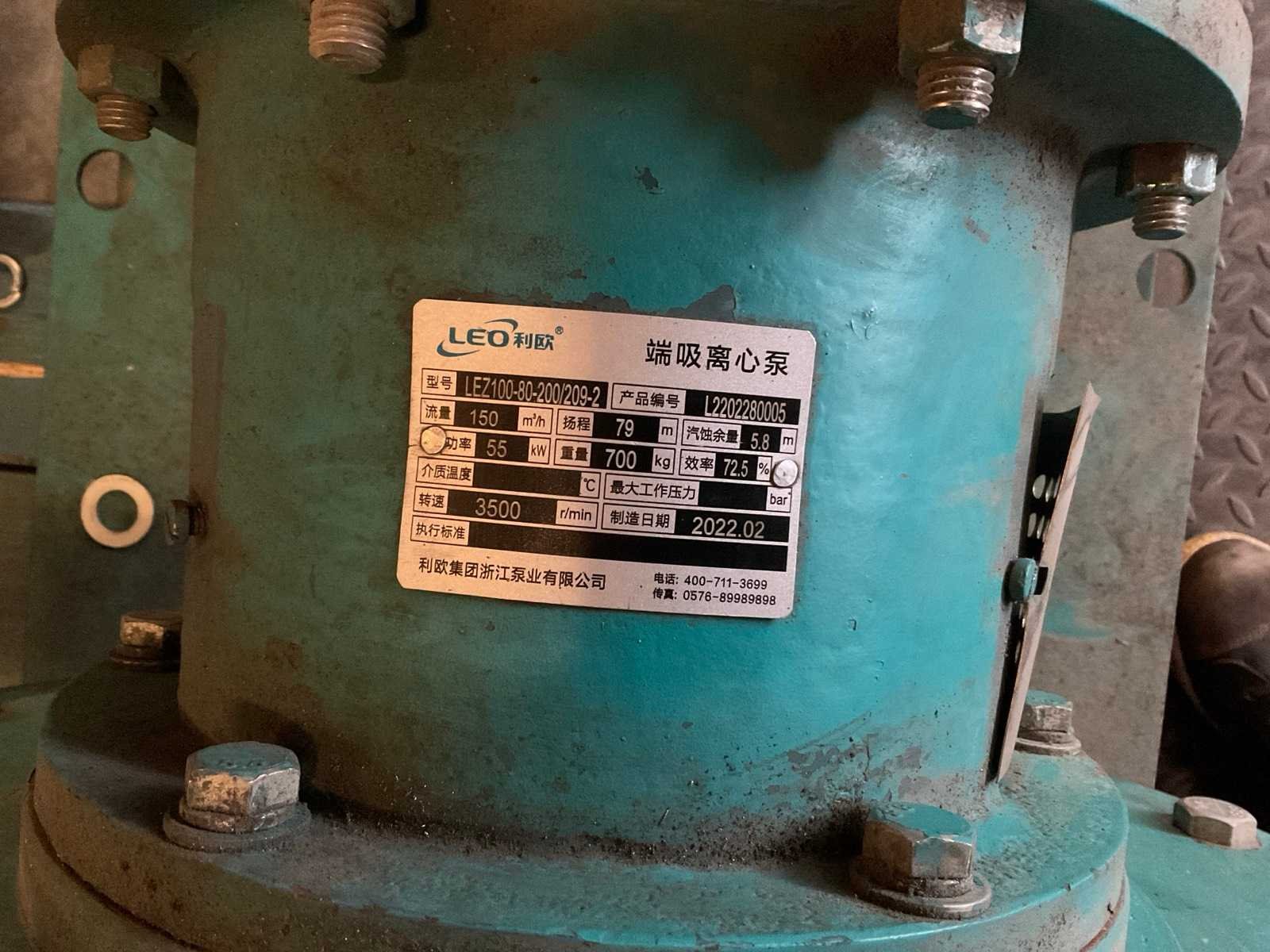 Elektromotor aandrijving 1x type YE2-250M-2 Merk: Leo Type: LEZ100-80-200/209-2 Serienummer: L2202280005/L2202280006 Vermogen: 55kW Capaciteit.: 150000l/hr H-max.: 79m Aansluiting: 400V Eigen gewicht: 1160kg Totale afmeting L: 1300mm Totale afmeting Breedte: 1300mm Totale afmeting Hoogte: 900mm