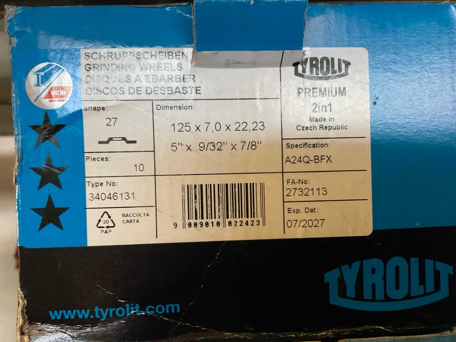 4x Doos à 9st 125x7.0x22.23, 1x doos à 125x2.5x22.23 Merk: Tyrolit Schijfdiameter: 125mm