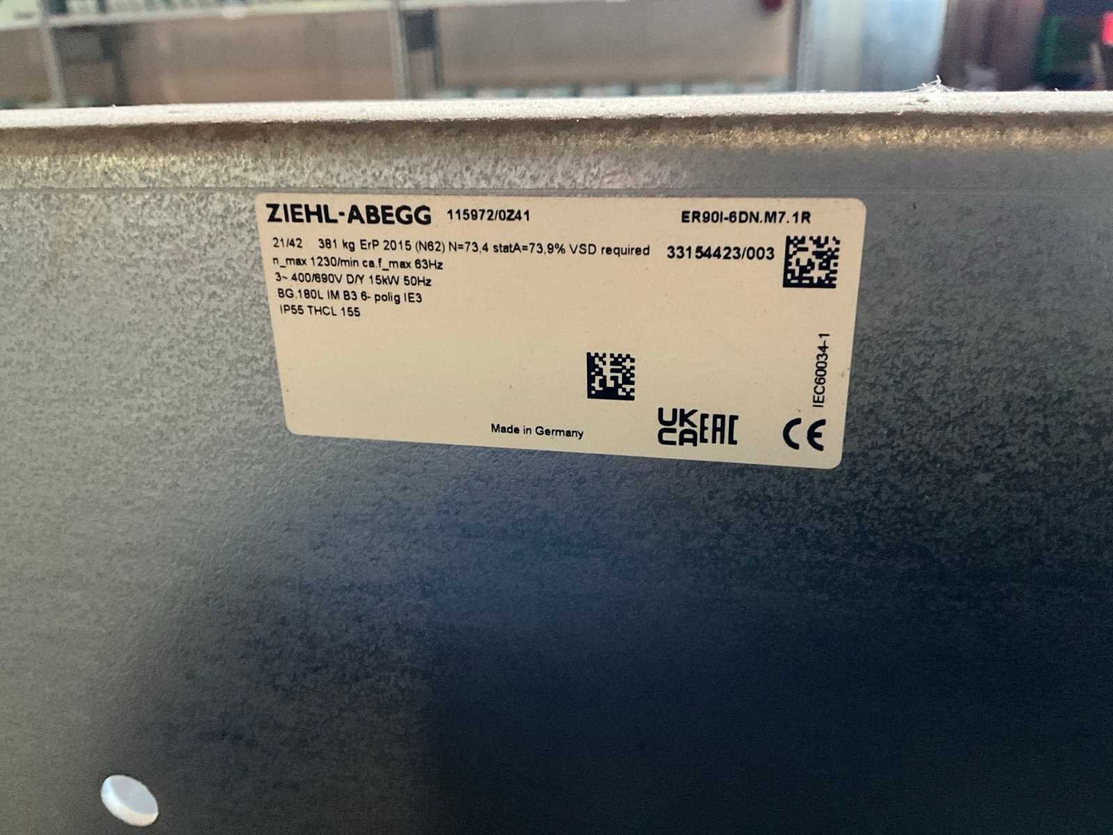 Flens maat circa: 118,5x118,5 cm, 1230 rpm, 400/690V, vermogen: 15 kW Merk: Zielh-Abegg Product type: ER90I-6DN.M7.1R Gewicht: 381kg Lengte: 130cm Hoogte: 123cm