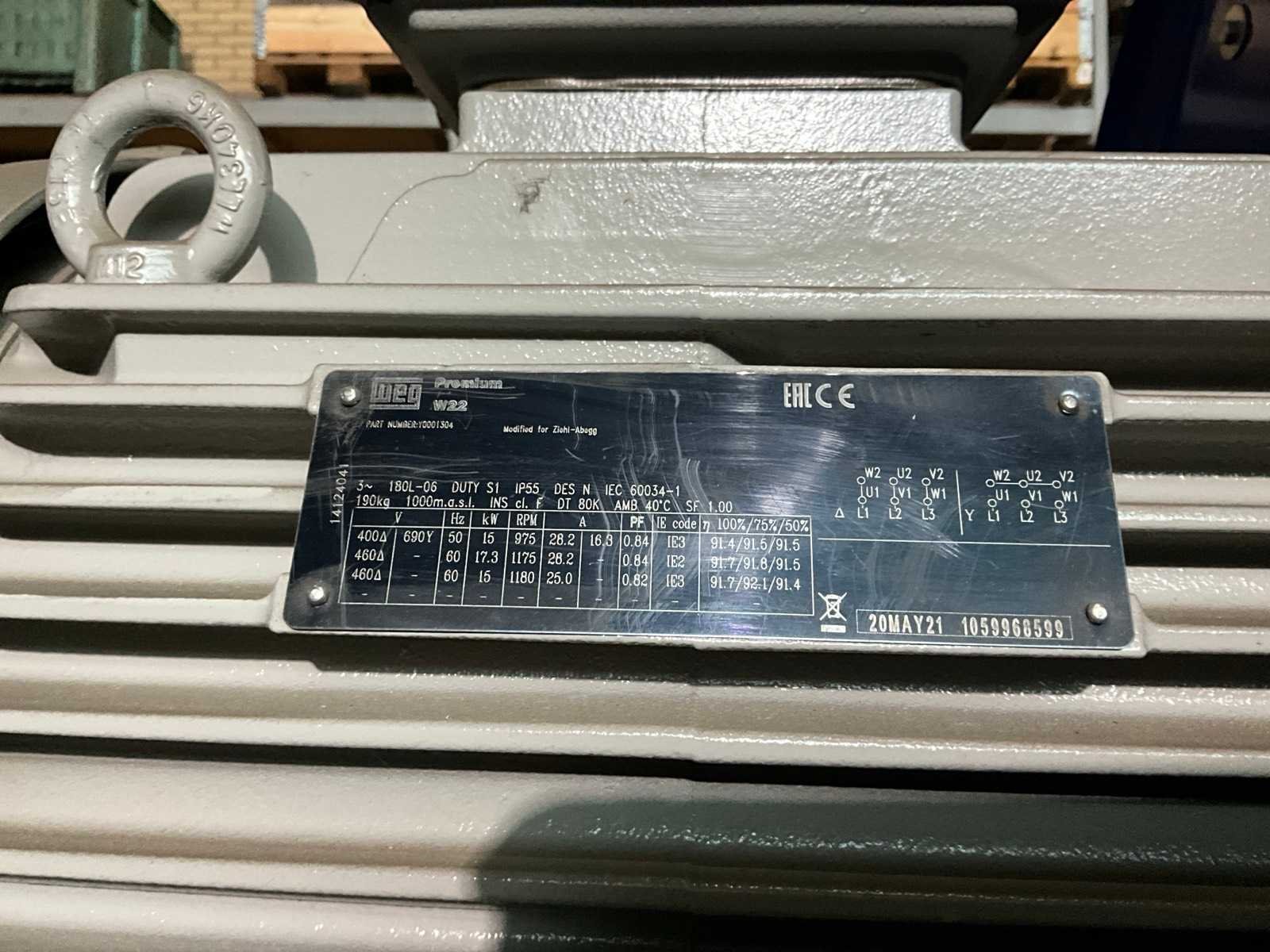 Flens maat circa: 118,5x118,5 cm, 1230 rpm, 400/690V, vermogen: 15 kW Merk: Zielh-Abegg Product type: ER90I-6DN.M7.1R Gewicht: 381kg Lengte: 130cm Hoogte: 123cm